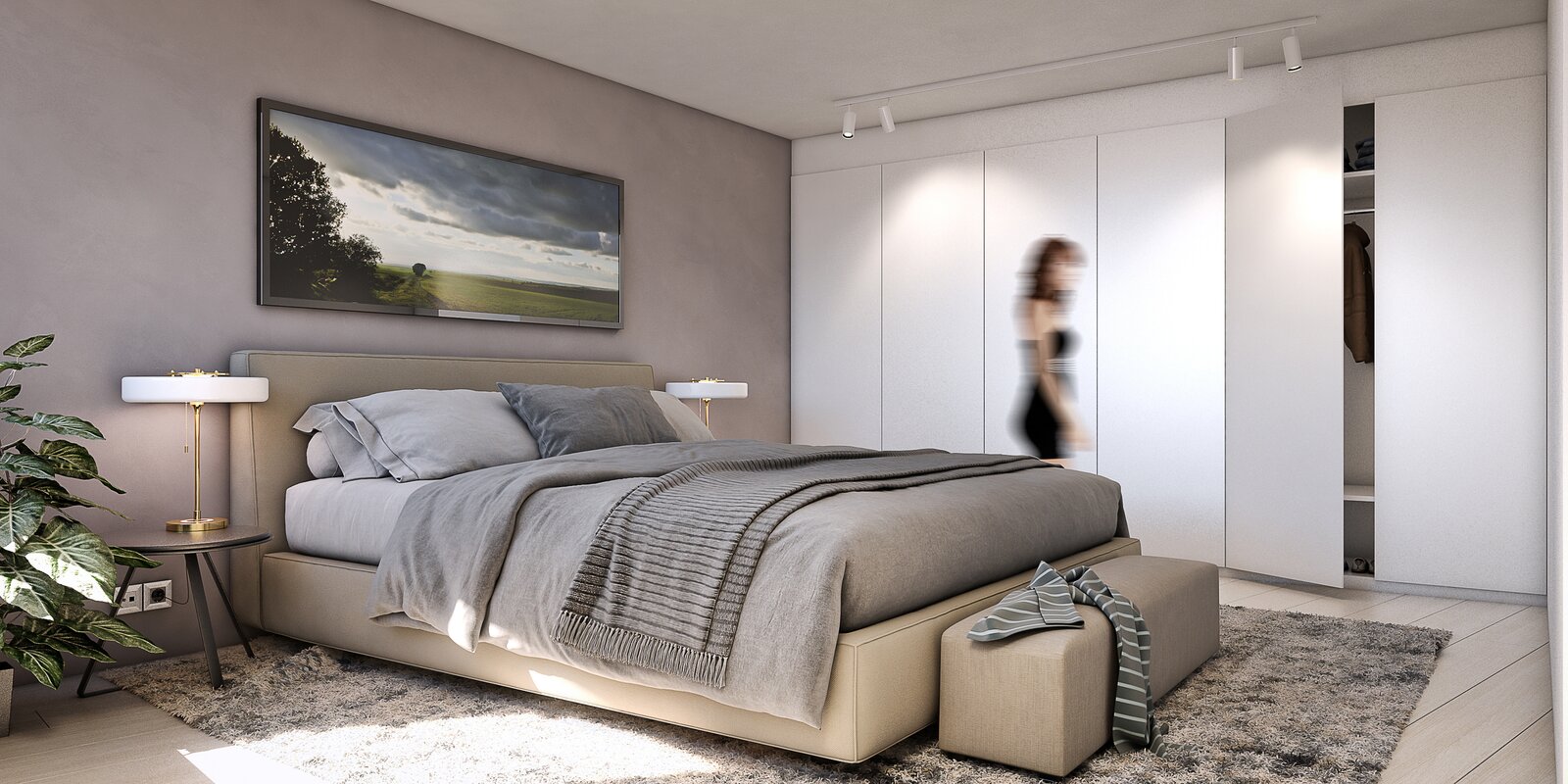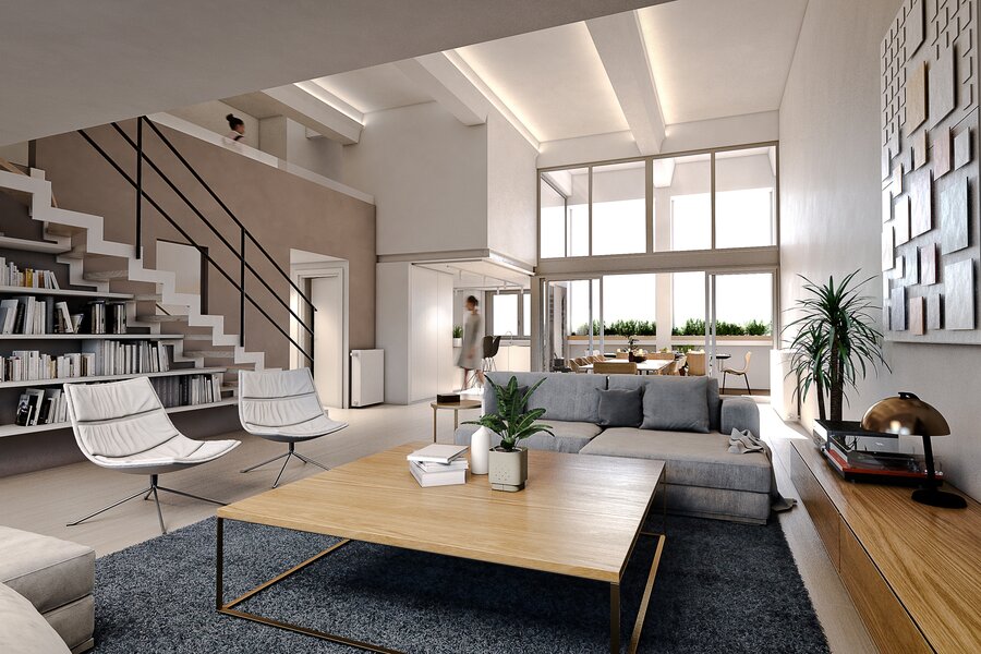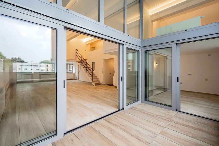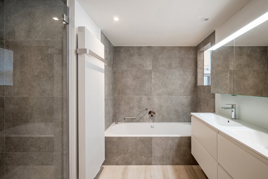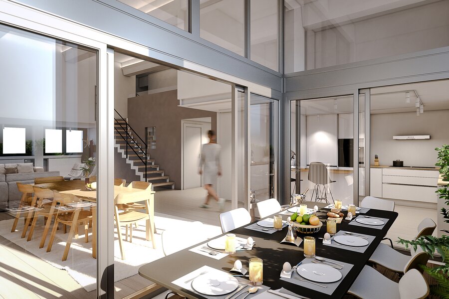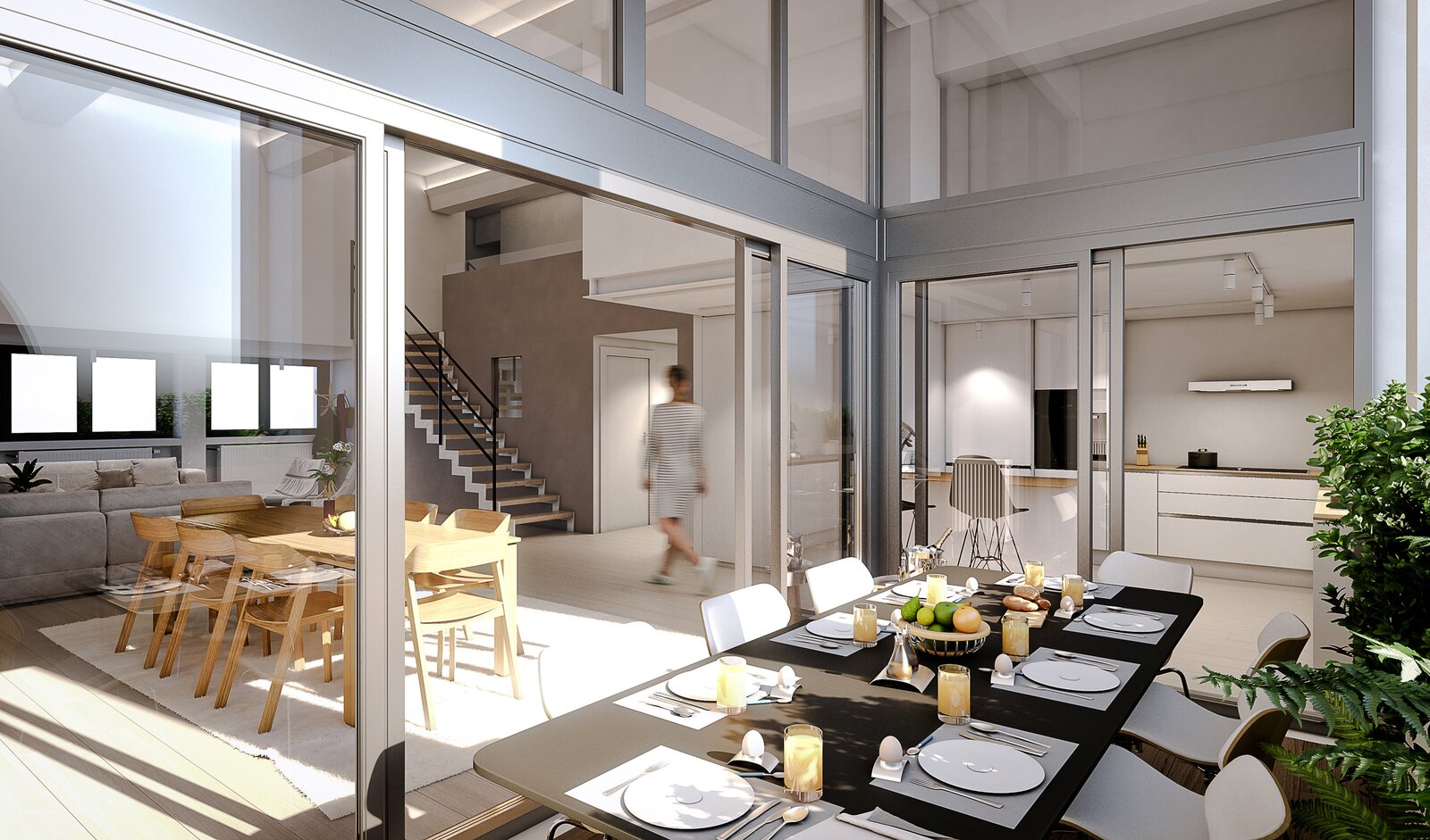 Lot 7 bestaat uit een inkomhal met gastentoilet, vestiaire en technische ruimte, een ruime en lichtrijke open woonkamer van ± 80 m² (gedeeltelijke plafondhoogte van ± 5,5 m), een ruimtekeuken (in te richten), allen uitgevend op een mooi terras van ± 13 m², op het westen, op een eiland, en een en-suite hoofdslaapkamer met kleedkamer en complete badkamer. De privétrap brengt ons naar de bovenverdieping, op een mezzanine-kantooroverloop met 3 slaapkamers met eigen badkamer, elk met een eigen doucheruimte, toilet en wasruimte.