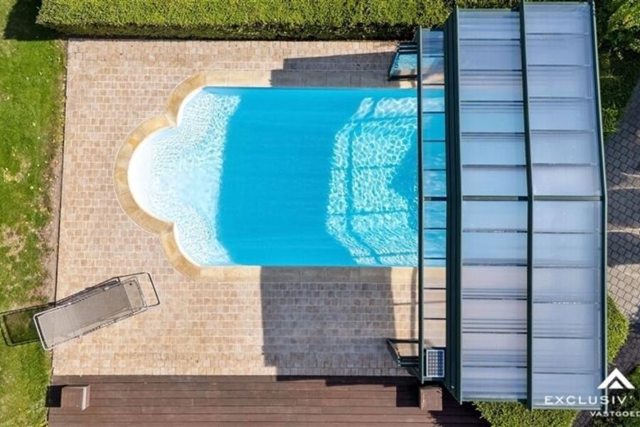 De parkachtige tuin met poolhouse, buitenkeuken, vijver en verwarmd overdekt zwembad biedt ultieme privacy en ontspanning. Er is een garage voor 2 wagens alsook een volledige kelderverdieping onder het gebouw.
