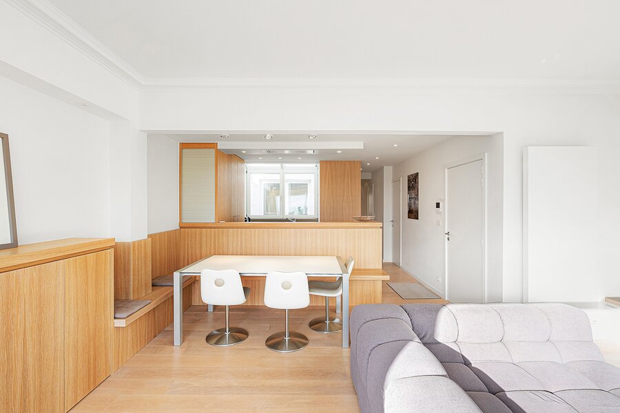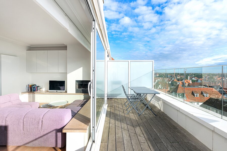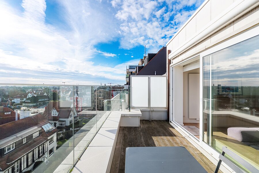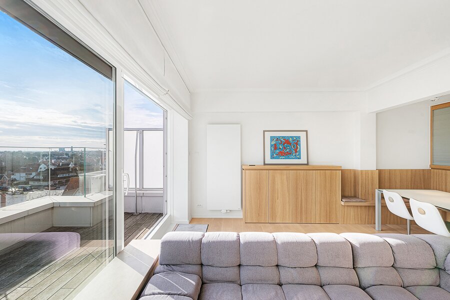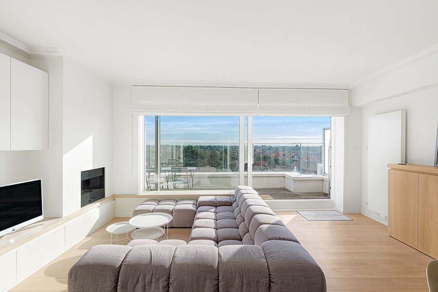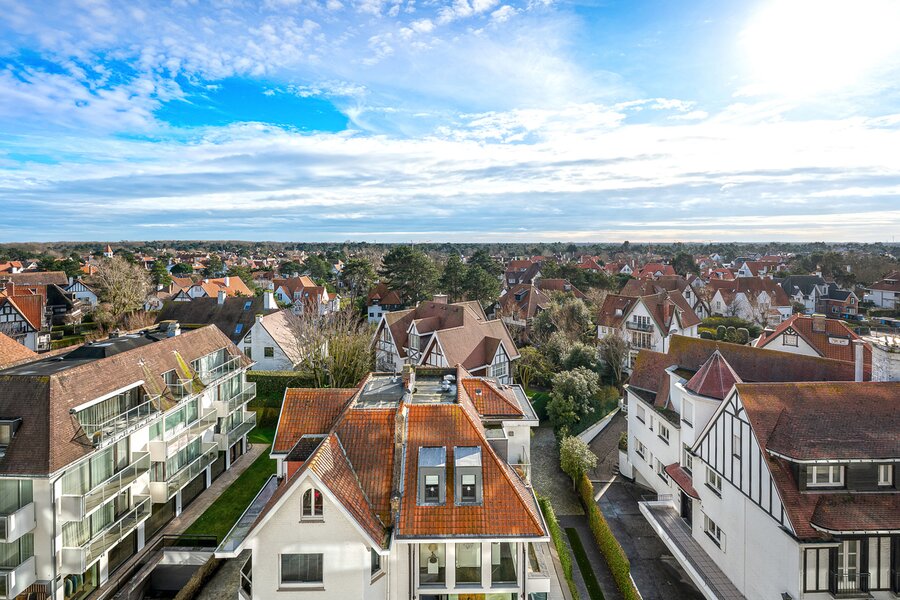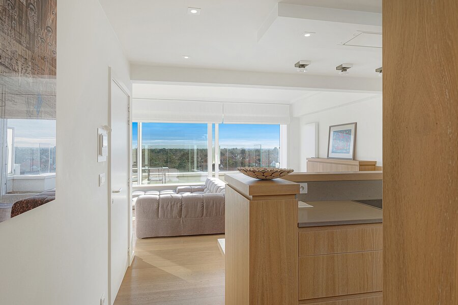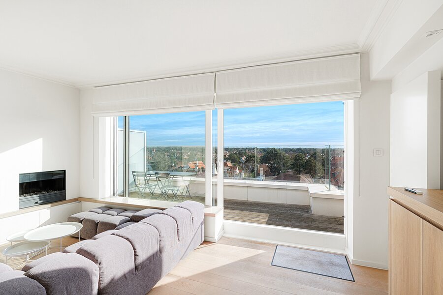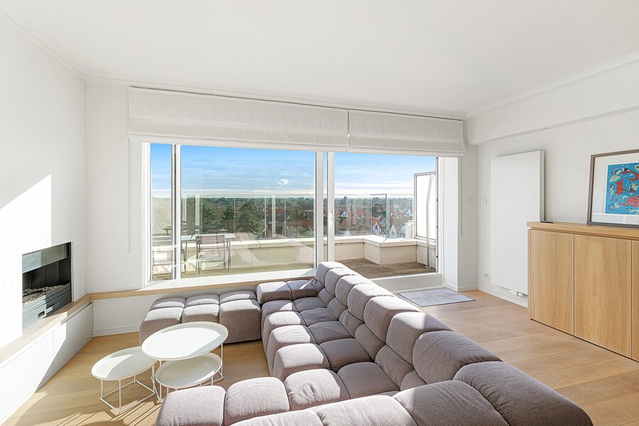 Gezellige penthouse op topligging in het Zoute, tussen de minigolf en het Albertplein, met prachtig open zicht over de villa's. Samenstelling: inkom met vestiaire en gastentoilet. Ruime, zonnige woonkamer met open haard uitgevend op aangenaam zuidgericht terras met panoramisch uitzicht. Ingerichte open keuken, voorzien van alle modern comfort.