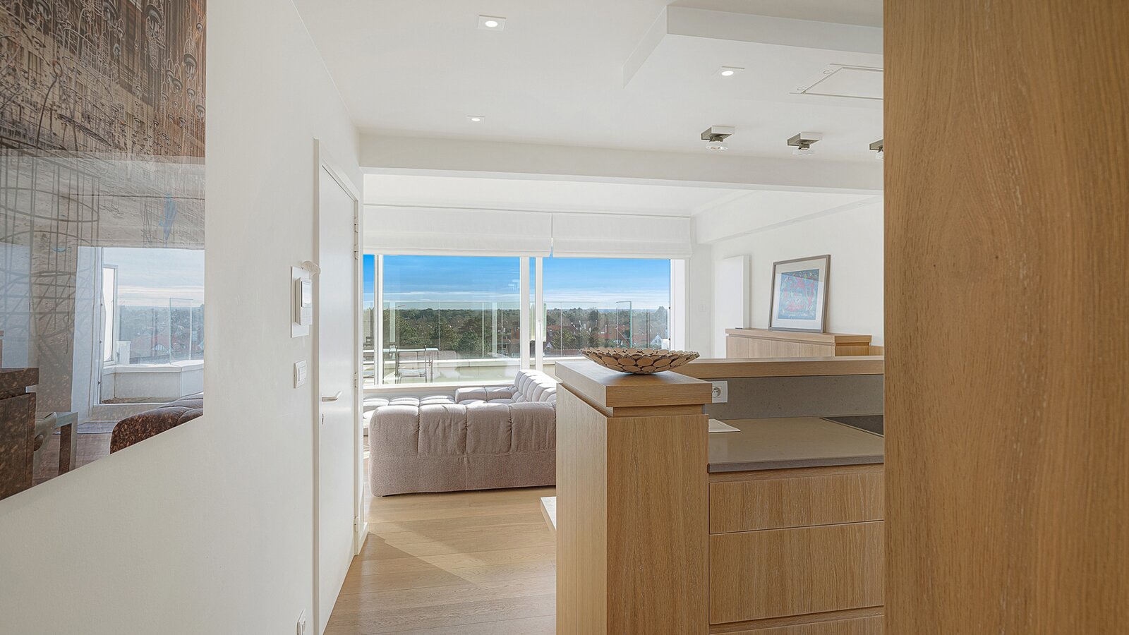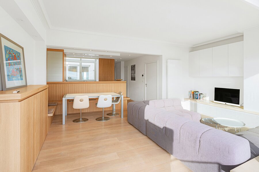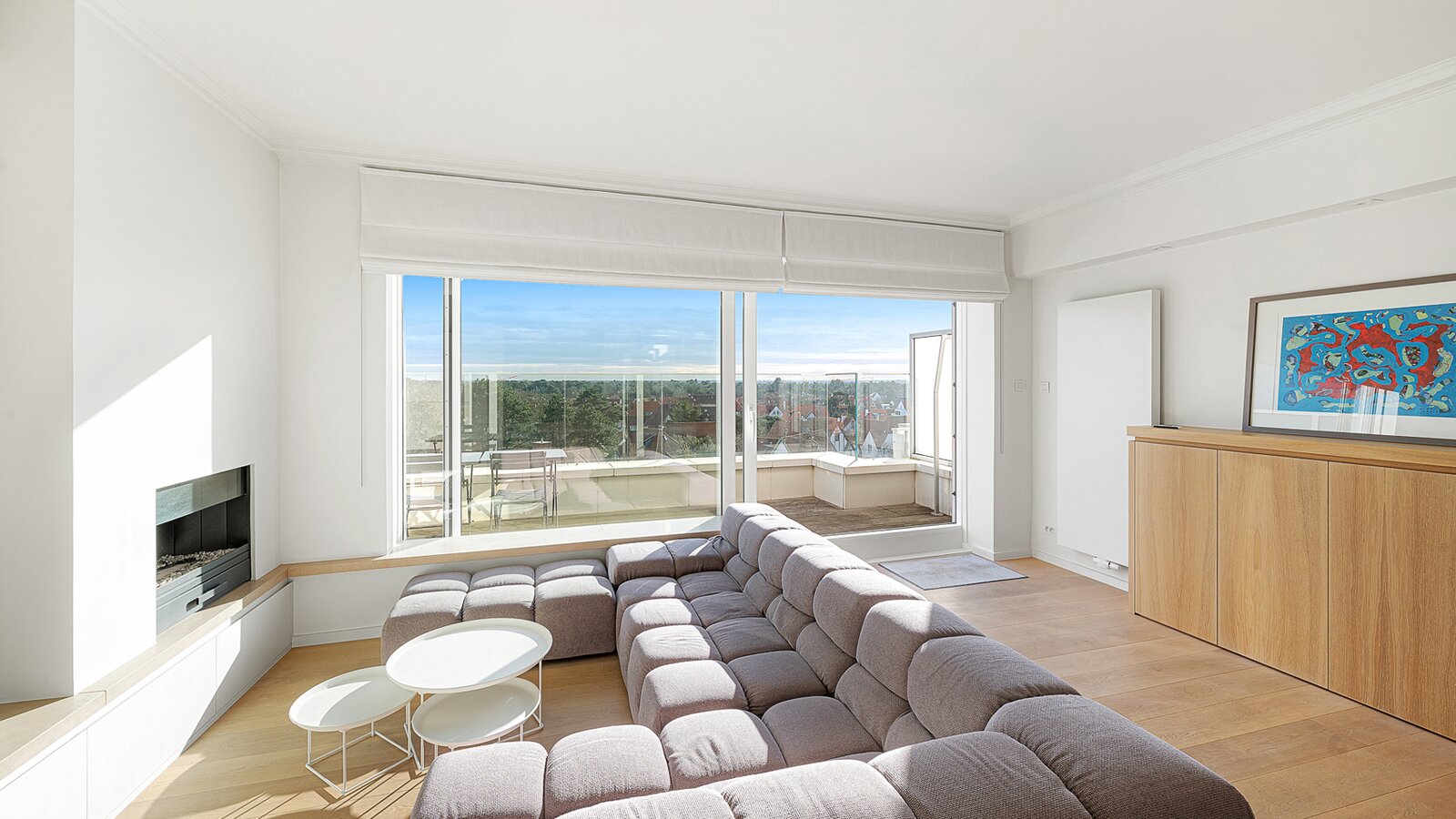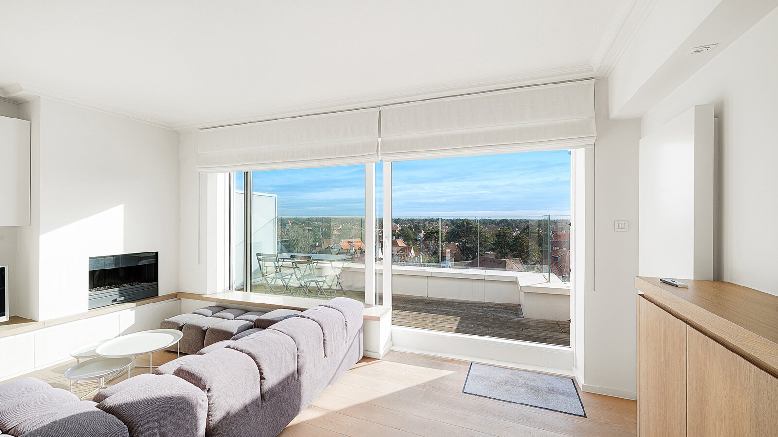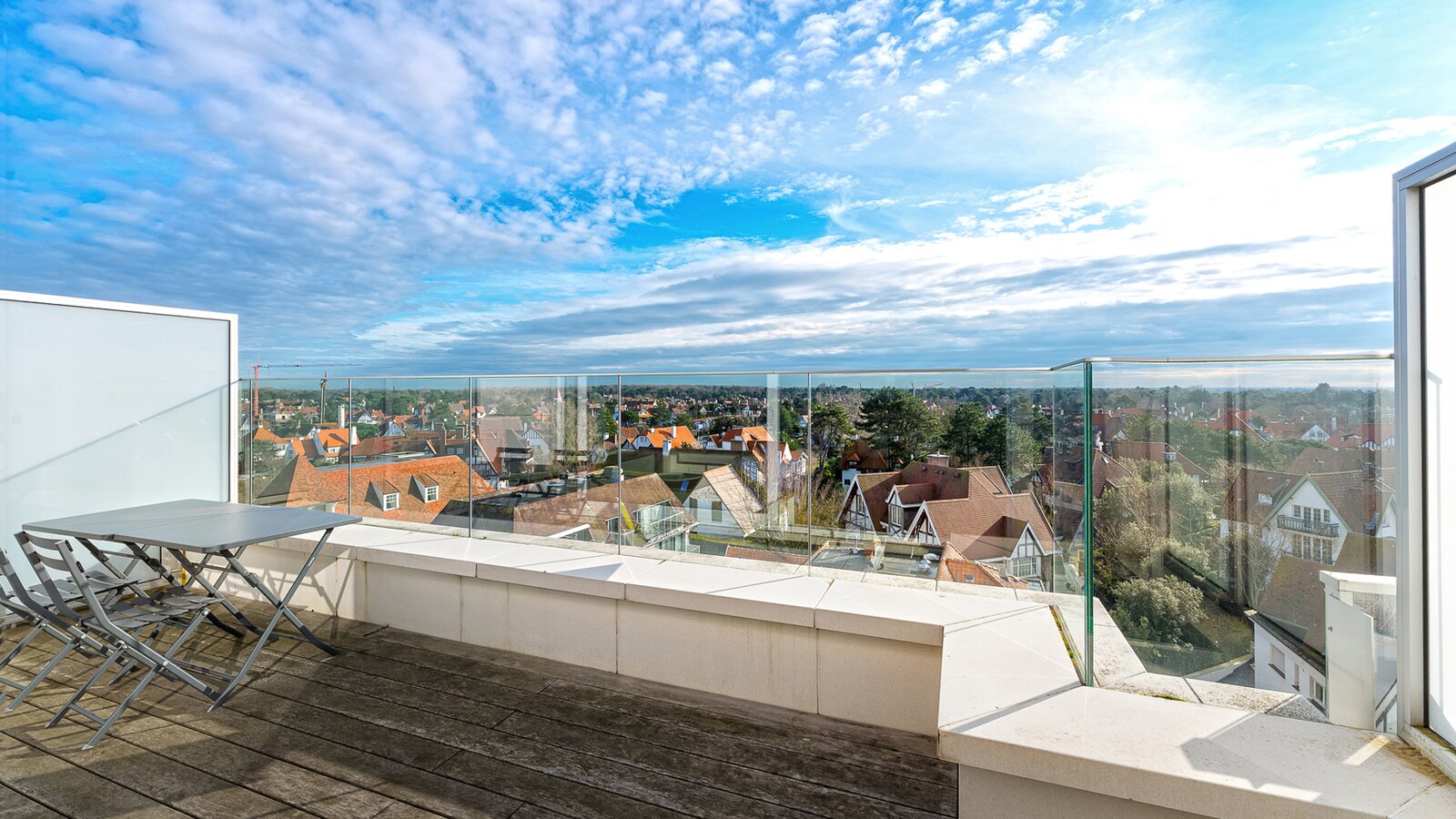 Gezellige penthouse op topligging in het Zoute, tussen de minigolf en het Albertplein, met prachtig open zicht over de villa's. Samenstelling: inkom met vestiaire en gastentoilet. Ruime, zonnige woonkamer met open haard uitgevend op aangenaam zuidgericht terras met panoramisch uitzicht. Ingerichte open keuken, voorzien van alle modern comfort.