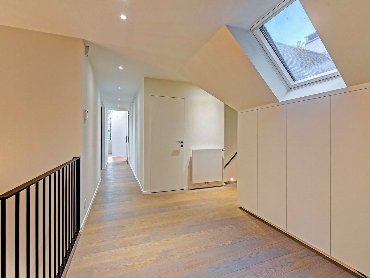 - 1e Verdieping: Nachthal met 3 slaapkamers en 2 bureauruimtes (5 slaapkamers mogelijk), dressing, 3 luxueuze badkamers, extra toilet. Garage voor 2 wagens.