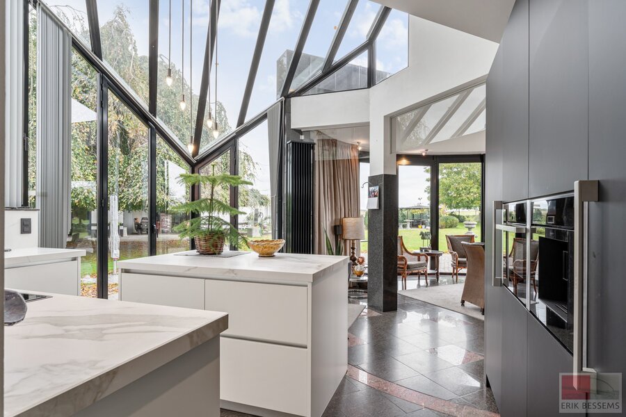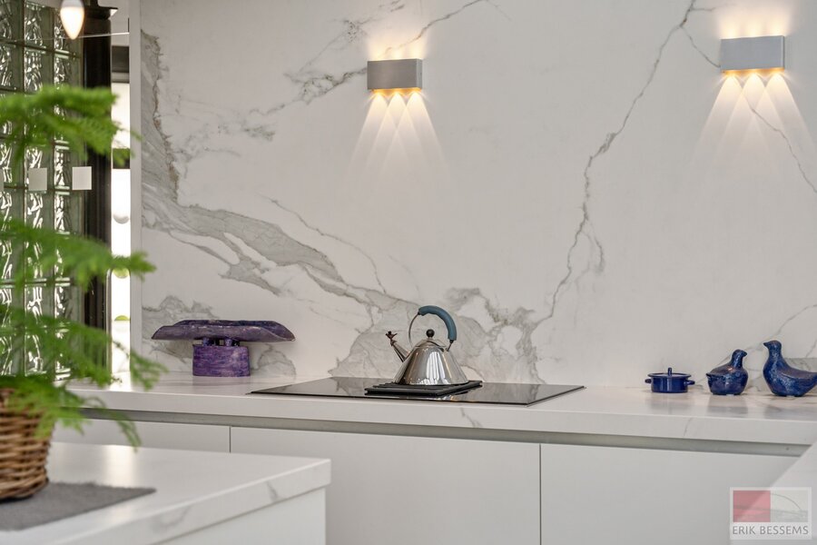 - Luxueuze lichtrijke keuken uitgerust met 4-pit keramisch vuur (Neff), vaatwasser (Bosch), inbouwkoffiemachine (Neff) en combi-oven, frigo en een keukeneiland bekleed met keramisch werkblad;