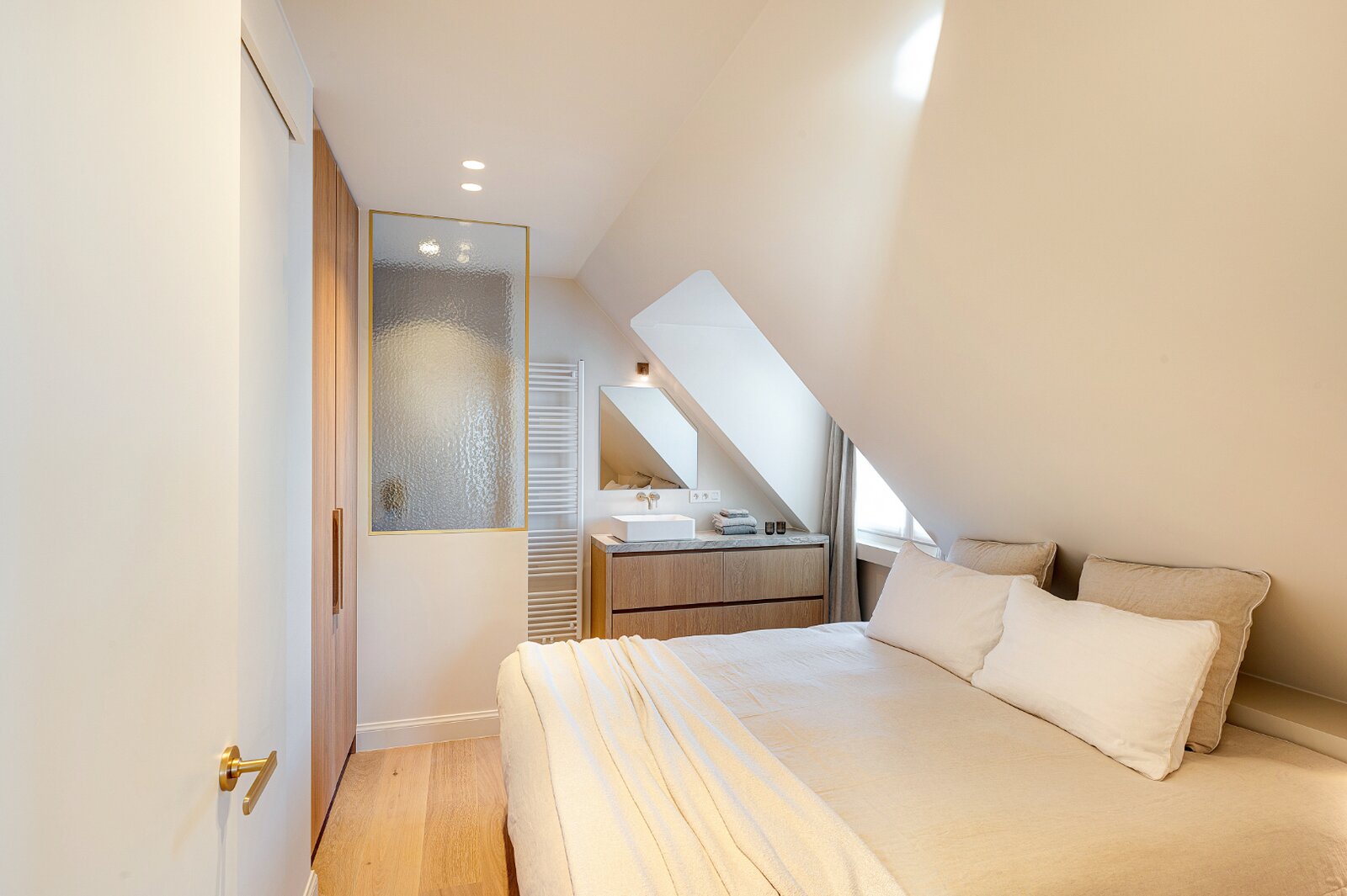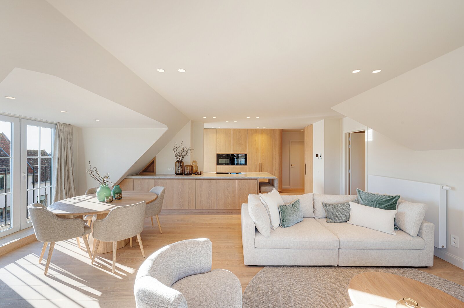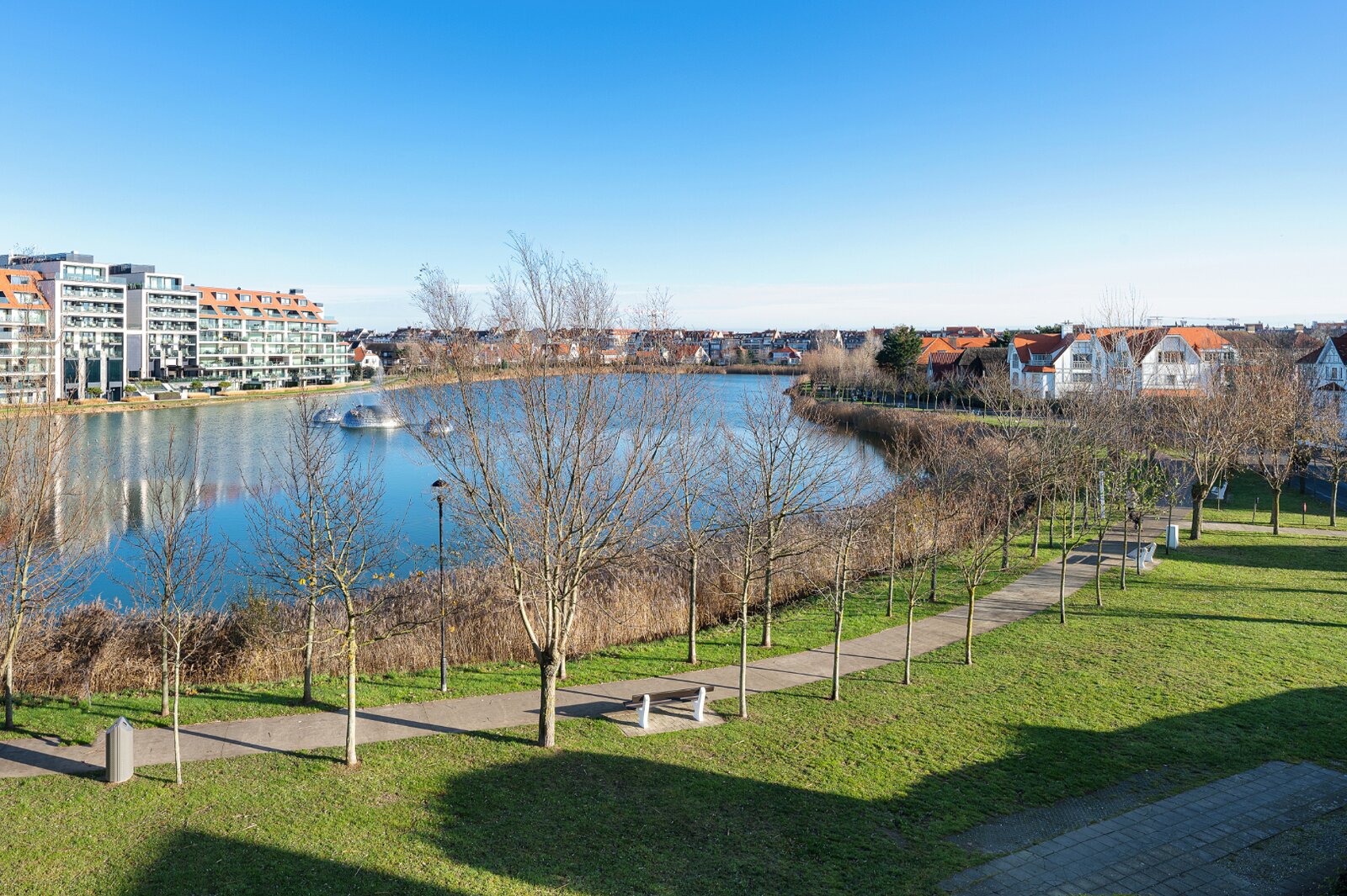Inkom met vestiaire en gastentoilet. Open keuken waarbij het kookeiland met onbtijthoek centraal staat. Tal van inbouwkasten aan het eiland, afgewerkt met natuursteen werkblad. De keuken is uitgerust met inbouwtoestellen van Miele (oven, microgolfoven, frigo, keramische kookplaat met ingebouwde dampkap). Salon met eetplaats goed voor zeker 6 personen. Het appartement telt drie comfortabele slaapkamers, waarvan twee beschikken over een eigen douchekamer met lavabomeubel. Alle kamers hebben vrij uitzicht op het meer dan wel op de villa's. Wasmachine en droogkast aanwezig. Tot slot is er de mogelijkheid om een garagebox aan te kopen op het gelijkvloers van het gebouw. Ruime fietsenstalling en private berging inbegrepen. Het aanwezige meubilair en inrichting (Scapa Home) zijn inbegrepen in de vraagprijs.