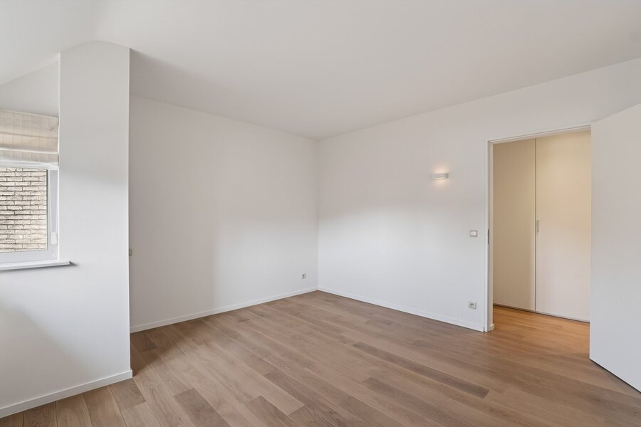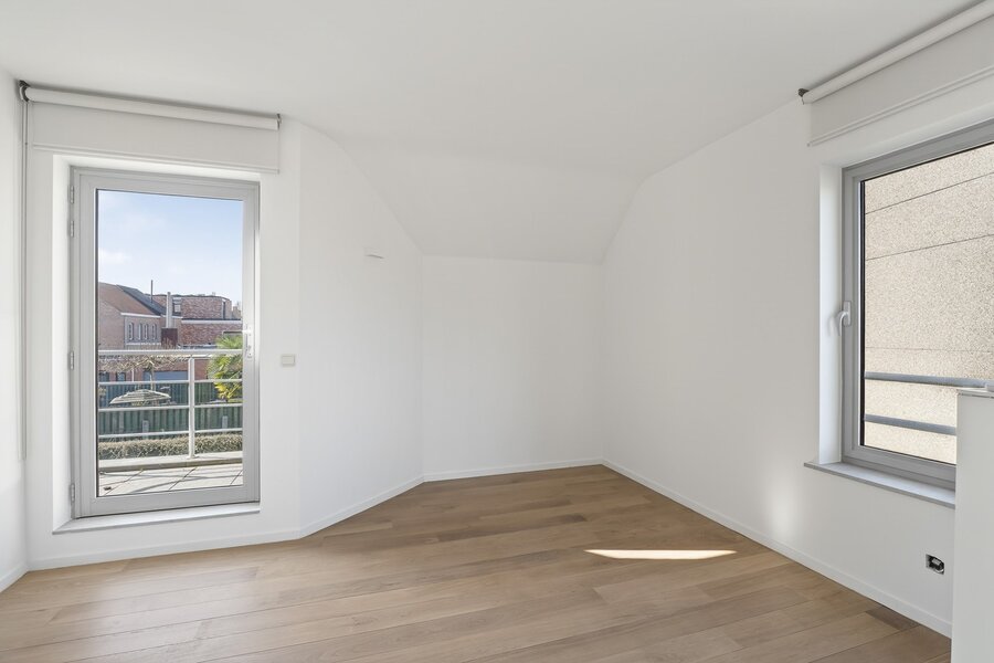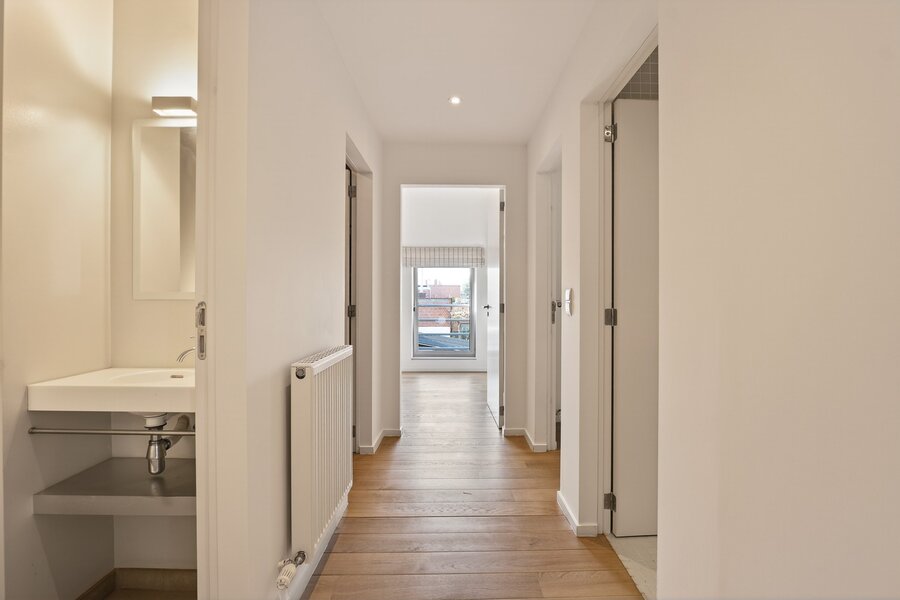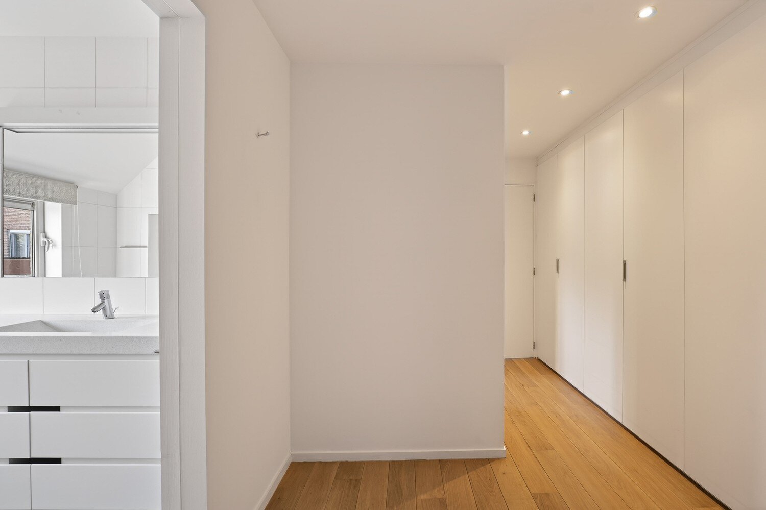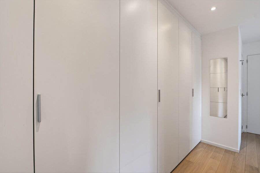 Aan de andere zijde van het appartement bevinden zich de slaapkamers. De hoofdslaapkamer is bereikbaar via een verzorgde dressing, die evenens toegang biedt tot beide badkamers. De grootste badkamer is uitgerust met ligbad, lavabo en toilet, terwijl de tweede badkamer beschikt over een inloopdouche en lavabo. De tweede slaapkamer is voorzien van een ingebouwd bureau.