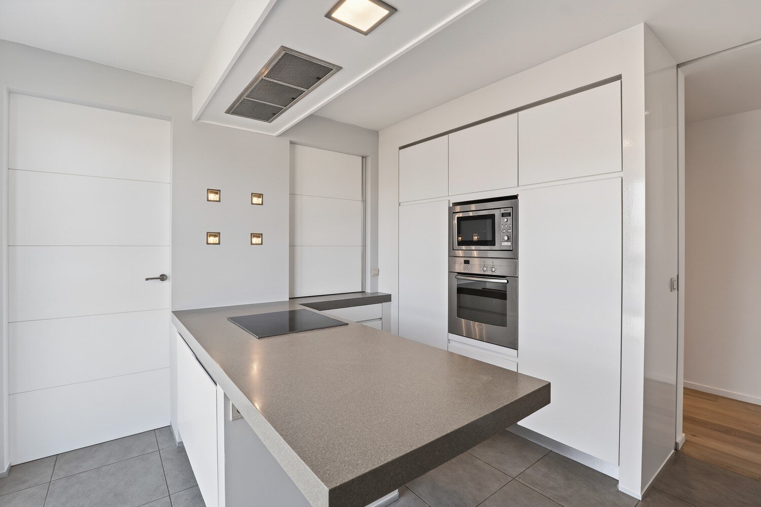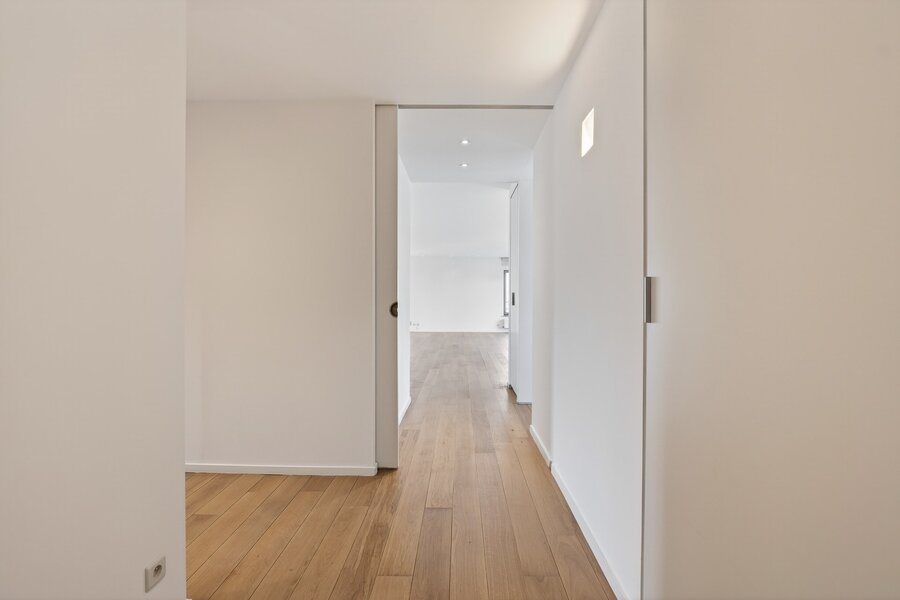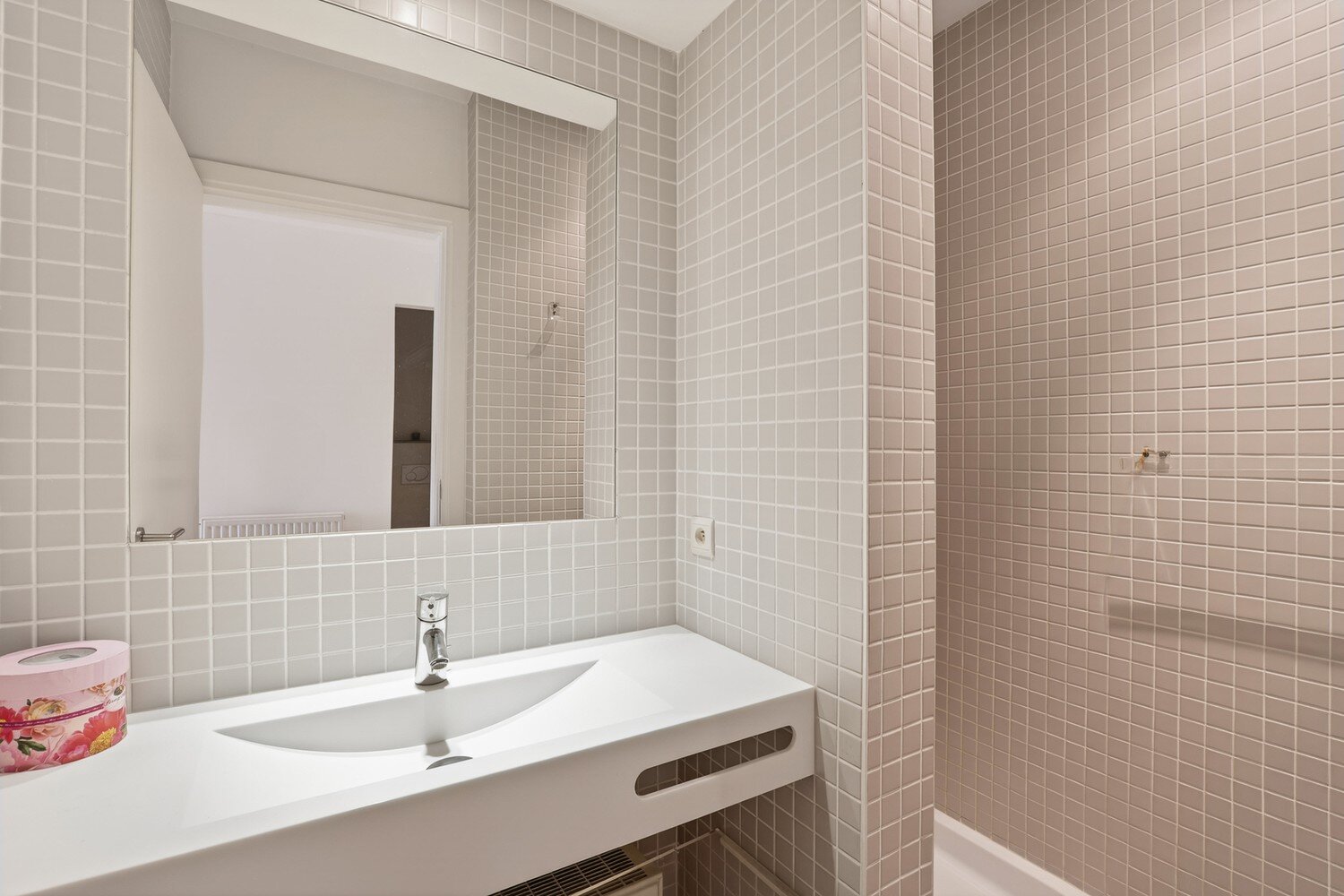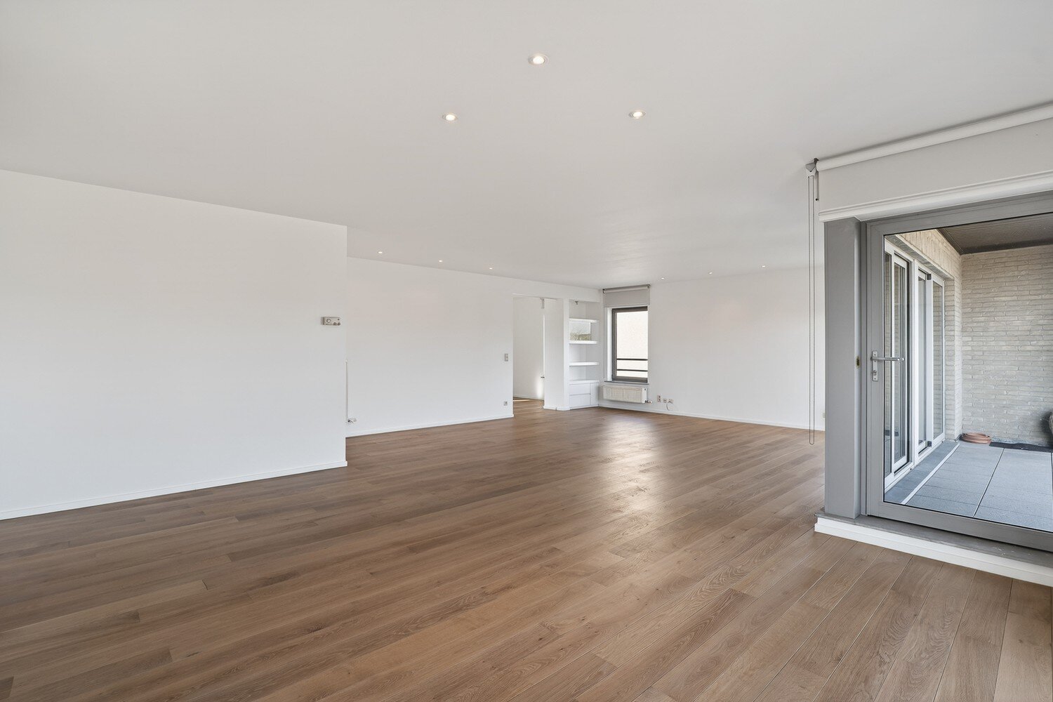 Aan de andere zijde van het appartement bevinden zich de slaapkamers. De hoofdslaapkamer is bereikbaar via een verzorgde dressing, die evenens toegang biedt tot beide badkamers. De grootste badkamer is uitgerust met ligbad, lavabo en toilet, terwijl de tweede badkamer beschikt over een inloopdouche en lavabo. De tweede slaapkamer is voorzien van een ingebouwd bureau.
