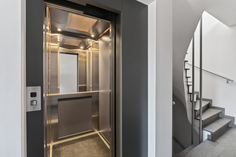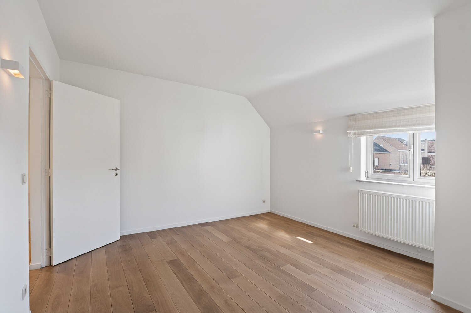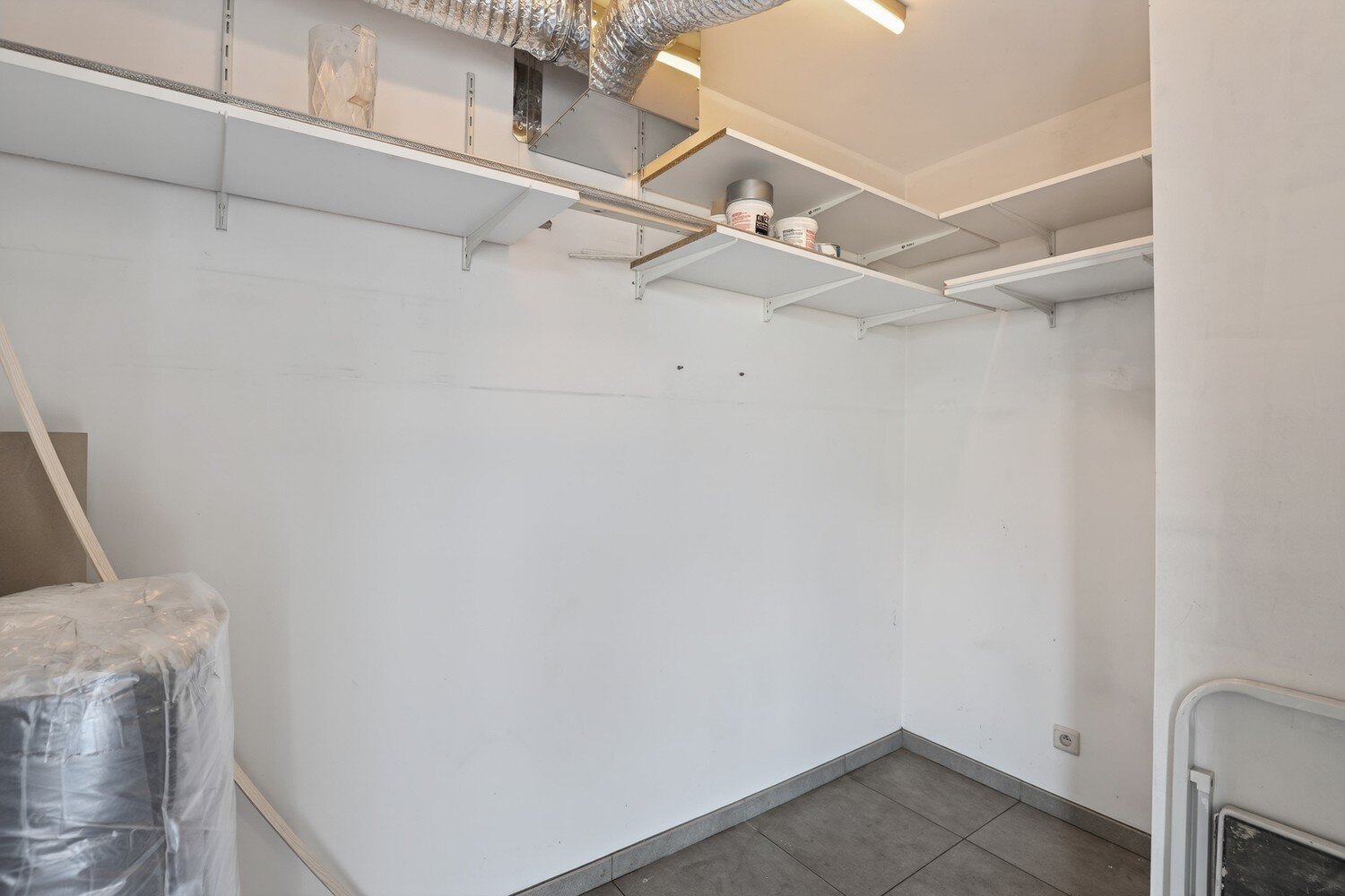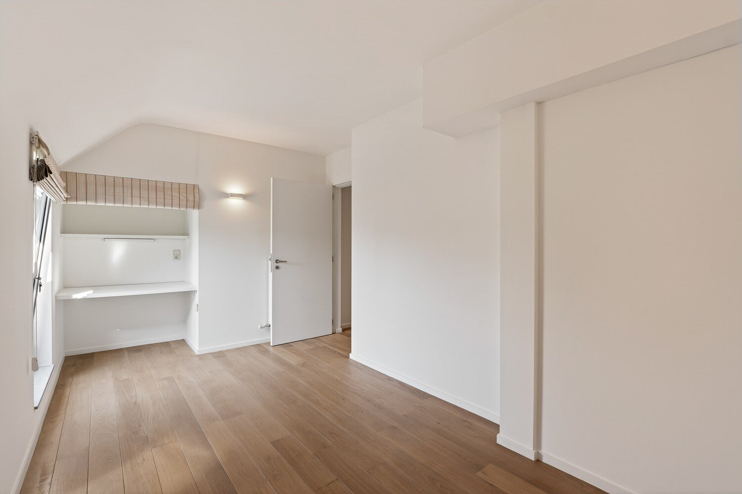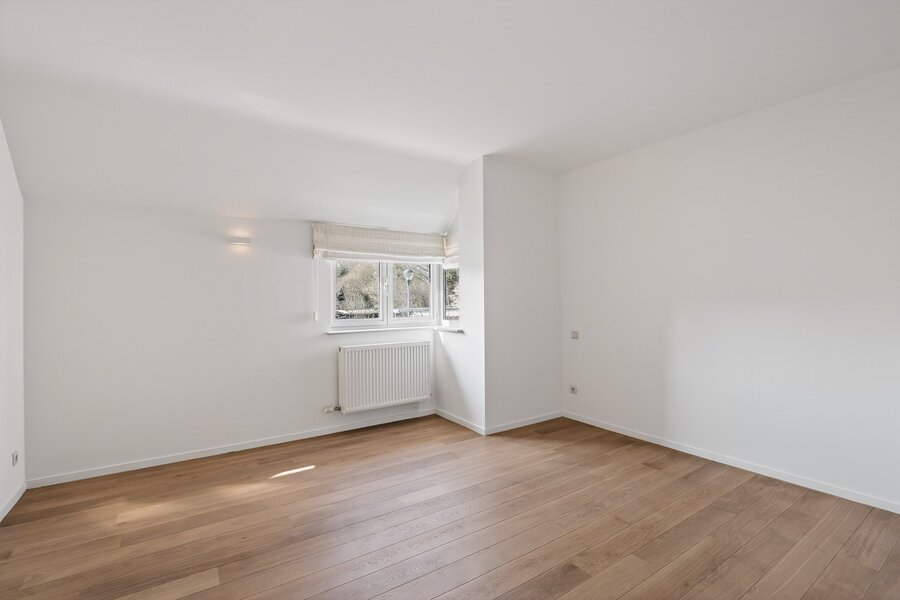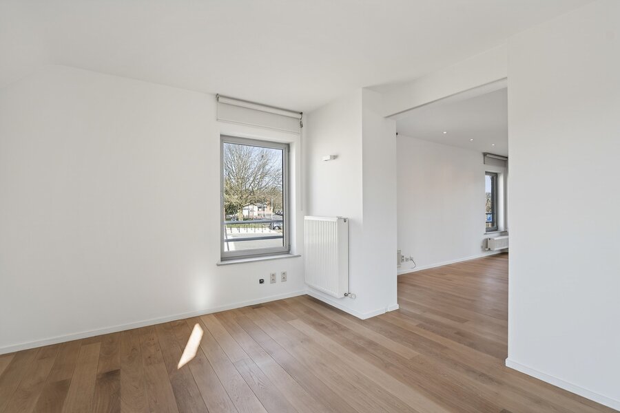 Bij binnenkomst via de hal met vestiaire en apart gastentoilet valt meteen de ruimtelijkheid en het hoogwaardige afwerkingsniveau op. De uitzonderlijk ruime woonkamer baadt in het licht en biedt toegang tot het overdekte terras, de volledig ingerichte keuken en een bureauruimte, die afgesloten kan worden met een schuifdeur. Vanuit het bureau is er toegang tot het tweede terras. De keuken sluit aan op een van de praktische bergingen.