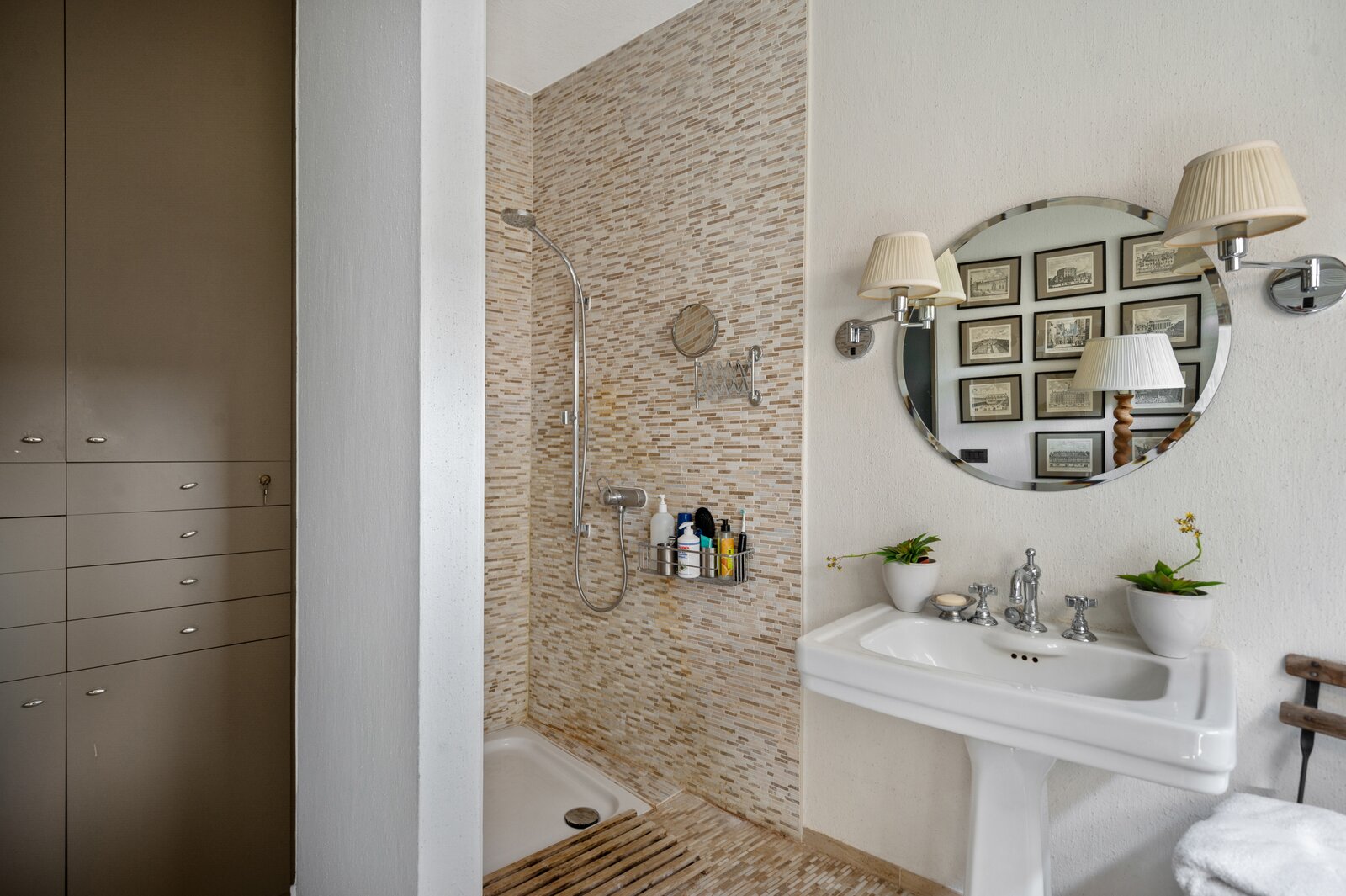 De lichte badkamer - met ligbad, inloopdouche en een stijlvolle wastafel - is een oase van rust.