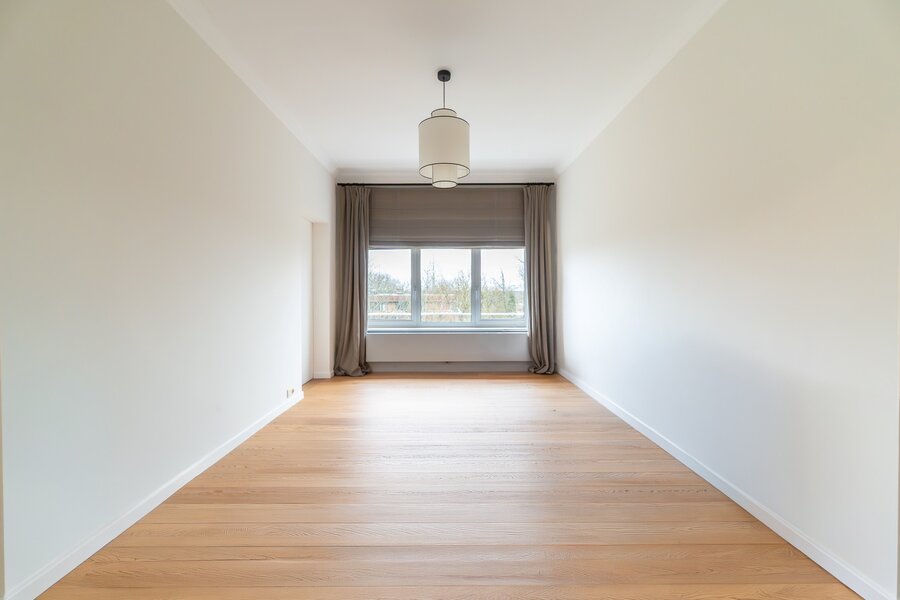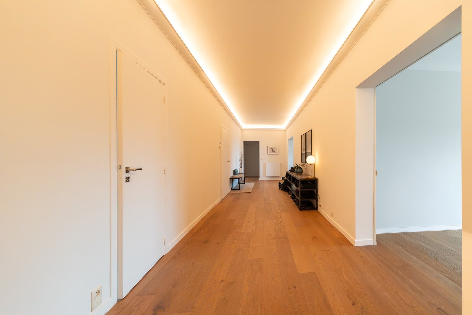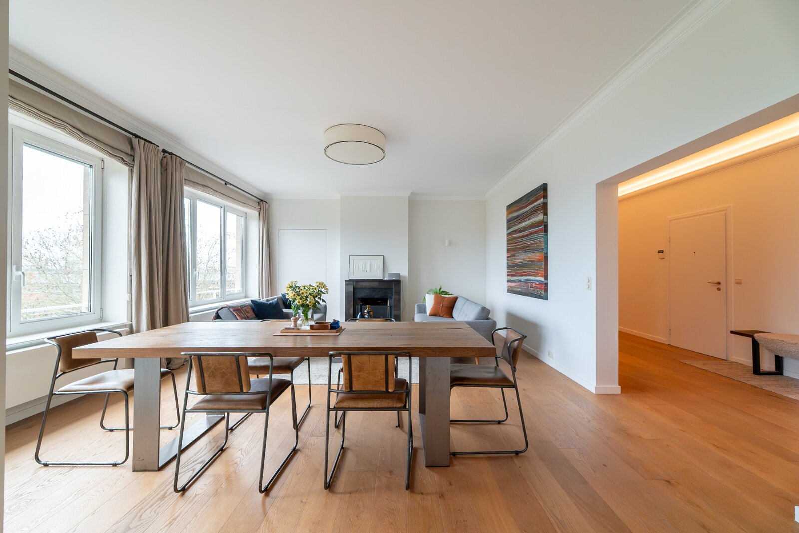 Het appartement opent op een ruime centrale inkomhal met gastenvestiaire, die op harmonieuze wijze zowel de ontvangstruimten als het nachtgedeelte ontsluit. De bijzonder lichtrijke leefruimte biedt directe toegang tot een terras, terwijl de eetkamer in het verlengde ervan ligt en geniet van een open zicht op het park. De afzonderlijke, volledig uitgeruste keuken beschikt over een toegang tot een achterterras en een aangrenzende wasruimte.
