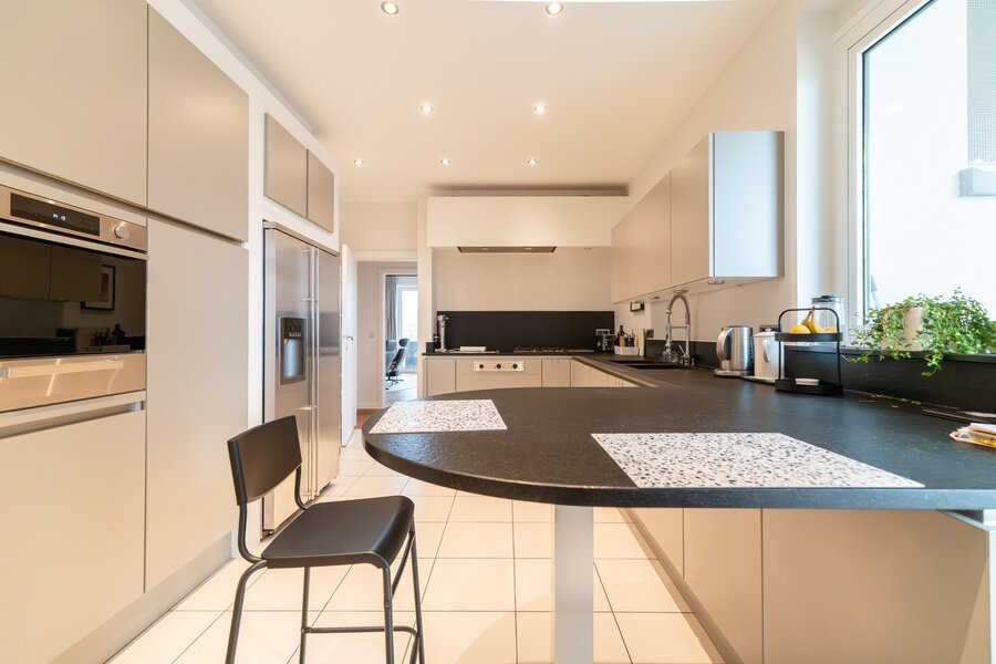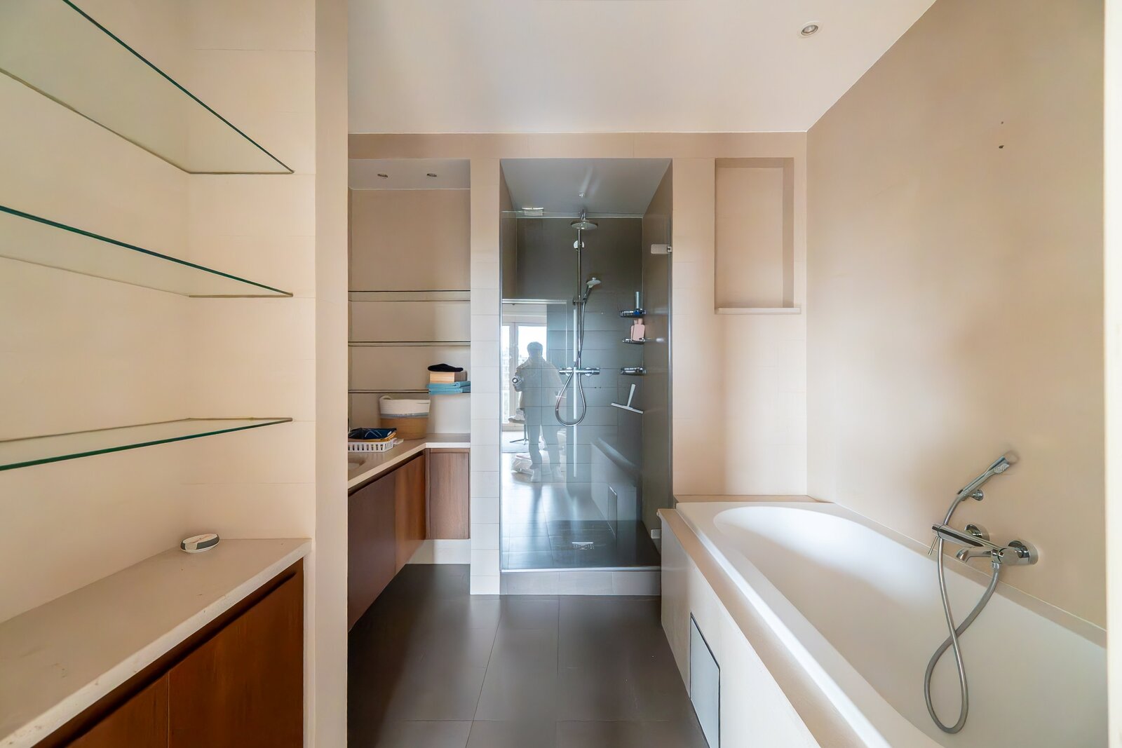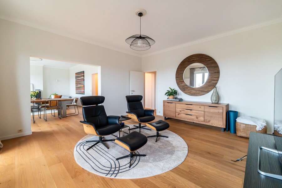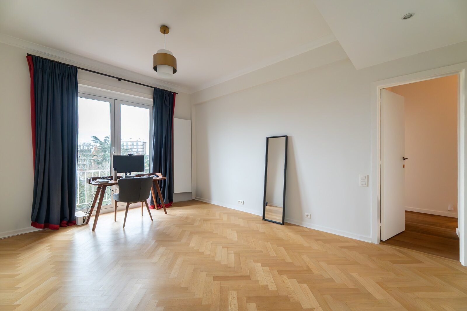 Het appartement opent op een ruime centrale inkomhal met gastenvestiaire, die op harmonieuze wijze zowel de ontvangstruimten als het nachtgedeelte ontsluit. De bijzonder lichtrijke leefruimte biedt directe toegang tot een terras, terwijl de eetkamer in het verlengde ervan ligt en geniet van een open zicht op het park. De afzonderlijke, volledig uitgeruste keuken beschikt over een toegang tot een achterterras en een aangrenzende wasruimte.