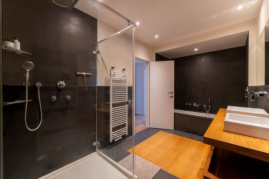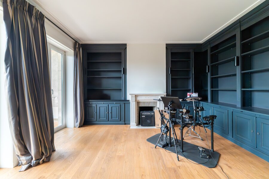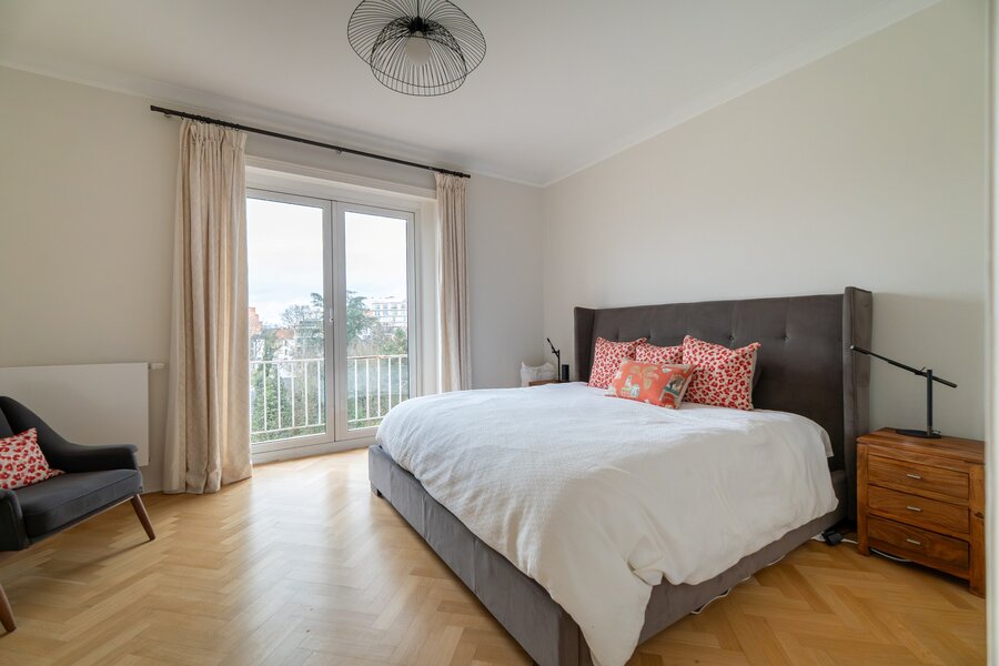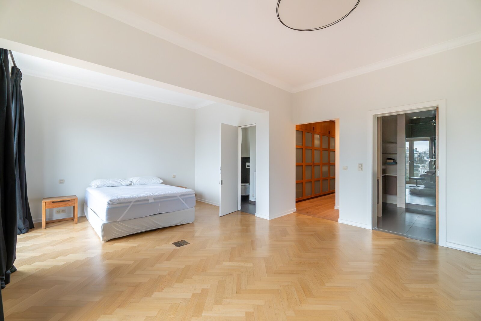 De hoofdnachthal, voorzien van talrijke ingebouwde kasten, geeft toegang tot twee slaapkamers, een dressing en een volledige badkamer met ligbad, douche en toilet. Aan de andere zijde van het appartement bevindt zich een bijkomende ruime slaapkamer met eigen badkamer met douche en een apart toilet. Een ruim bureau en een extra slaapkamer vervolledigen de indeling van dit appartement met uitzonderlijke proporties.