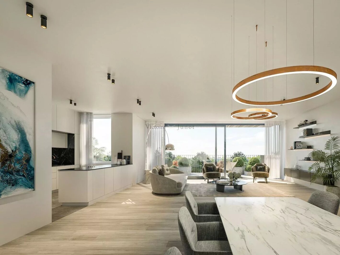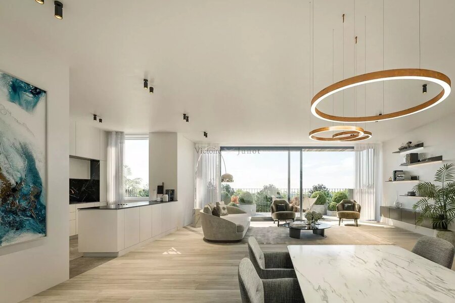 Victoire biedt je een prachtig gloednieuw appartement van 107 m² met 2 slaapkamers op de begane grond van dit nieuwe gebouw "LES EMERAUDES", met 2 privétuinen van 152,5 en 40,5 m². Mooie leefruimte + superuitgeruste open keuken die uitgeeft op het terras en de tuin, bijkeuken, grote nachthal met apart toilet.