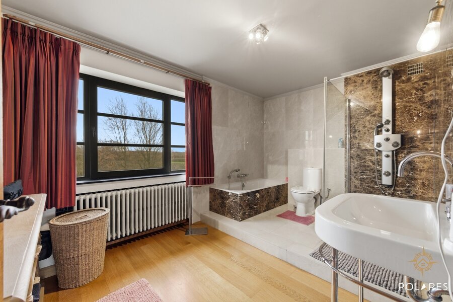 De eerste verdieping ademt ruimte en comfort. Hier bevinden zich vier riante slaapkamers en een aparte dressing die aan al uw opbergwensen voldoet. De stijlvolle badkamer is een baken van rust, compleet ingericht met een dubbele lavabo, een ligbad en een moderne inloopdouche. Extra bergruimte is voorzien in de vorm van een handige bergzolder, en aangezien de woning volledig onderkelderd is, ontbreekt het u nooit aan plaats voor opslag of hobby’s.