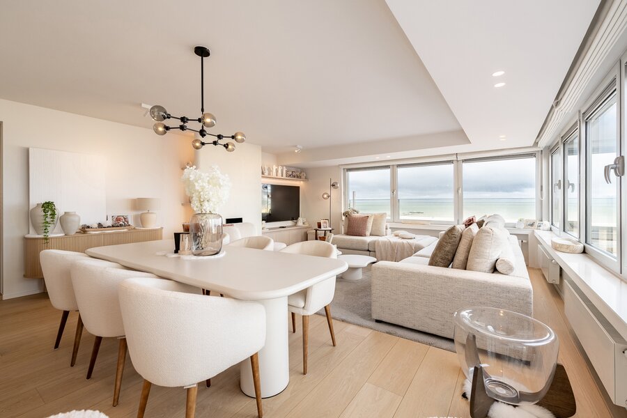 Ruime inkomhal met vestiaire en gastentoilet. Zonnige leefruimte met adembenemend zeezicht en uitzicht op het plein.