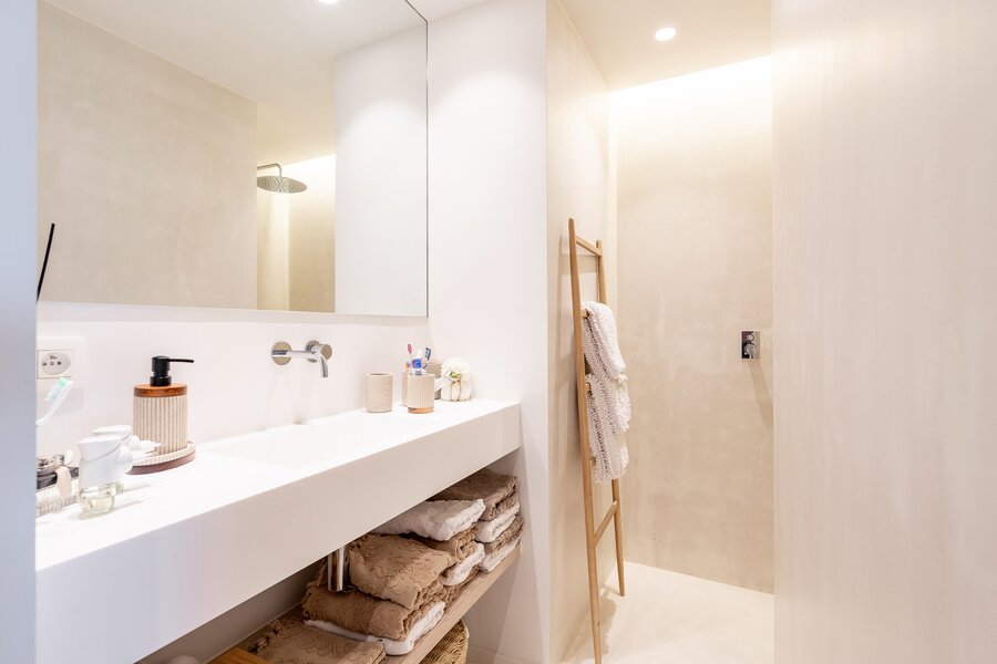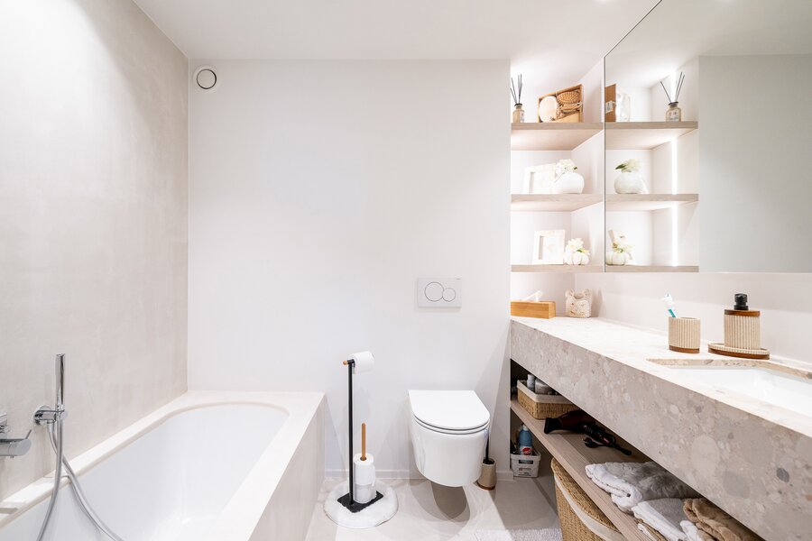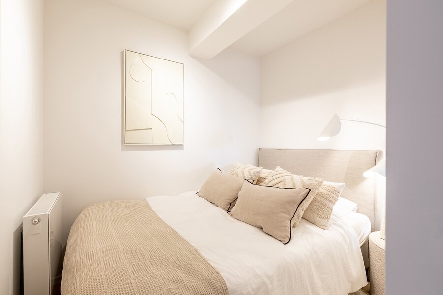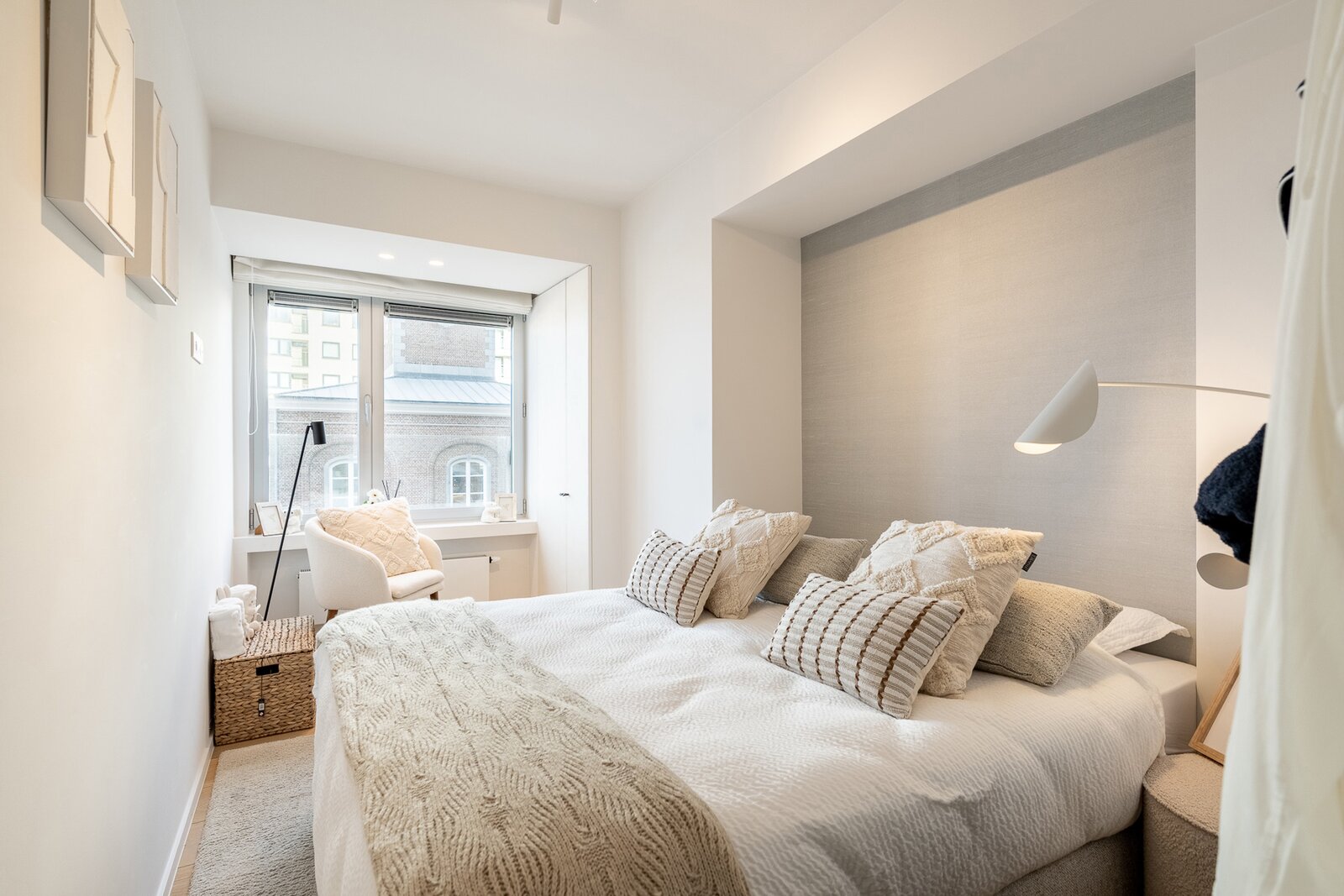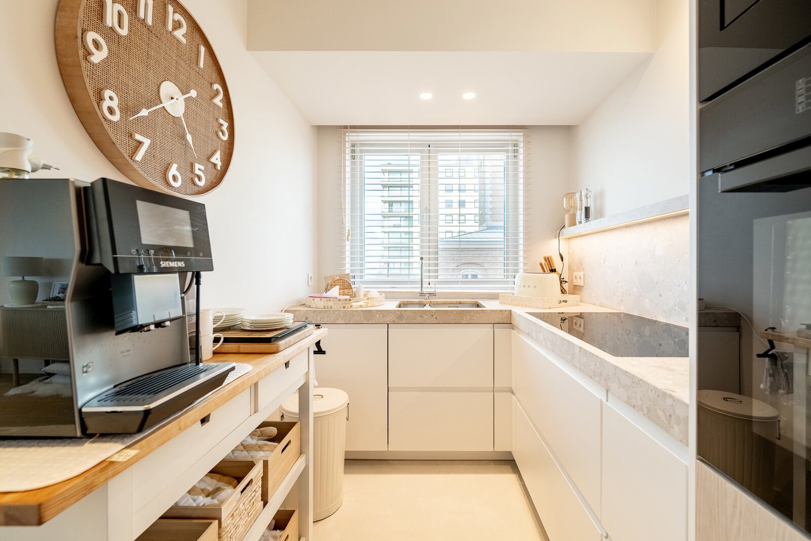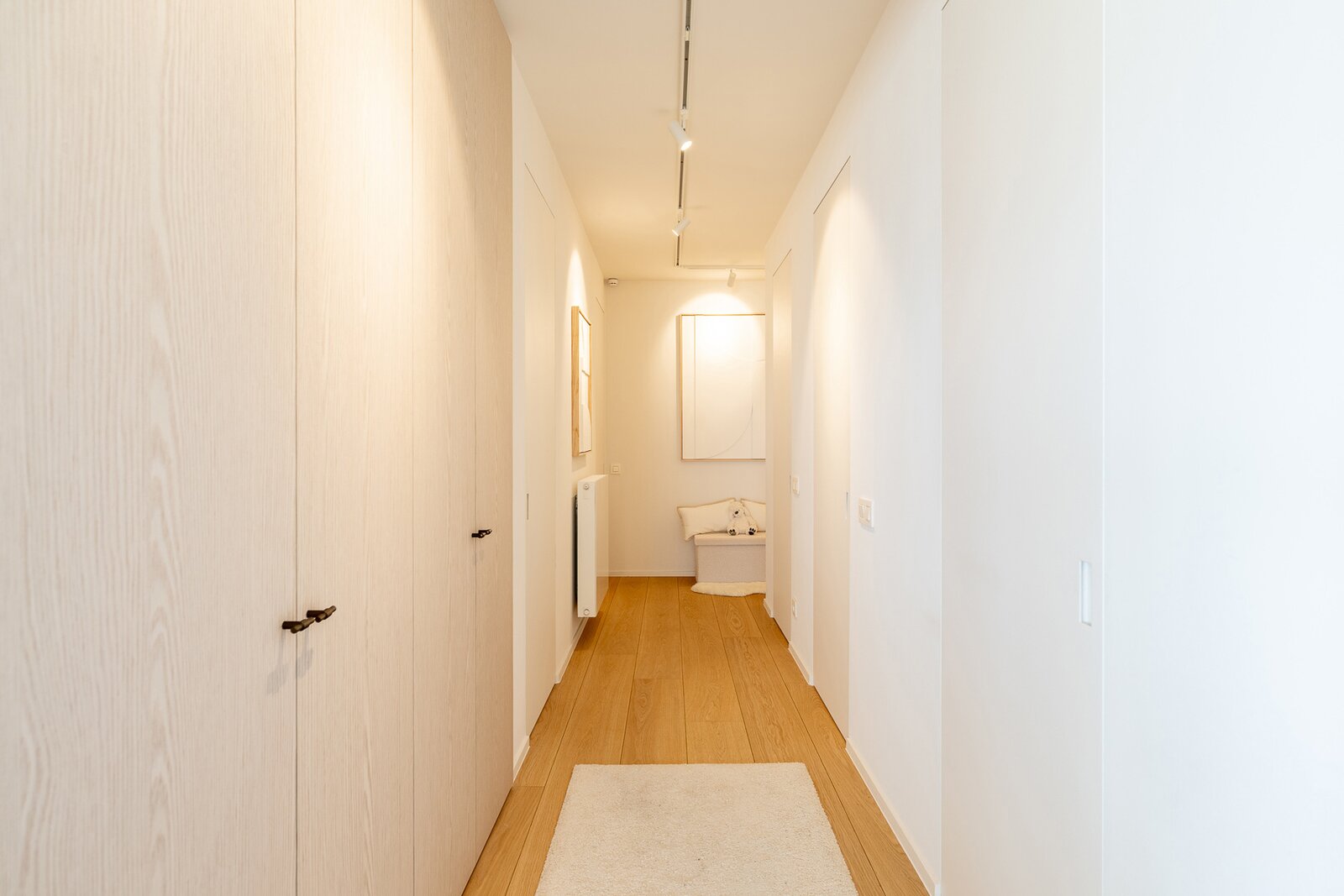 De halfopen, volledig uitgeruste keuken is voorzien van kwalitatieve Miele-toestellen. De master bedroom beschikt over een eigen badkamer met ligbad, dubbele wastafel en toilet.
