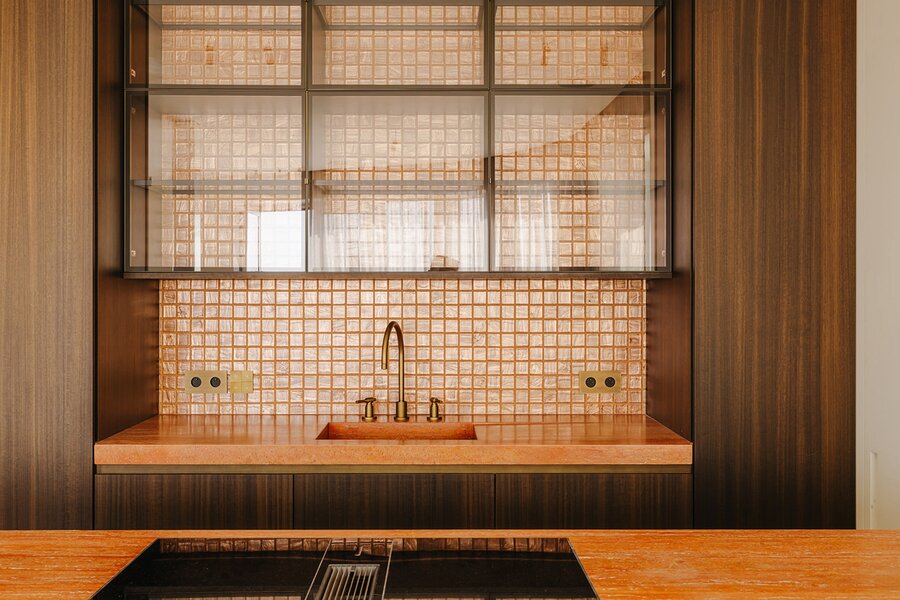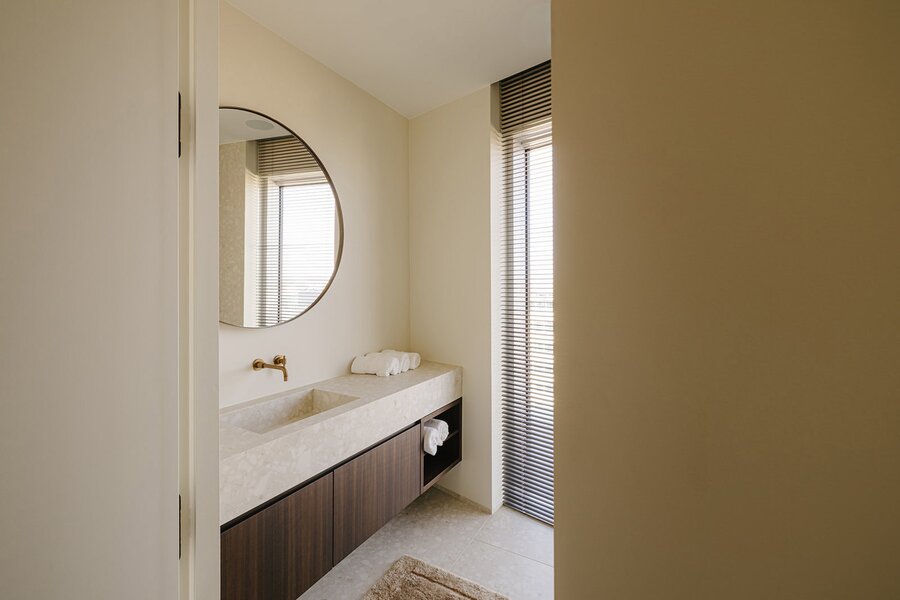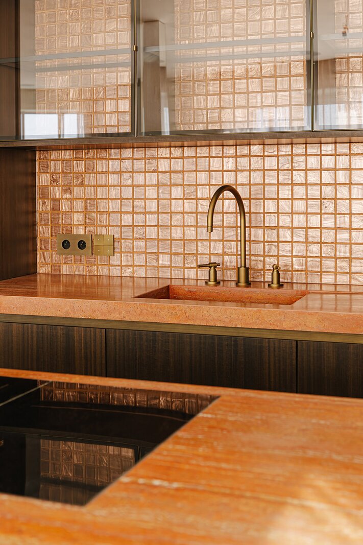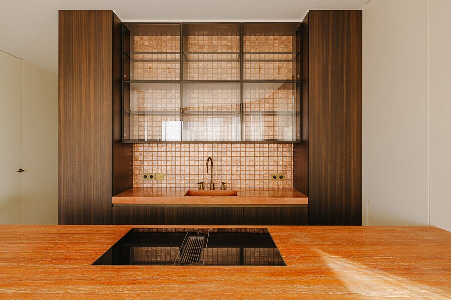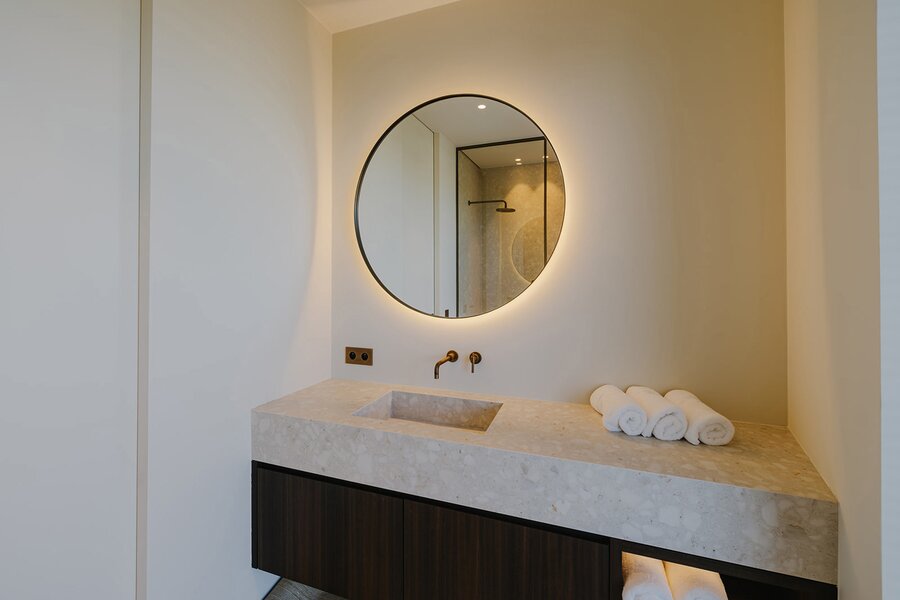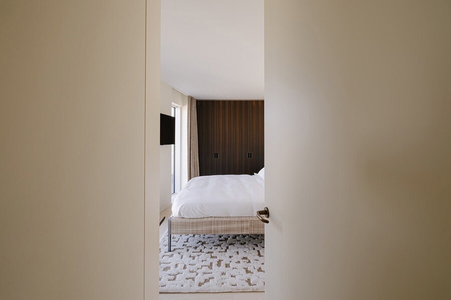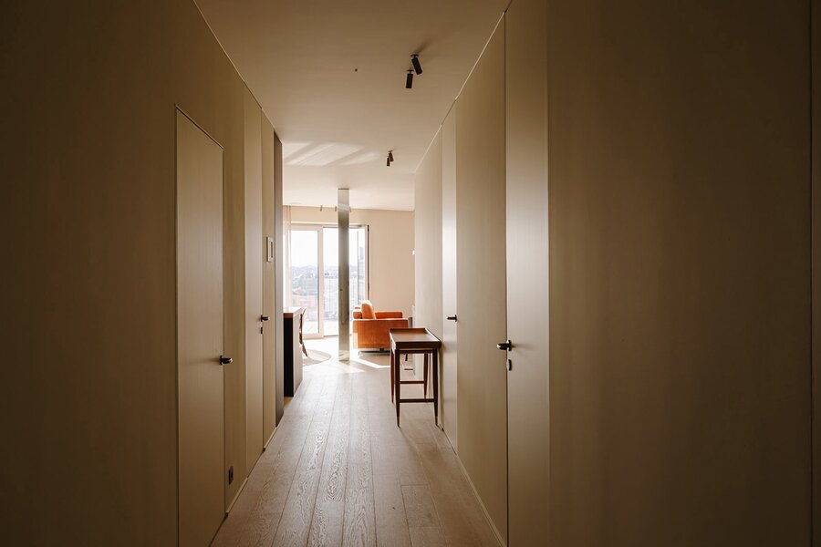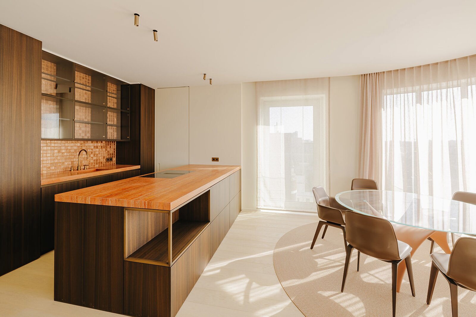 Het appartement beschikt over een ruime inkomhal die uitgeeft op een lichte woonkamer en eetkamer met directe toegang tot het terras dat rond het volledige appartement loopt. De open keuken is geïntegreerd in de leefruimte en wordt aangevuld met een achterkeuken met aansluitende wasruimte.