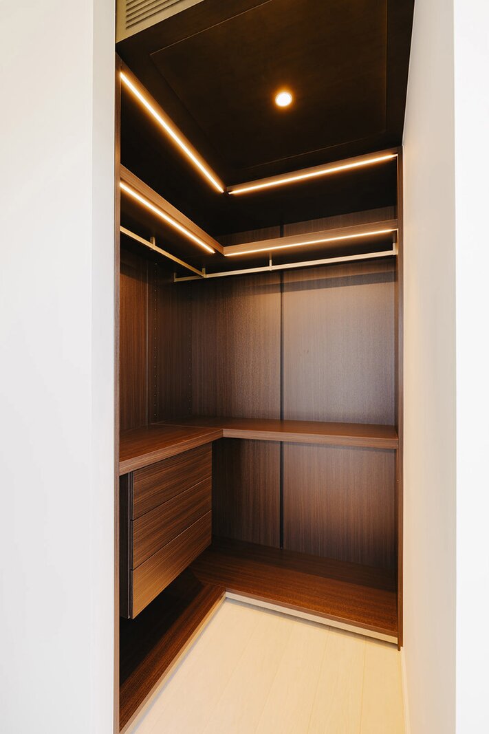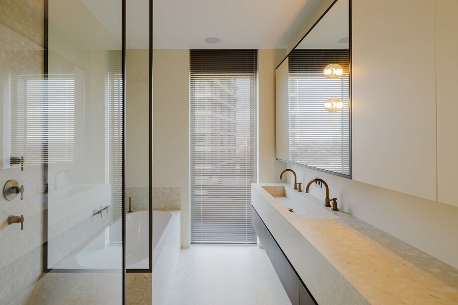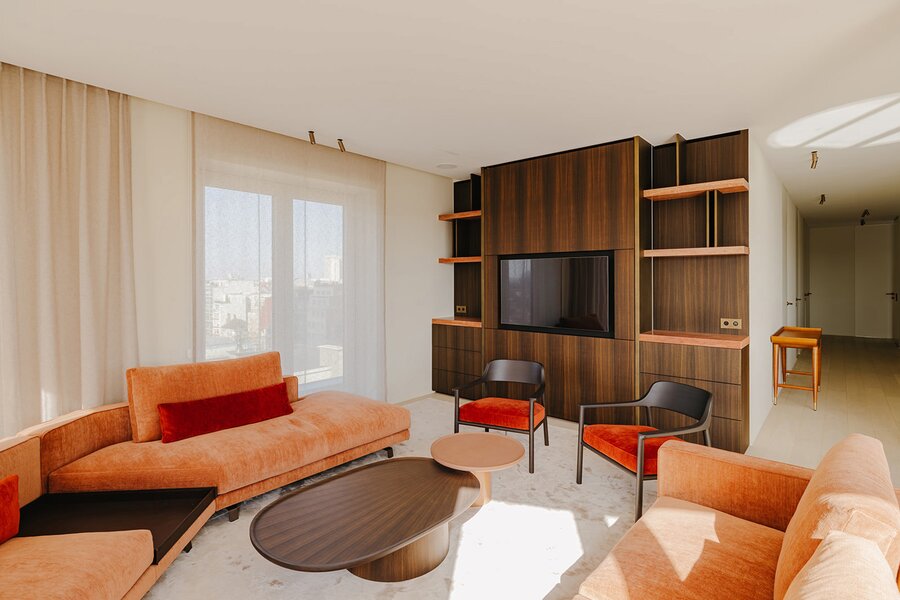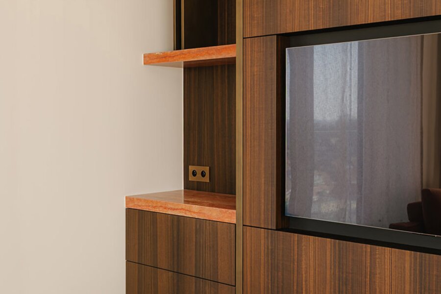 Het nachgedeelte omvat drie slaapkamers, twee badkamers en twee toiletten. In het hele appartement zijn talrijke ingebouwde kasten aanwezig.