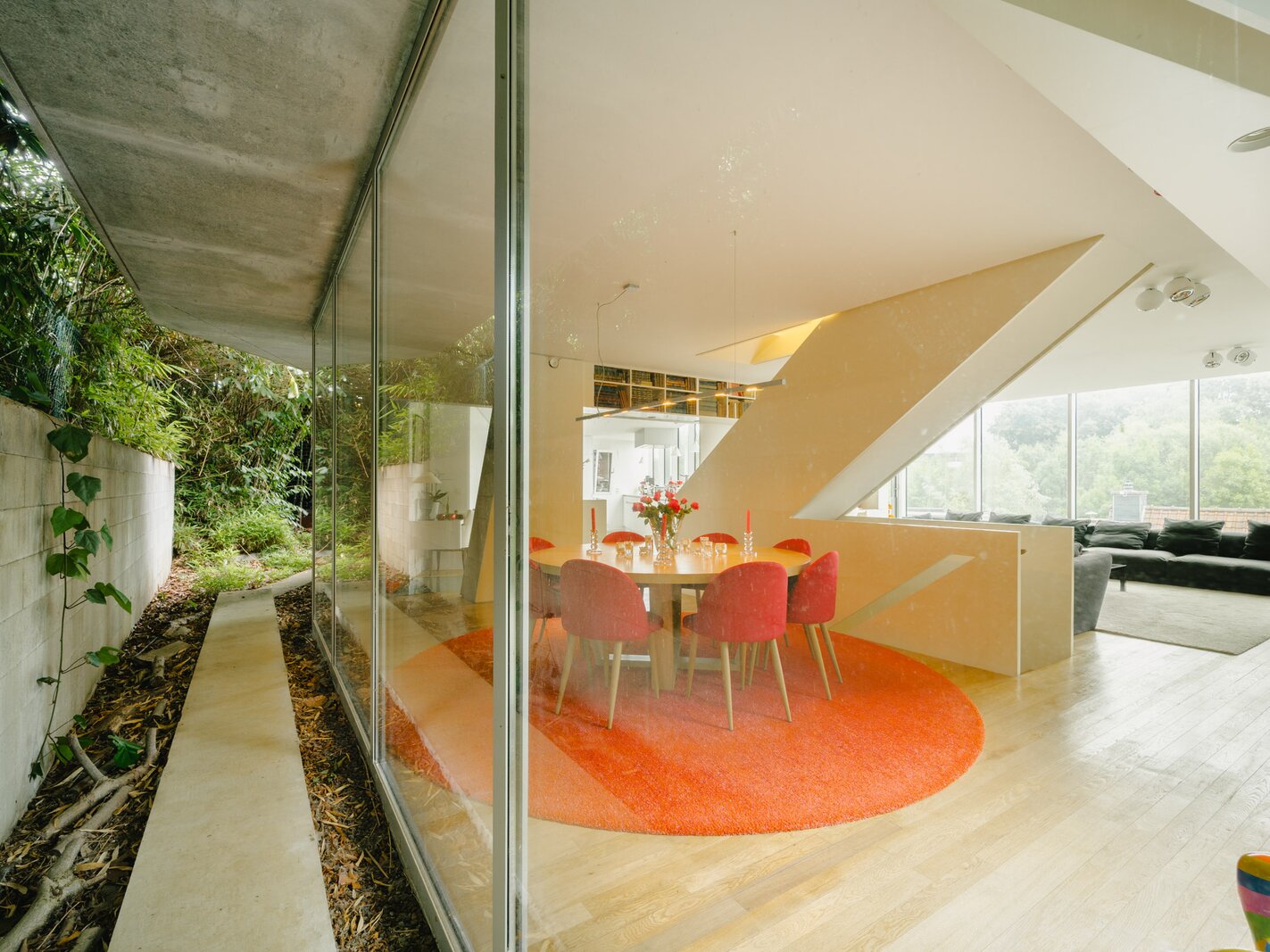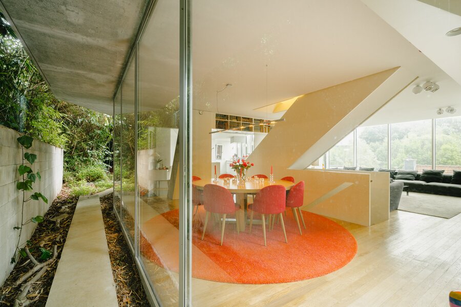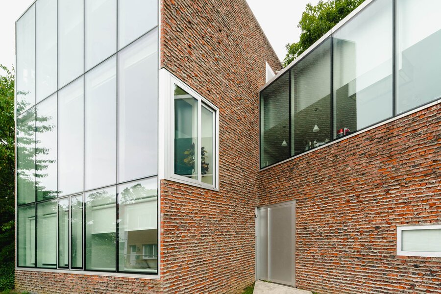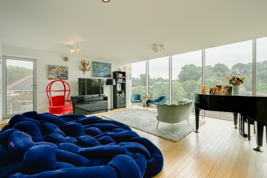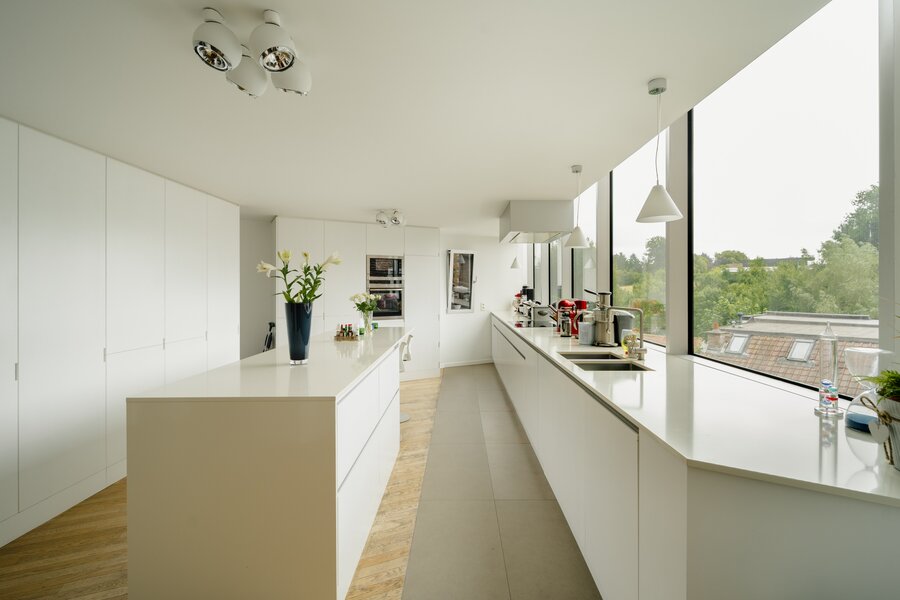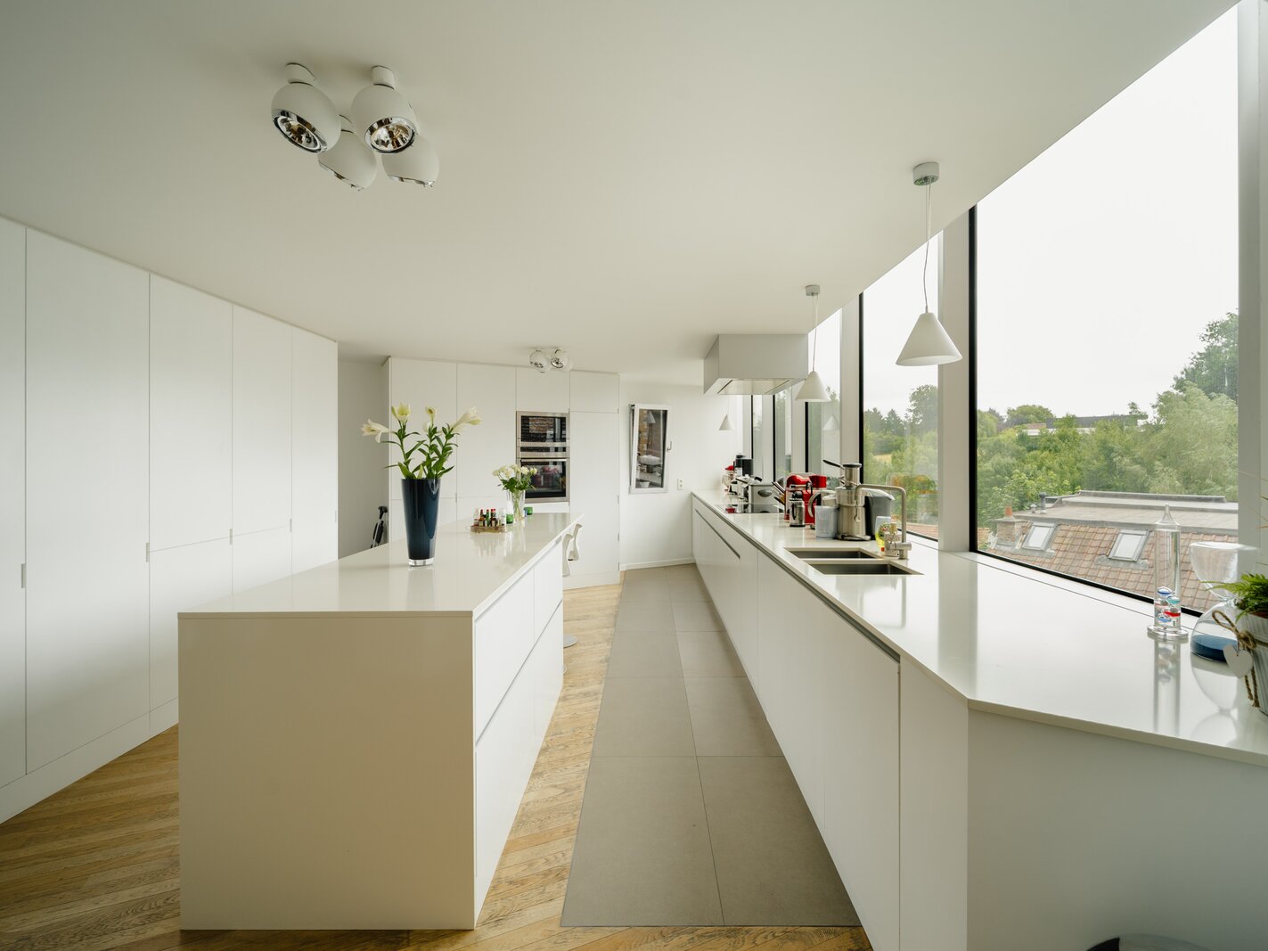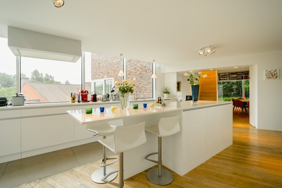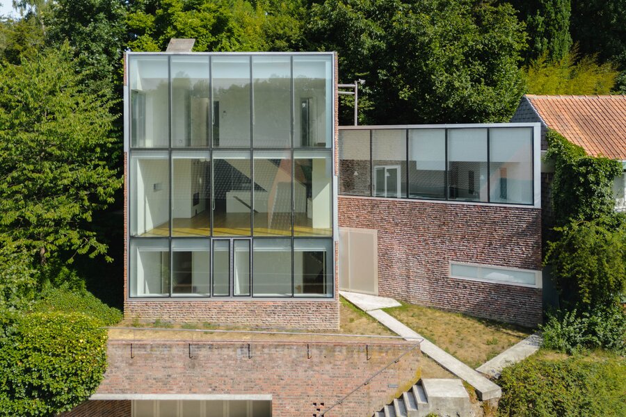 Aan de rand van Ukkel, in een rustige straat grenzend aan het Verrewinkelbos, ligt deze uitzonderlijke hedendaagse woning ontworpen door Pierre Hebbelinck. Bekend om zijn ingetogen architectuur en sterke landschappelijke verankering, ontwierp hij hier een woning die zich letterlijk inschrijft in het terrein. De woning strekt zich uit over drie niveaus, met op tuinniveau vier slaapkamers, een badkamer, douchekamer en bergruimte. De leefruimte op de eerste verdieping geniet van een open plan met eetruimte, salon en keuken, en toegang tot een royaal terras met uitzicht op de velden van Linkebeek. Boven bevindt zich een rustige master suite met dressing, badkamer en een bureau met aparte toegang. Materialen als genuanceerde baksteen, aluminium schrijnwerk en fijne detaillering zorgen voor een krachtig maar ingetogen geheel. Voor wie houdt van stilte, licht, en architectuur met visie, is dit een unieke kans op een meesterwoning midden in het groen en toch vlakbij alles.