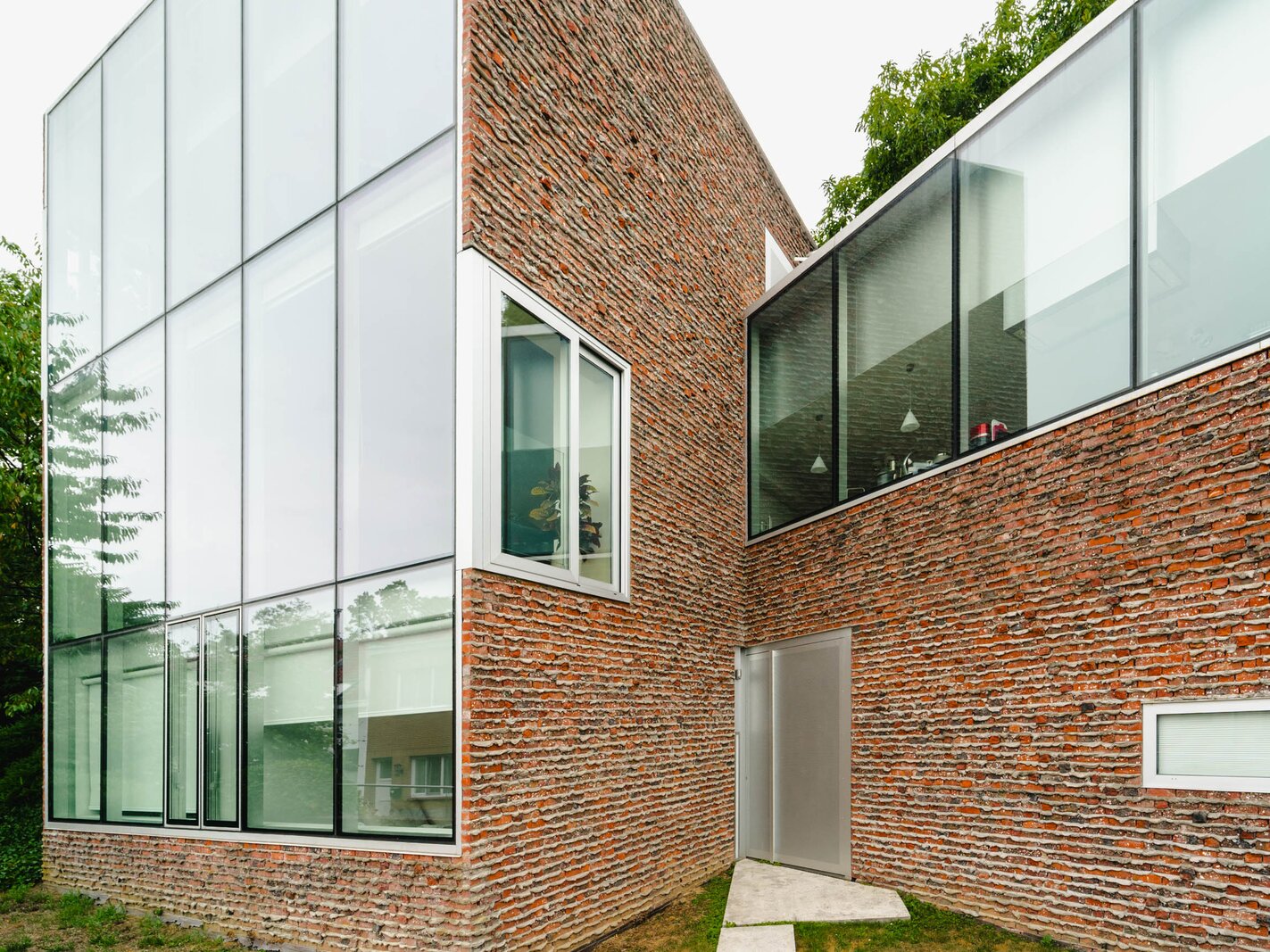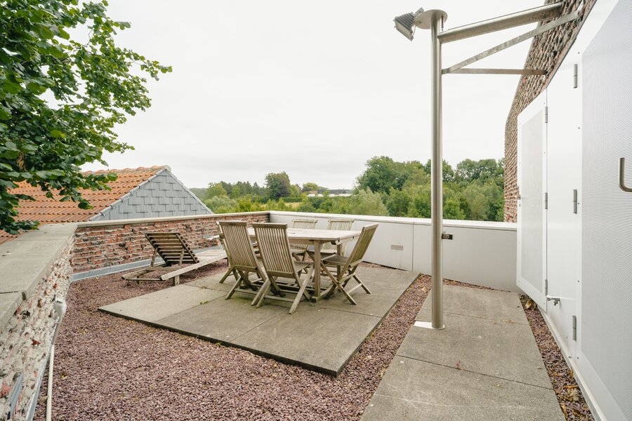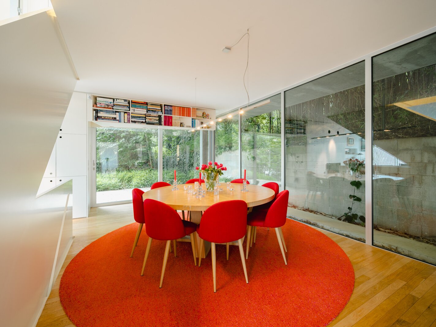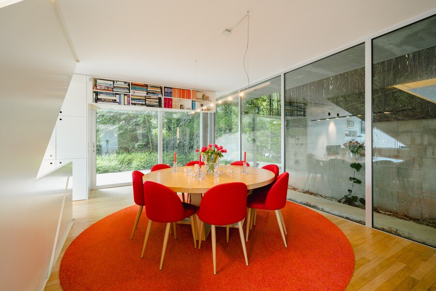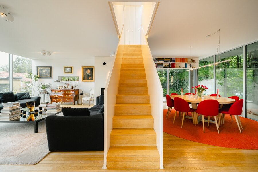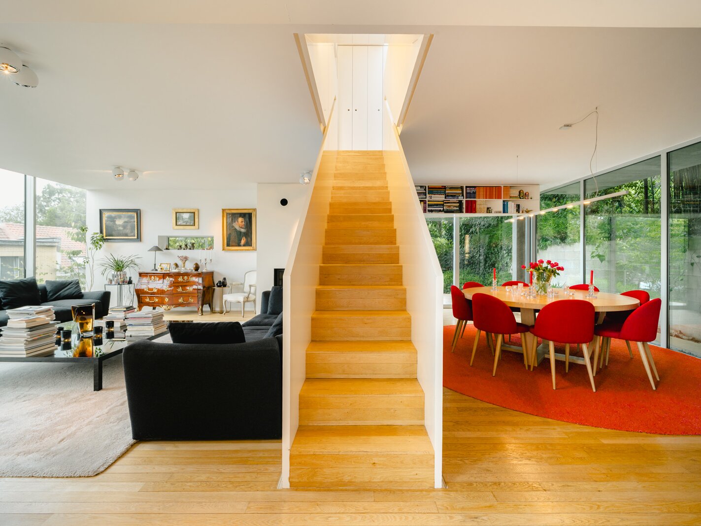 Aan de rand van Ukkel, in een rustige straat grenzend aan het Verrewinkelbos, ligt deze uitzonderlijke hedendaagse woning ontworpen door Pierre Hebbelinck. Bekend om zijn ingetogen architectuur en sterke landschappelijke verankering, ontwierp hij hier een woning die zich letterlijk inschrijft in het terrein. De woning strekt zich uit over drie niveaus, met op tuinniveau vier slaapkamers, een badkamer, douchekamer en bergruimte. De leefruimte op de eerste verdieping geniet van een open plan met eetruimte, salon en keuken, en toegang tot een royaal terras met uitzicht op de velden van Linkebeek. Boven bevindt zich een rustige master suite met dressing, badkamer en een bureau met aparte toegang. Materialen als genuanceerde baksteen, aluminium schrijnwerk en fijne detaillering zorgen voor een krachtig maar ingetogen geheel. Voor wie houdt van stilte, licht, en architectuur met visie, is dit een unieke kans op een meesterwoning midden in het groen en toch vlakbij alles.