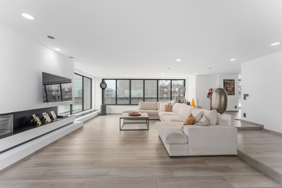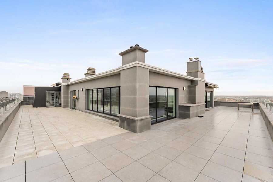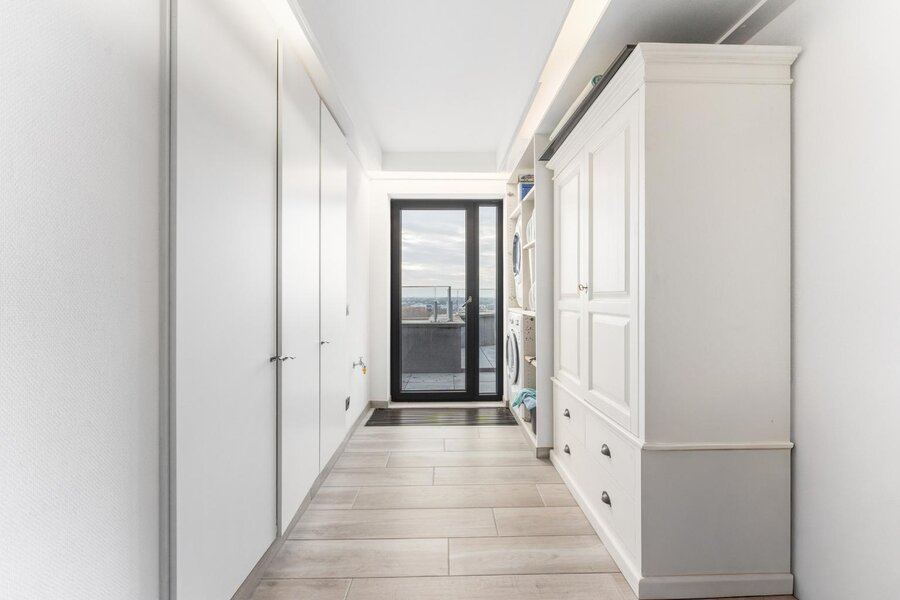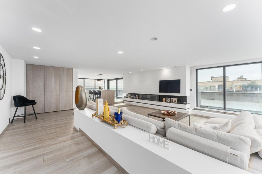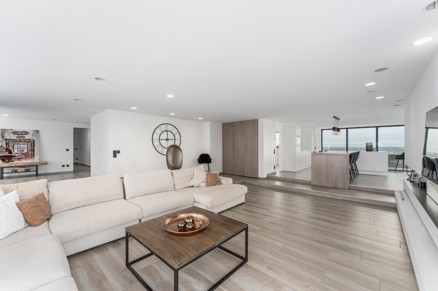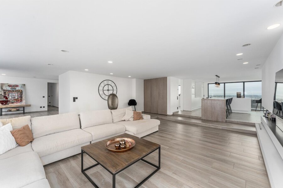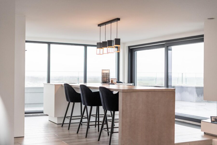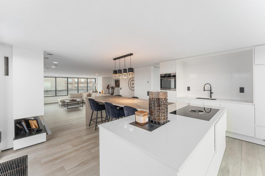 De lichtrijke leefruimte met open keuken vormt het hart van het penthouse, een stijlvolle plek om te ontspannen en te genieten van het uitzicht. De keuken is volledig uitgerust met hoogwaardige toestellen en afgewerkt met verfijnde materialen.