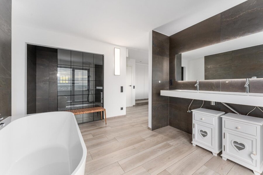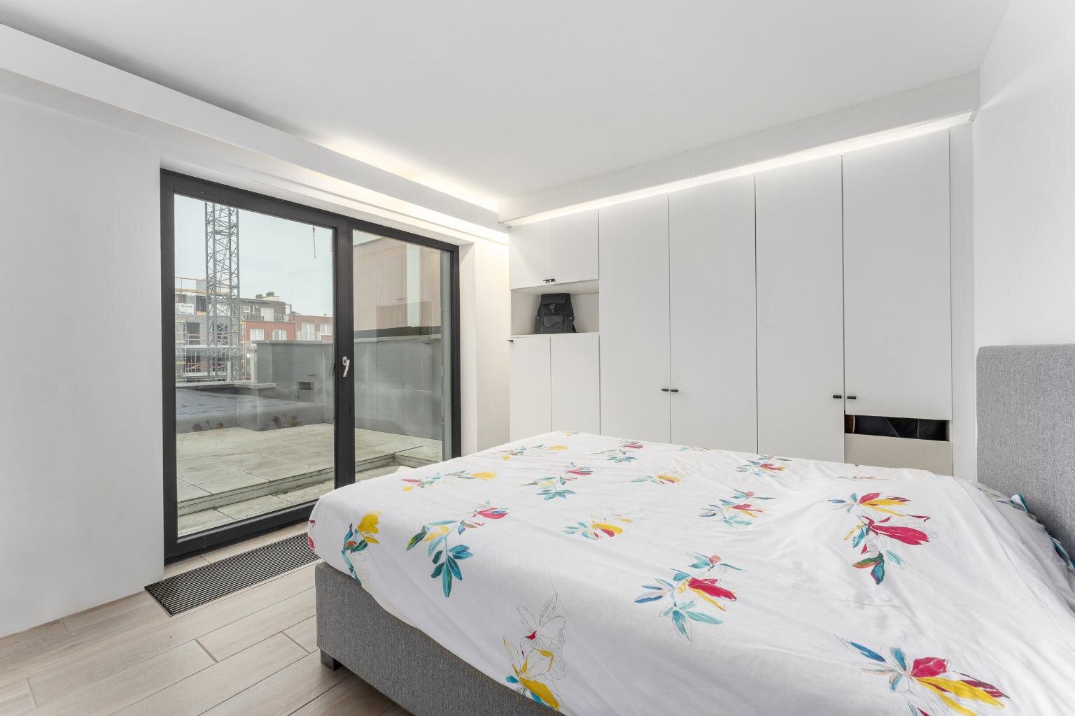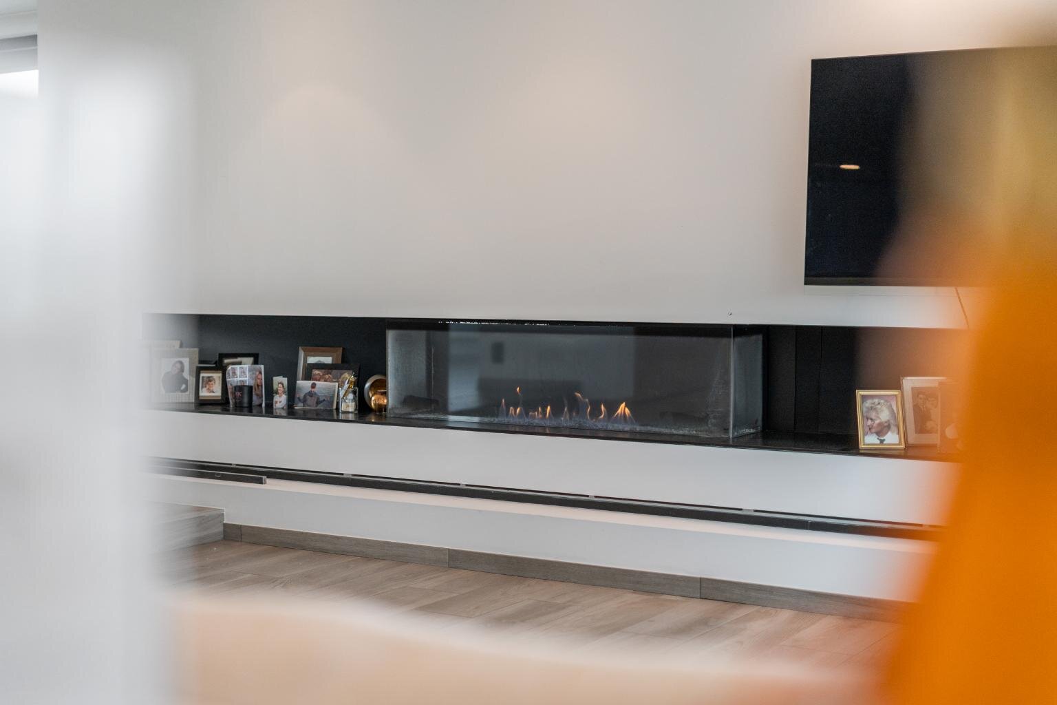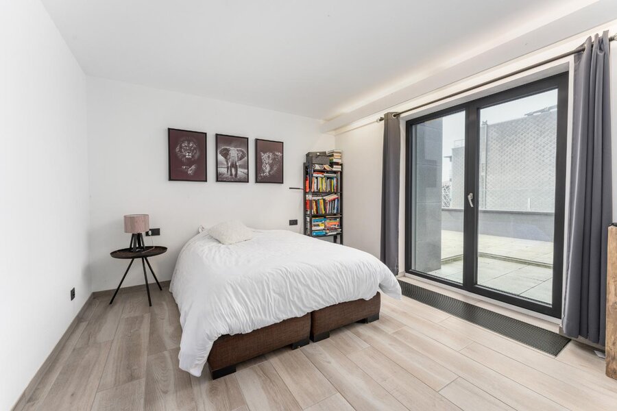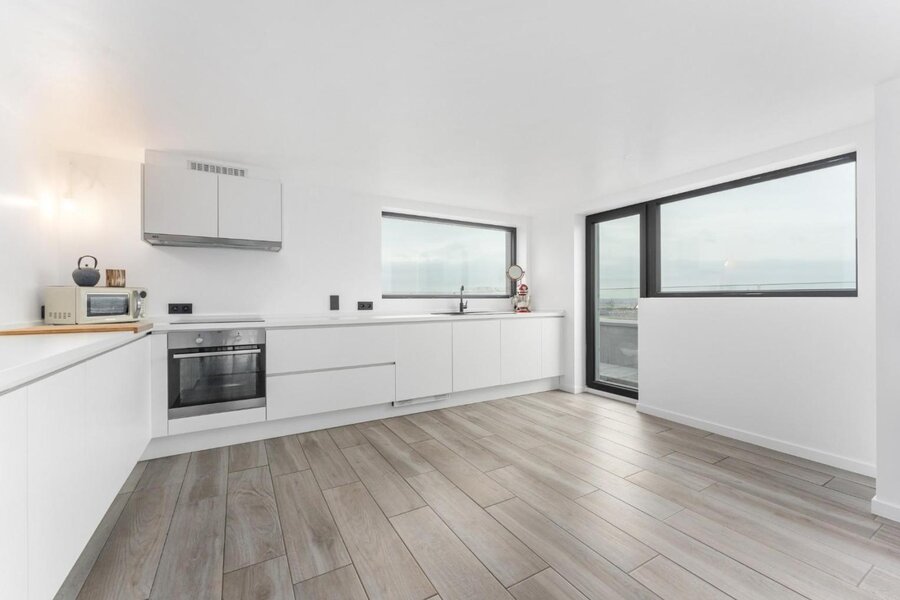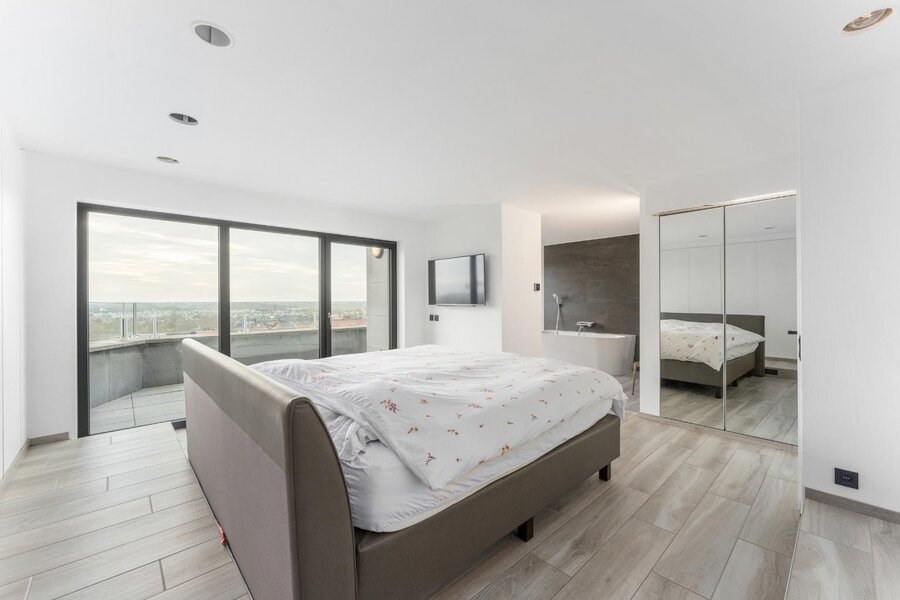 De lichtrijke leefruimte met open keuken vormt het hart van het penthouse, een stijlvolle plek om te ontspannen en te genieten van het uitzicht. De keuken is volledig uitgerust met hoogwaardige toestellen en afgewerkt met verfijnde materialen.