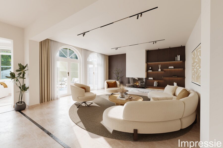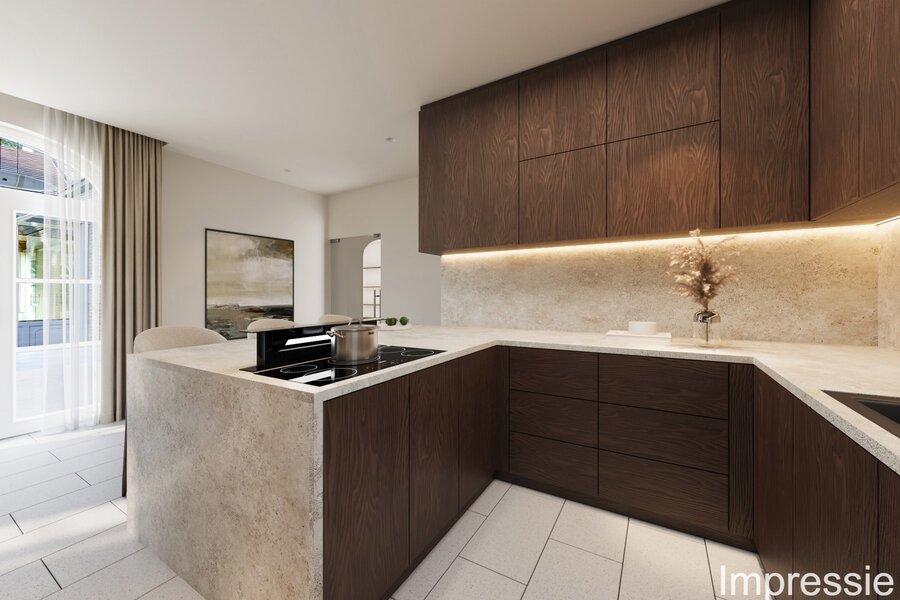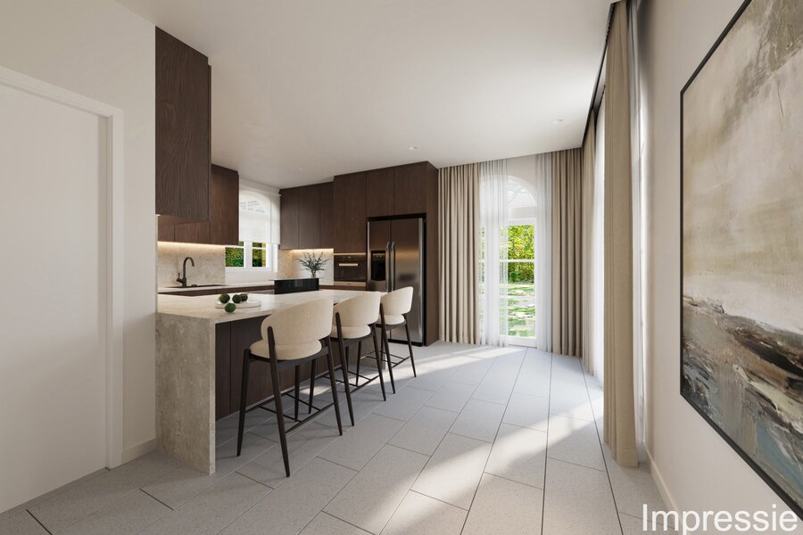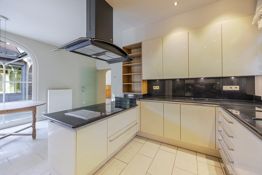 Aansluitend is er de volledig ingerichte leefkeuken (19,76m²) met alle nodige toestellen (Amerikaanse koelkast, oven, vaatwasser, kookplaat, ingebouwde friteuse, dampkap). De achterdeur verleent doorgang tot het aanpalend (overdekt) terras met royaal zicht op de tuin.