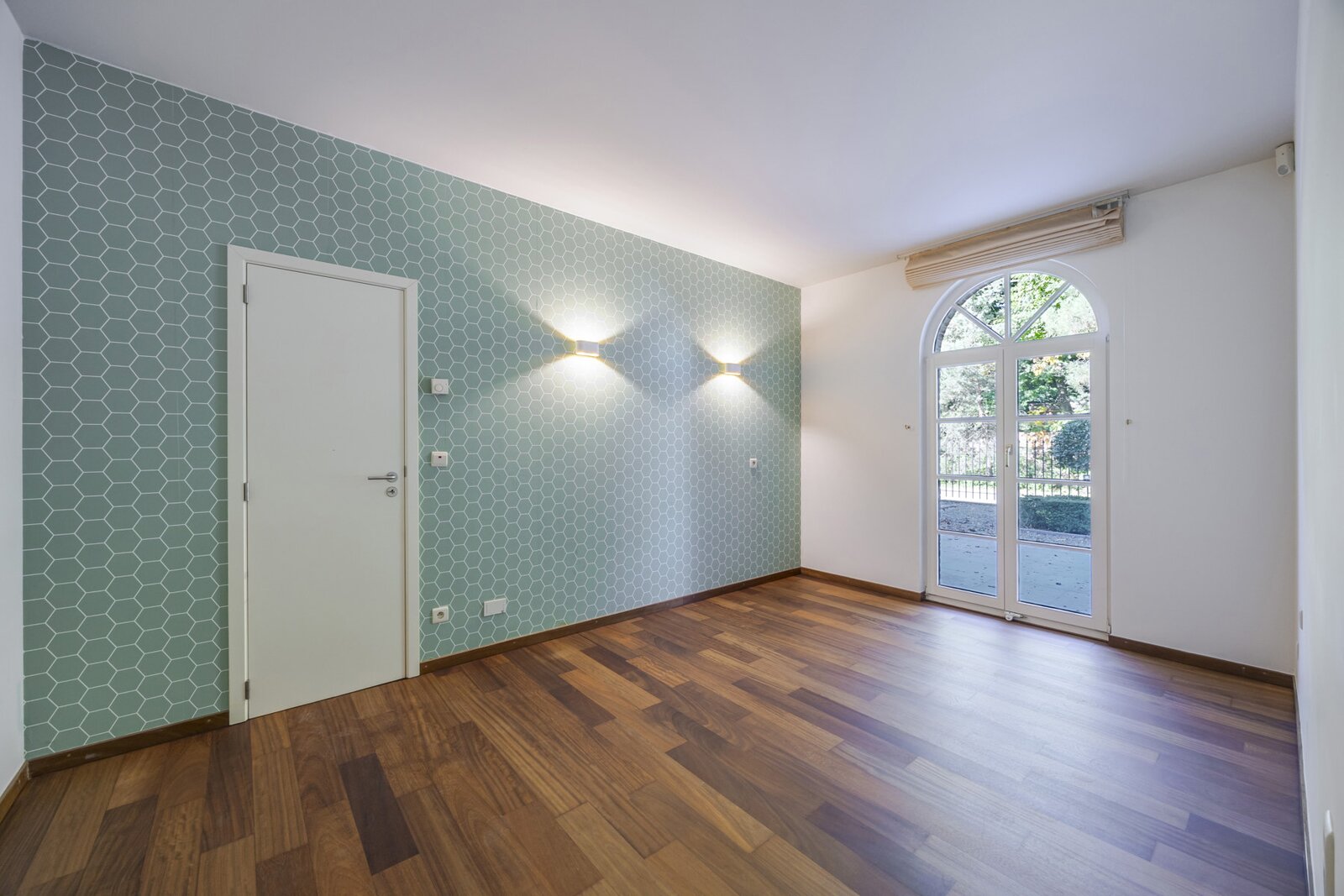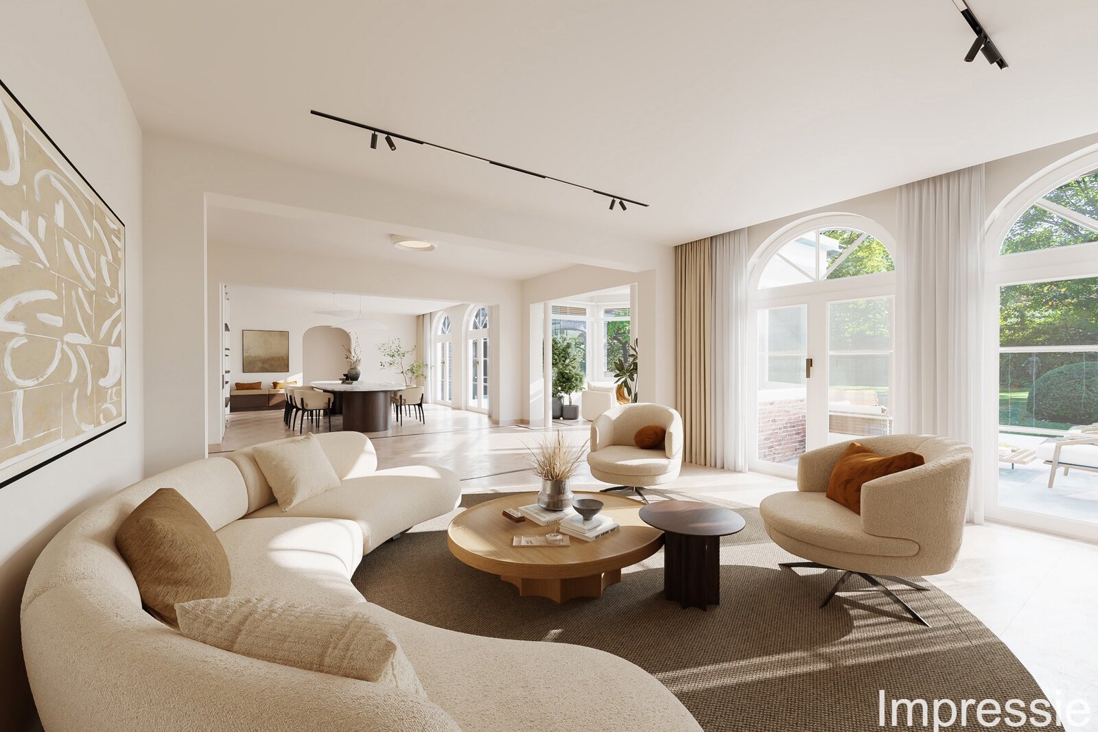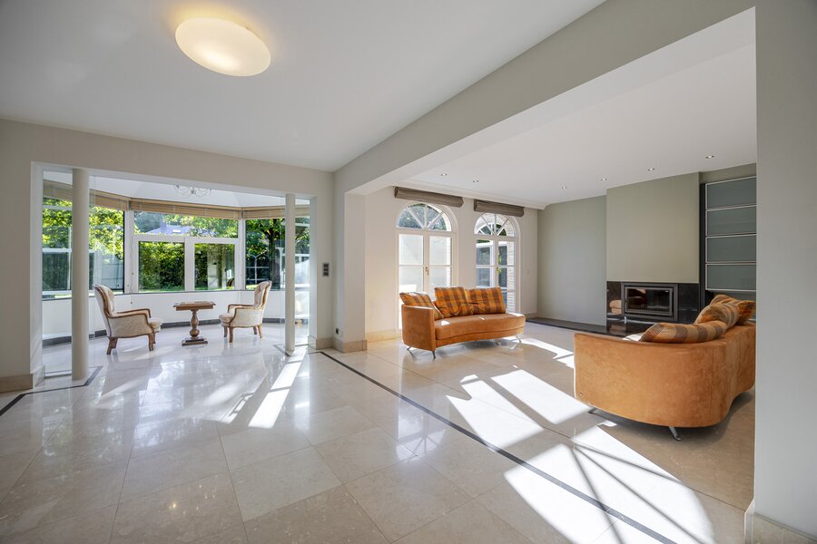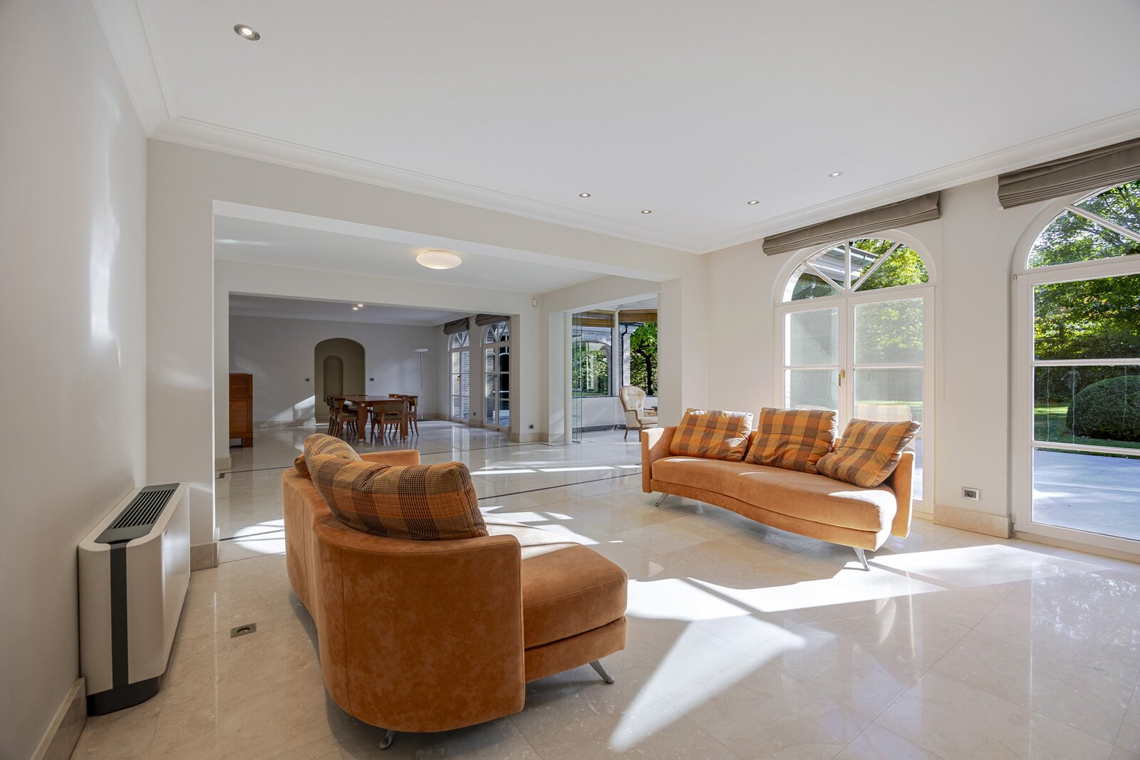 De ruime inkomhal met vestiaireruimte en gastentoilet mondt uit via een dubbele deur, tot de lichtrijke woon- en eetkamer (71,60m²) met zicht op de prachtige tuin.