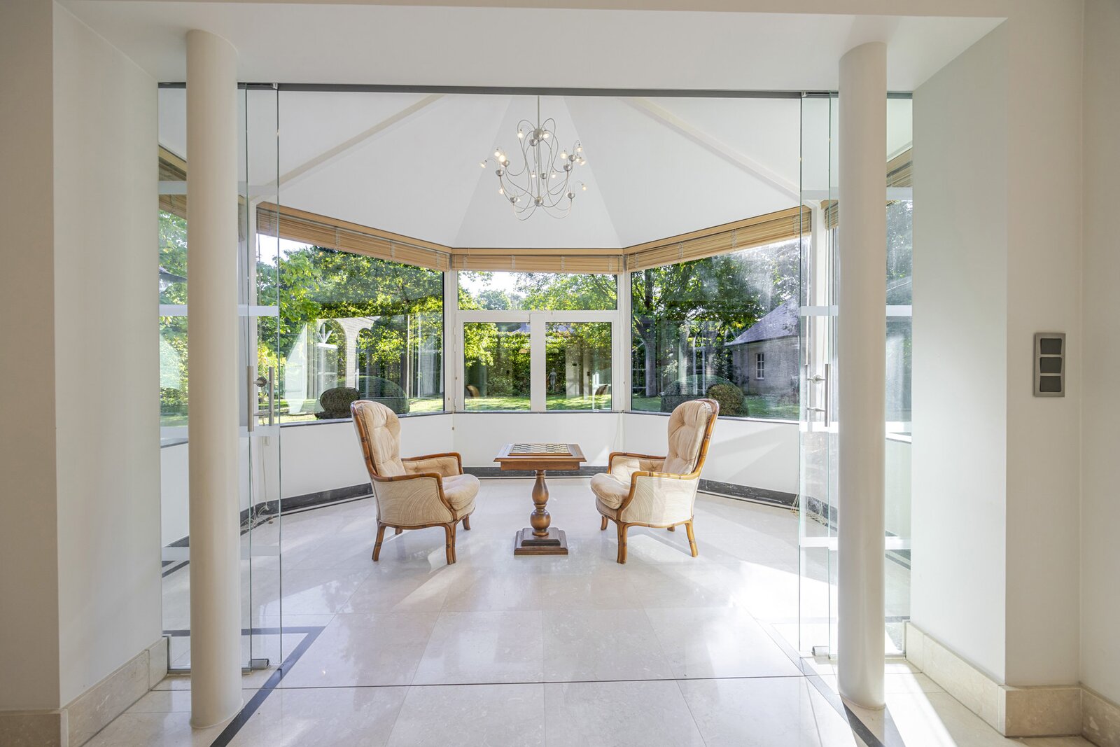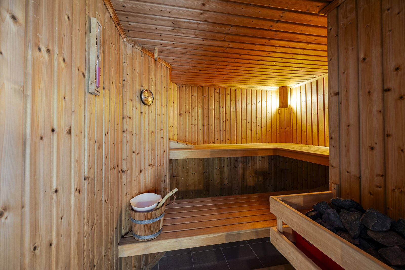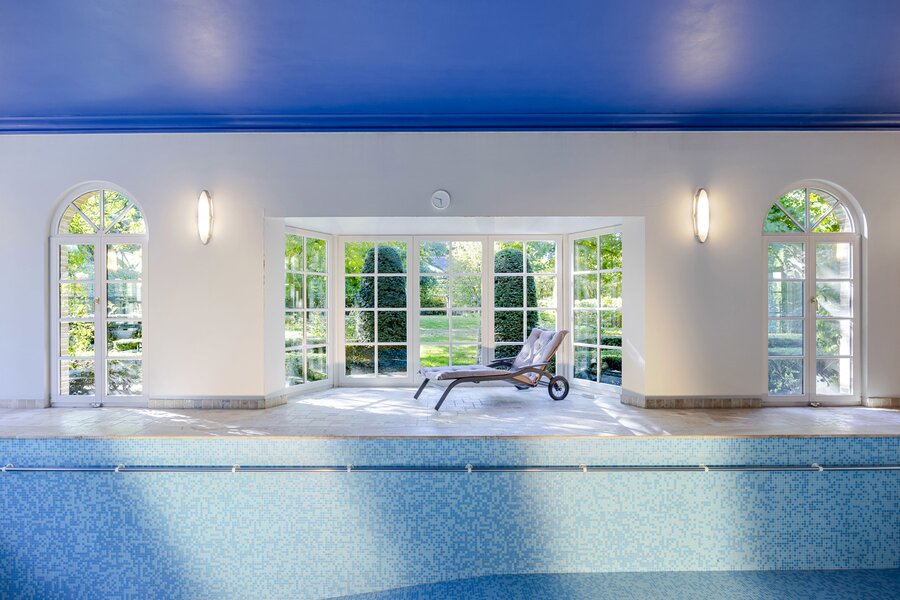 Aan de zuidkant van de woning bevindt zich het riante binnenzwembad met zicht op de tuin. De aanwezigheid van een sauna, doucheruimte en jacuzzi kan hier de nodige ontspanning bieden.
