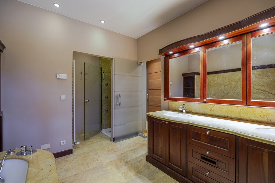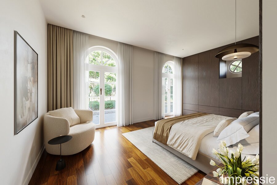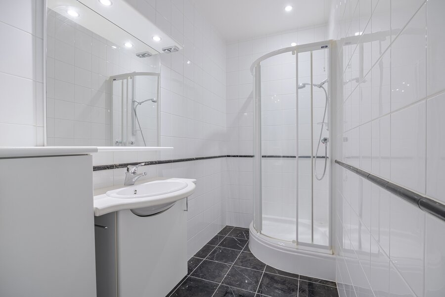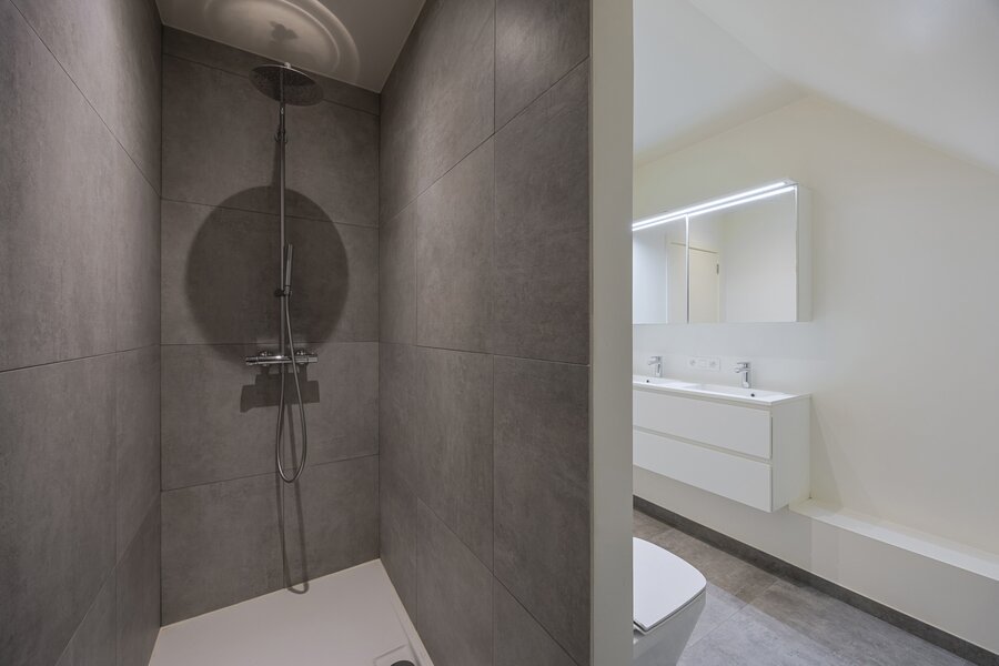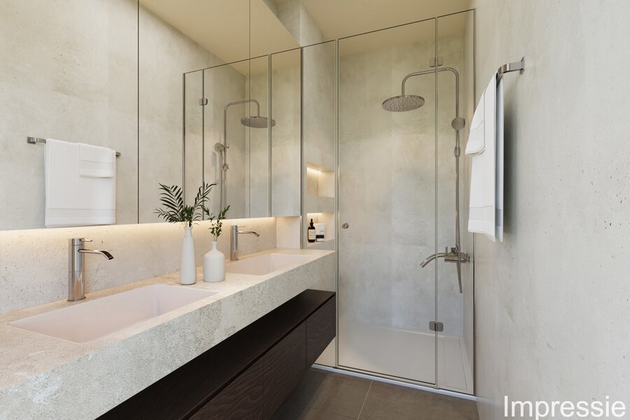 De veiligheidsdeur geeft toegang tot twee slaapkamers (17,28m² en 14,12m²). Slaapkamer 1 heeft een bijhorende dressingruimte en privatieve badkamer met ligbad, douche en dubbel meubel. Slaapkamer 2 geniet van een aansluitende douchekamer met enkel meubel.