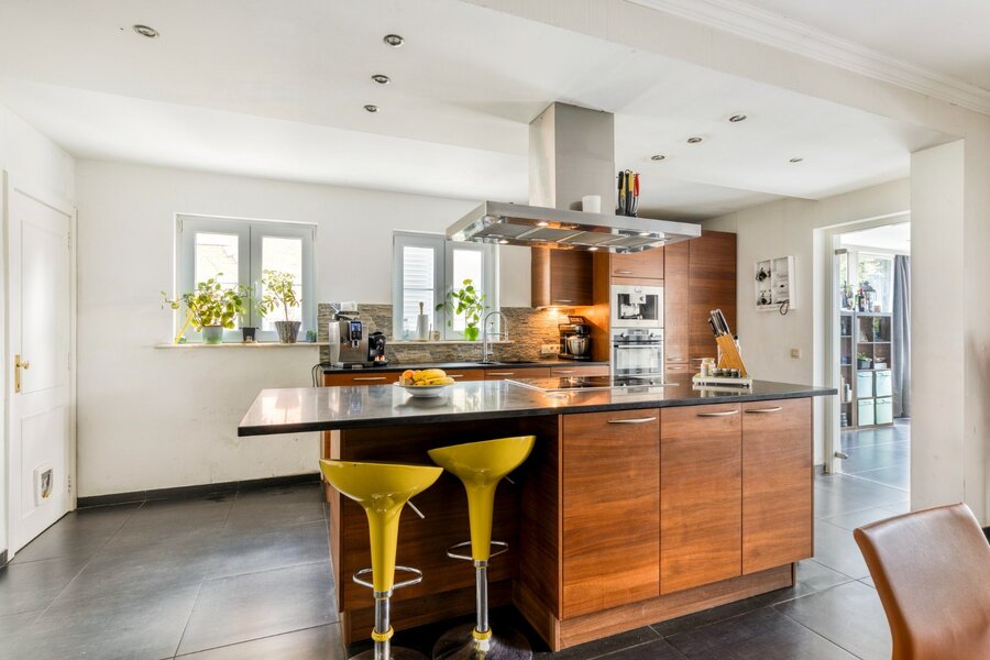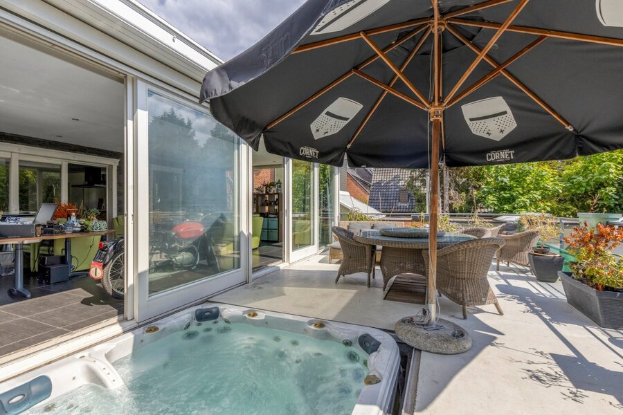De woning beschikt over een ruime, moderne keuken met kookeiland, volledig uitgerust met alle nodige toestellen, en sluit naadloos aan op de lichte en ruime leefruimte. In de schitterende aanbouw kan u volop genieten van de zon, met een directe toegang tot het terras waar een ingebouwde jacuzzi voor extra ontspanning zorgt.