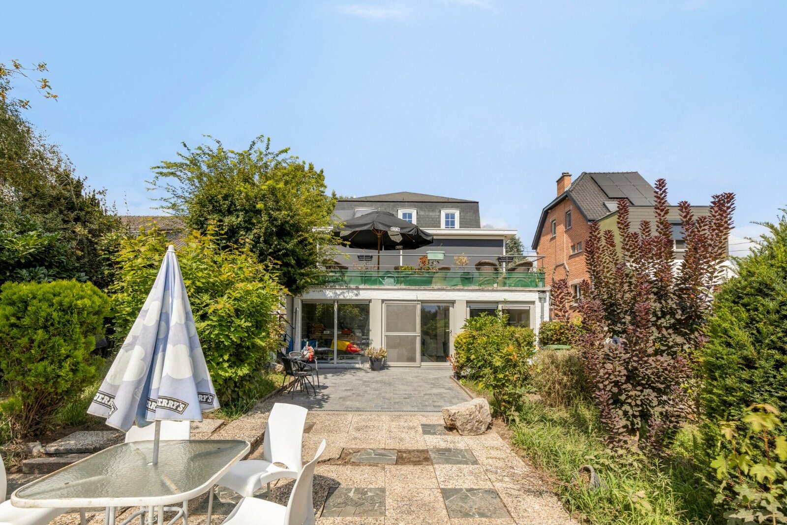 Op de eerste verdieping bevinden zich drie ruime slaapkamers met dressing en een stijlvolle badkamer voorzien van zowel ligbad als inloopdouche. Verder beschikt de woning over een garage met elektrische poort, vier autostaanplaatsen, een praktische berging en een wasplaats.