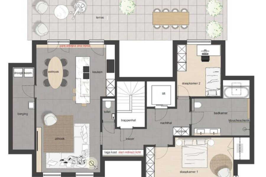 Het penthouse is zeer luxueus afgewerkt met hoogwaardige materialen is helemaal instapklaar en geschilderd en reeds voorzien van verlichting.