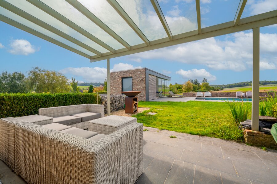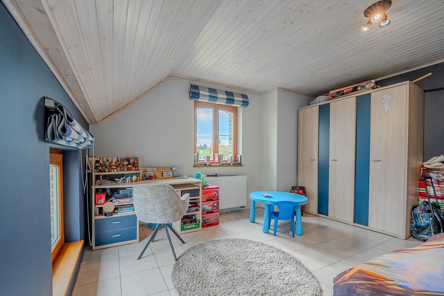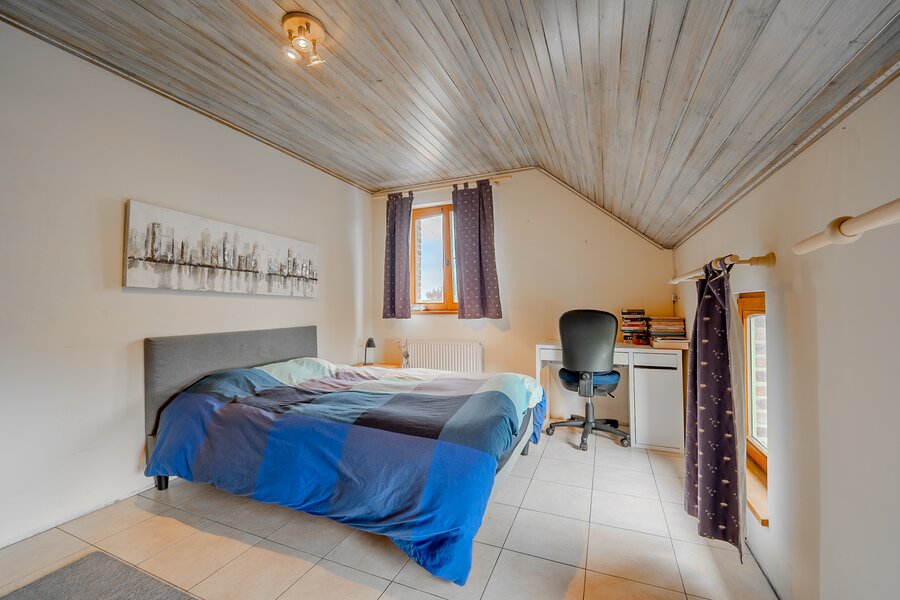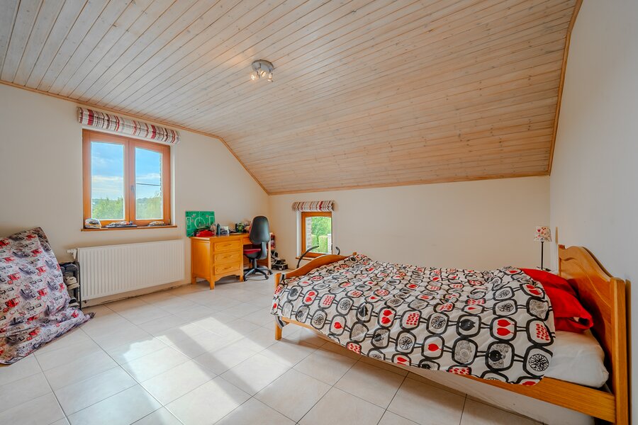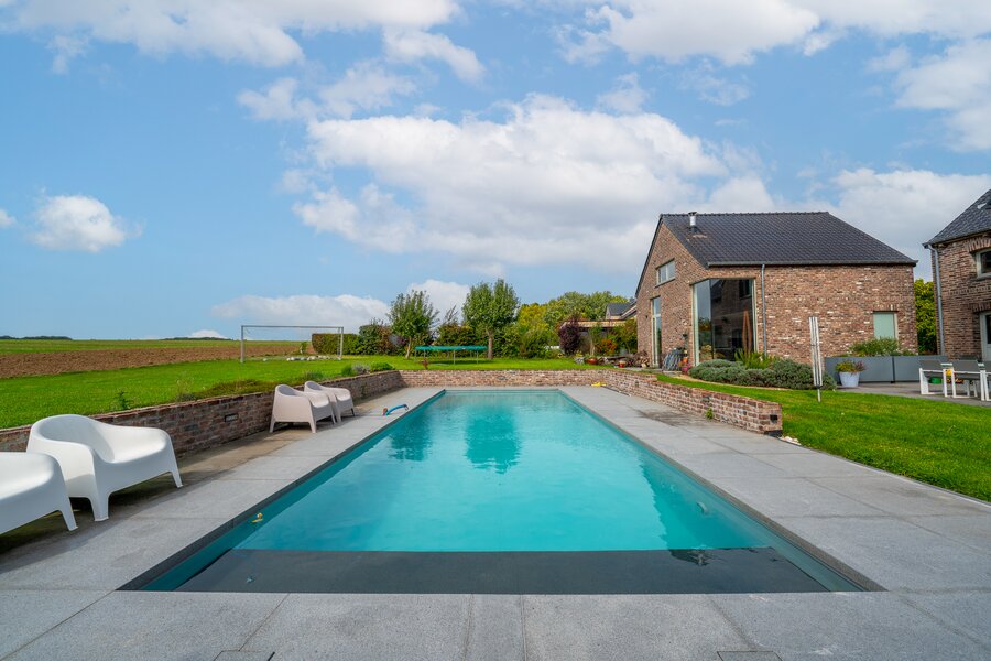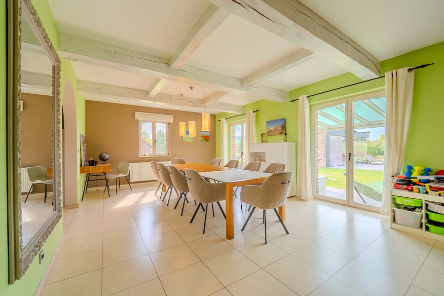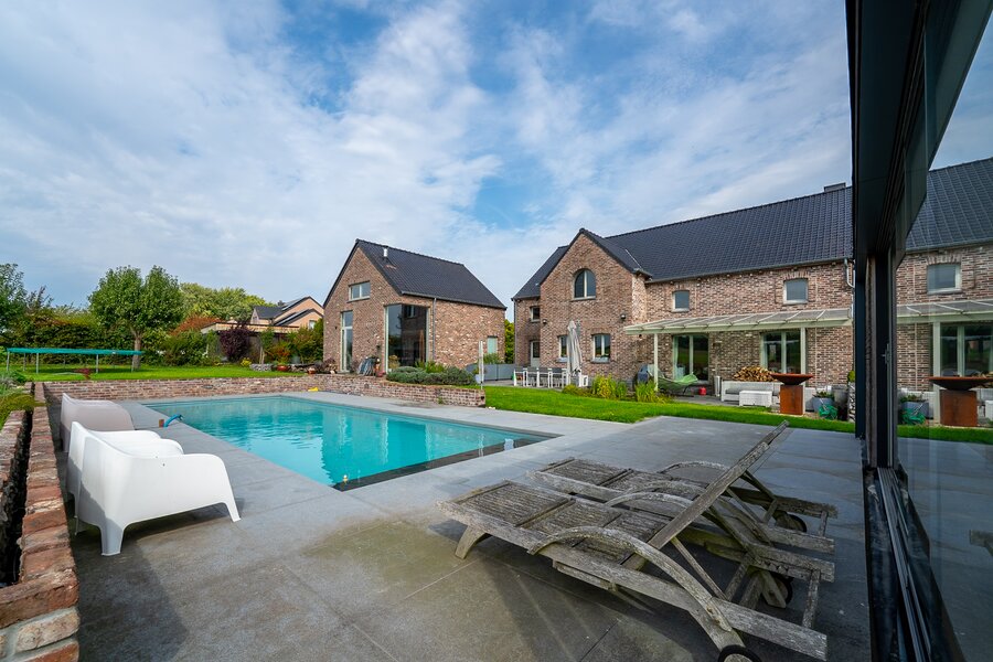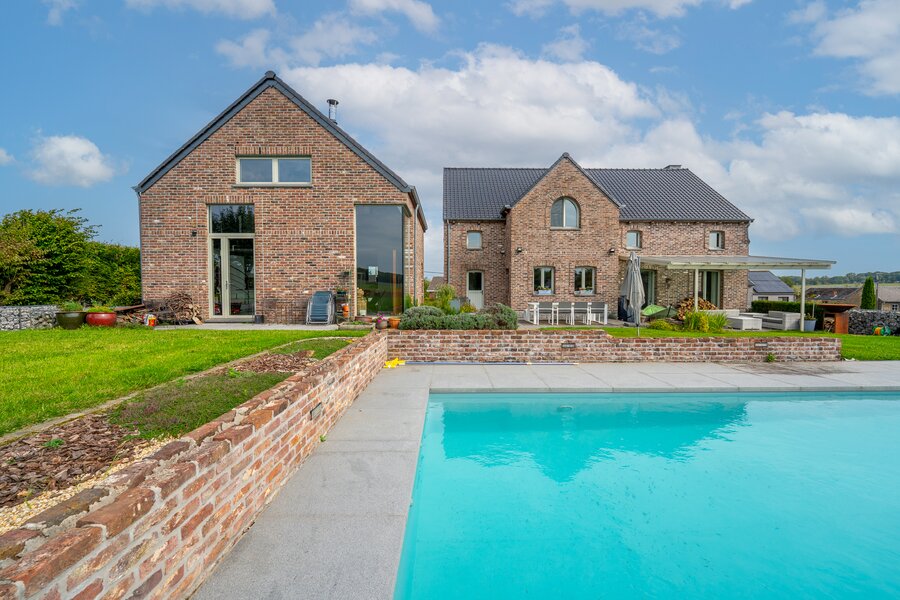 ERA Blavier biedt u deze ruime villa aan die comfort en ruimte combineert. Het hoofdgedeelte biedt een grote inkomhal, een ruime woonkamer, eetkamer, ingerichte keuken, wasruimte, toilet en kantoor (of slaapkamer). Op de verdieping: 4 slaapkamers, waarvan een ouderslaapkamer met dressing, badkamer en doucheruimte. Twee garages op -1 met directe toegang tot de weg. Aan de achterzijde: tuin met vrij uitzicht op de velden, zwembad, poolhouse (±40 m²) en terras. Prachtige vrijstaande bijgebouw (±100 m²) met woonkamer, keuken, mezzanine, slaapkamer, doucheruimte en twee garages: ideaal voor een vrij beroep, nevenactiviteit of gezin. Oliegestookte verwarming en houtkachel. Een zeldzaam pand met royale volumes en een hoge levenskwaliteit! Neem contact met ons op via 042322121 om een bezichtiging te regelen!