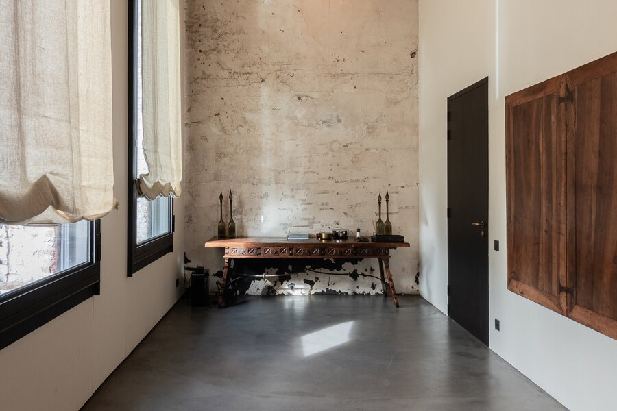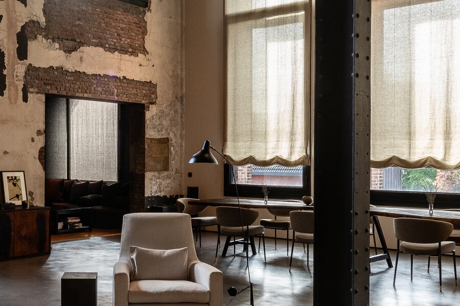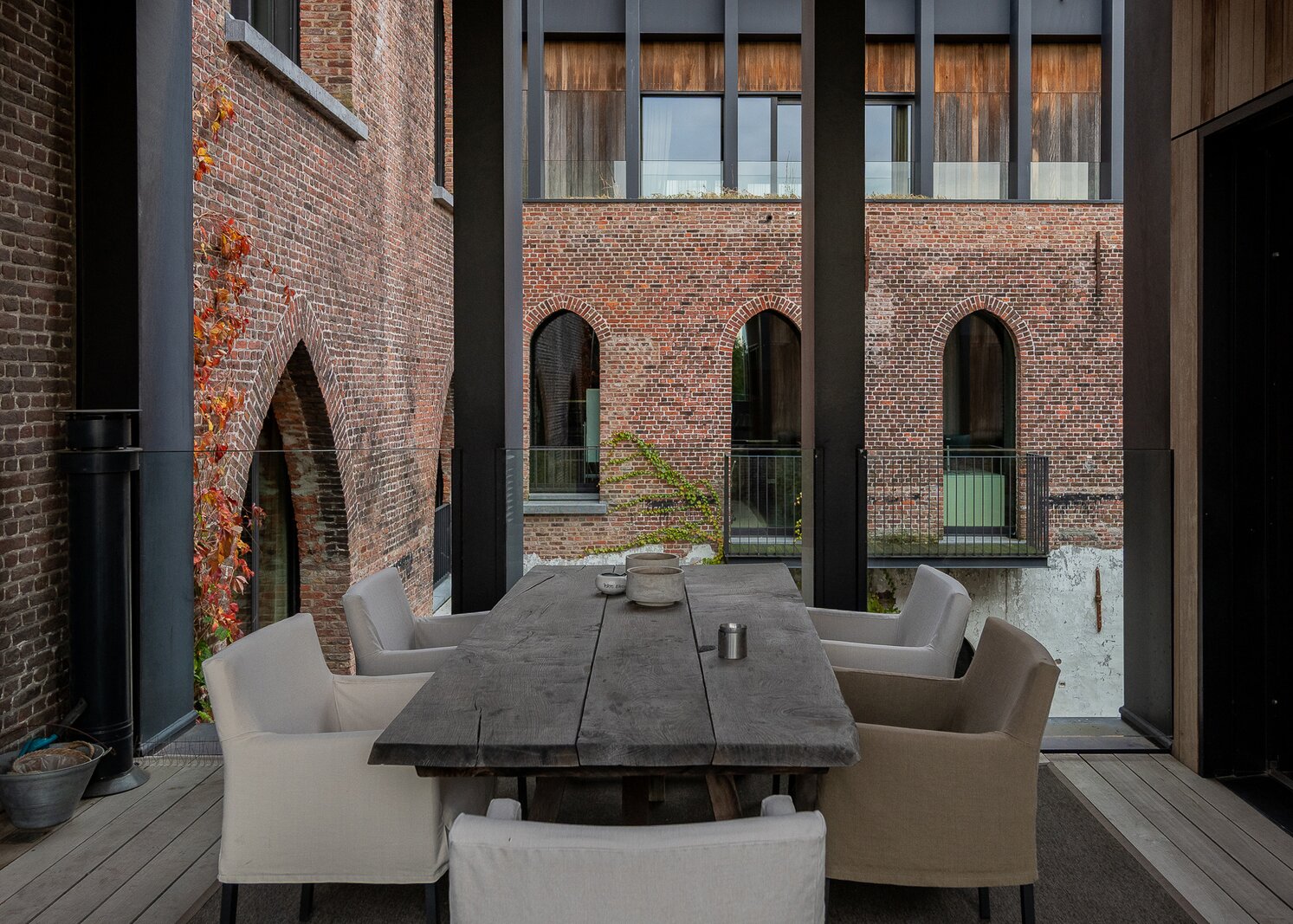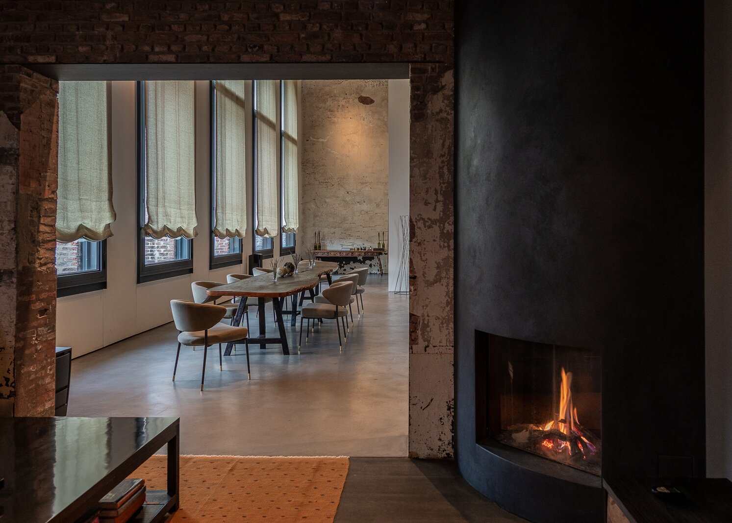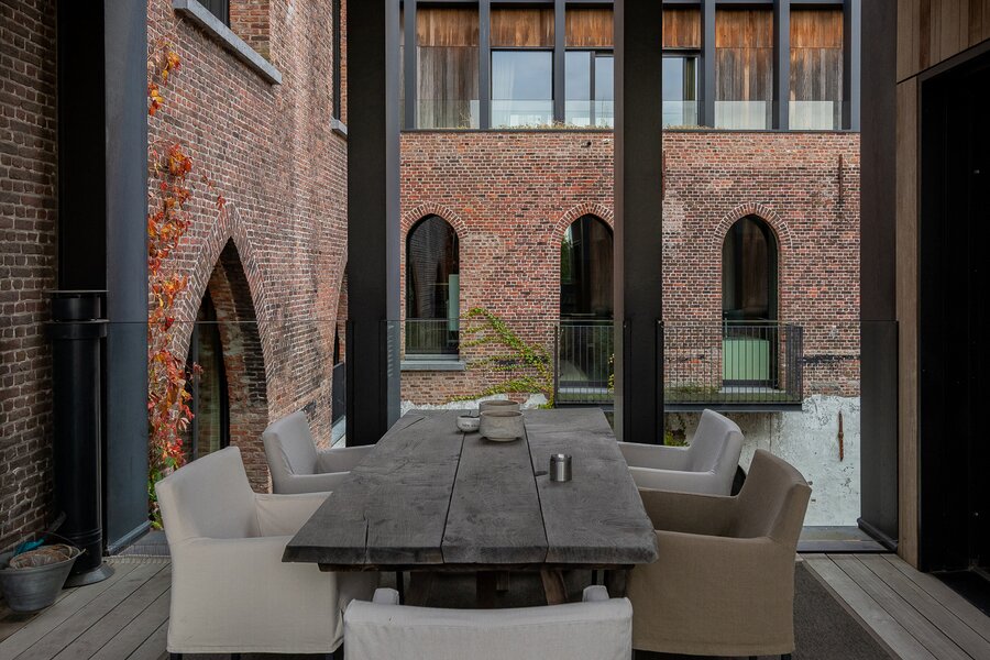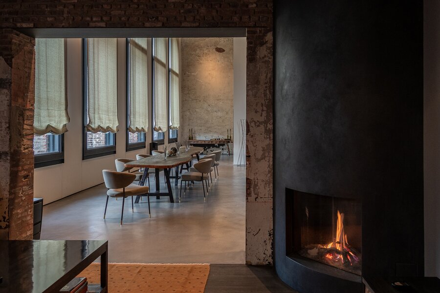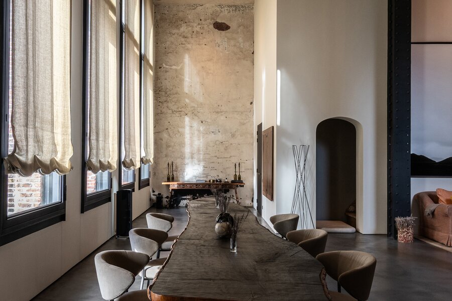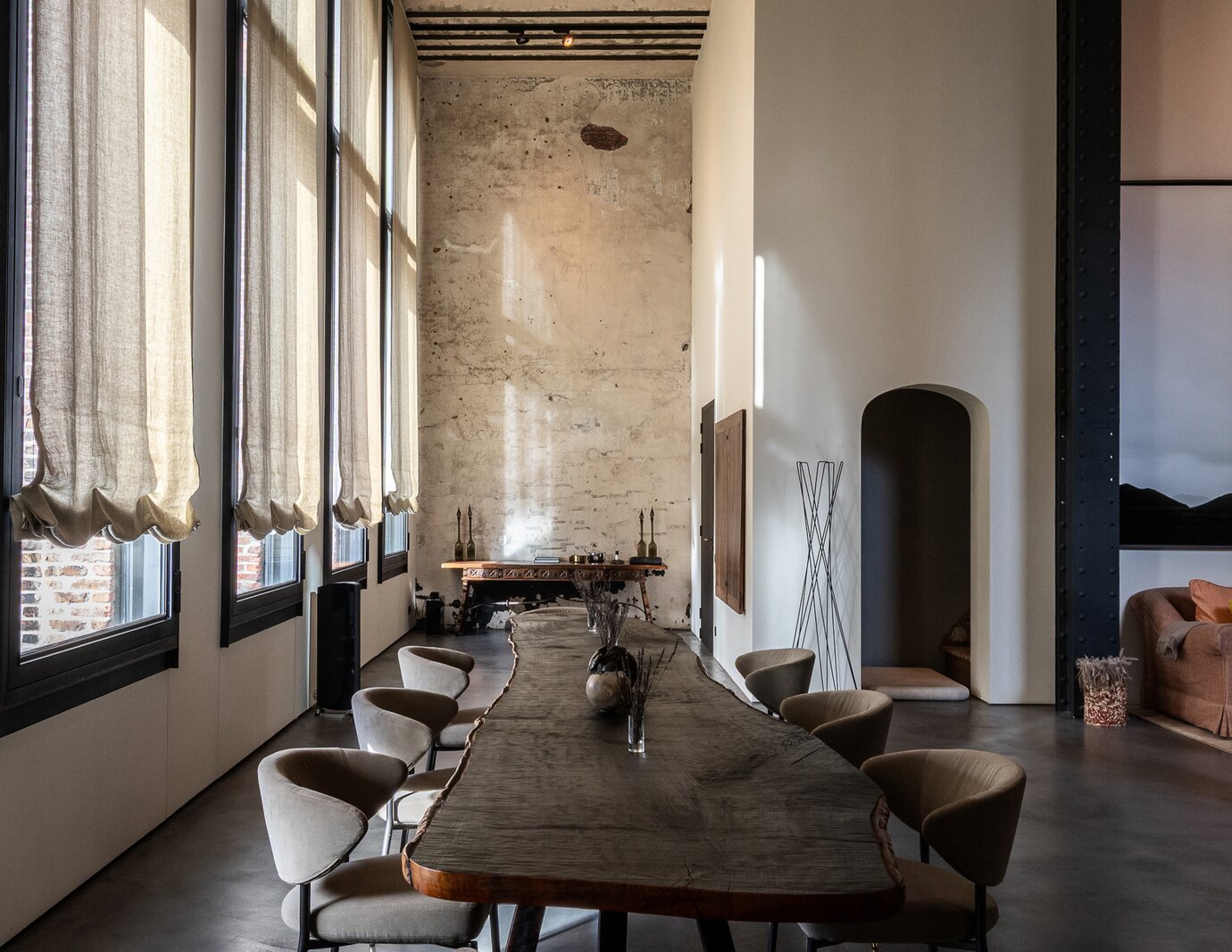 Boven de historische pakhuizen van de Stokerijstraat, bevindt zich een uitzonderlijk appartement van ca. 300 m², volledig ingericht door Axel Vervoordt zelf. Elk detail draagt zijn signatuur: ingetogen luxe, natuurlijke materialen en een haast meditatieve lichtinval.