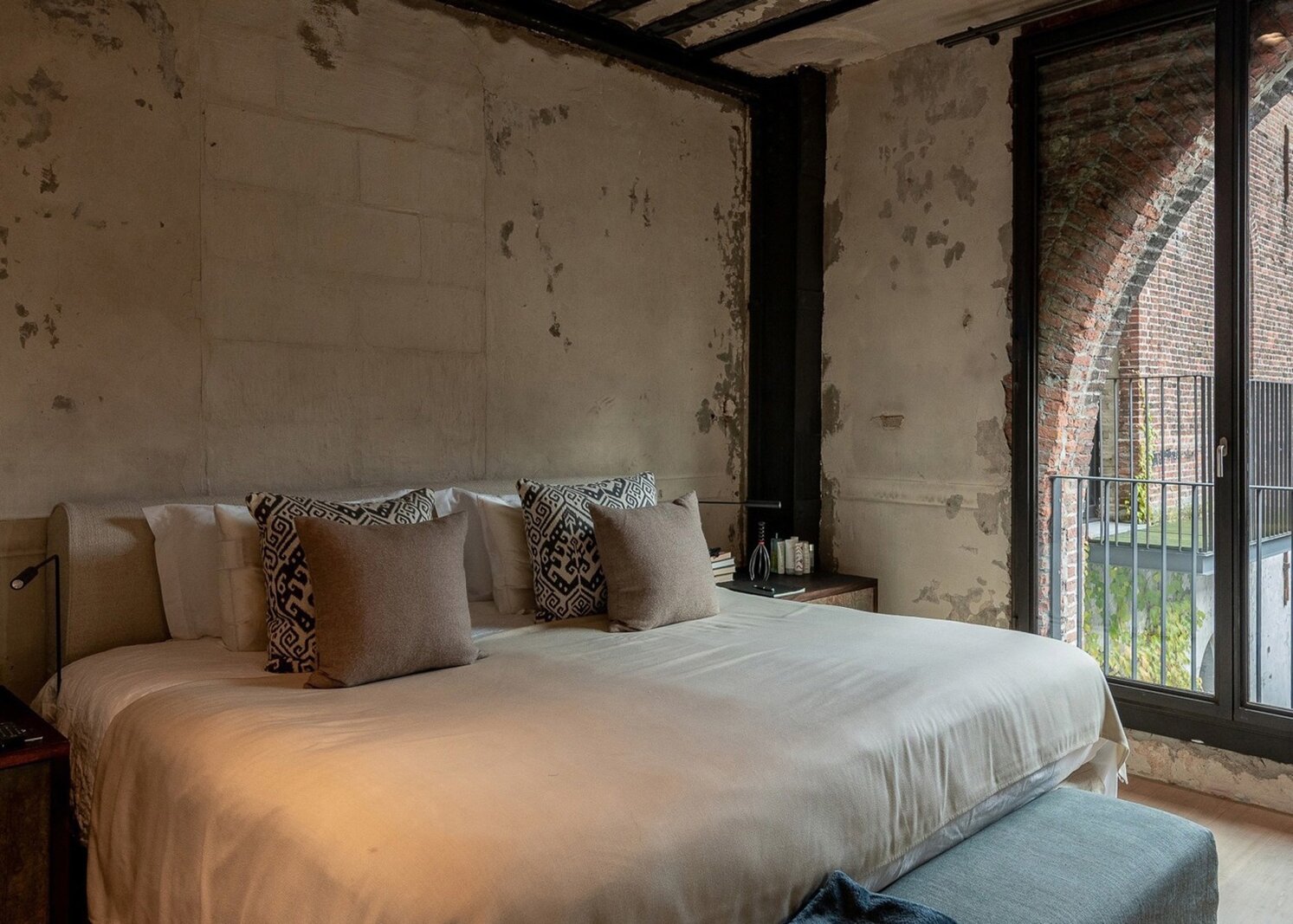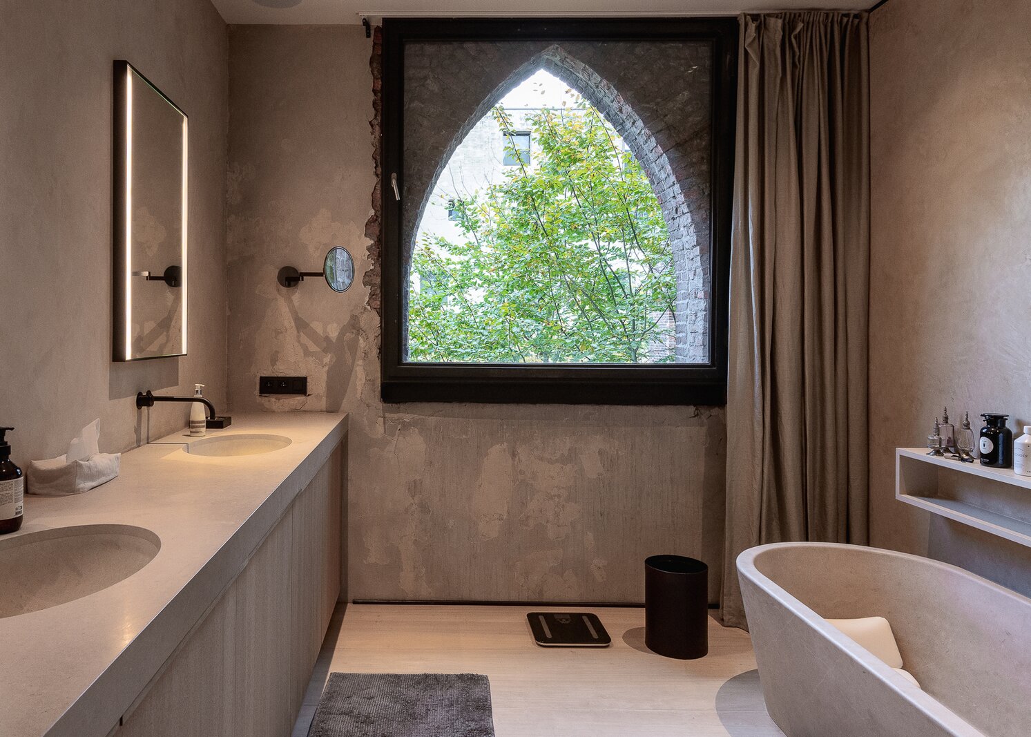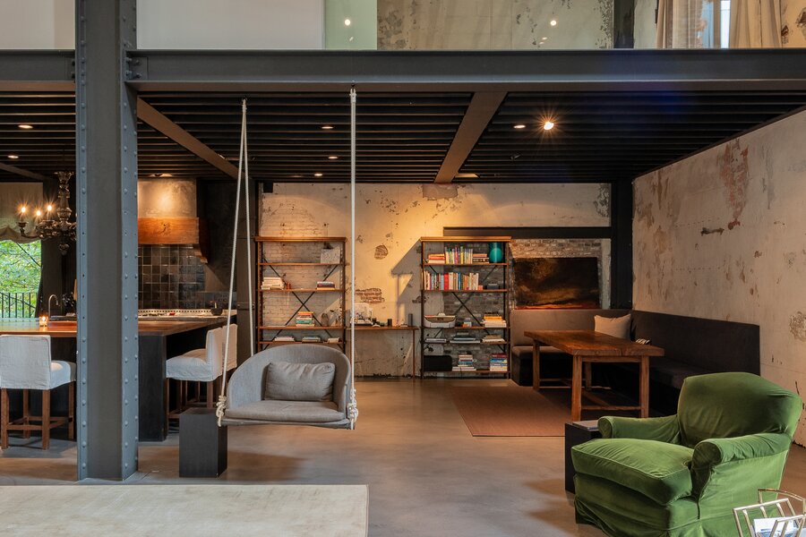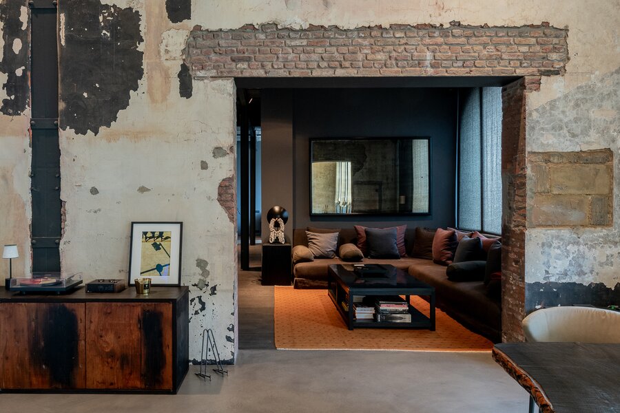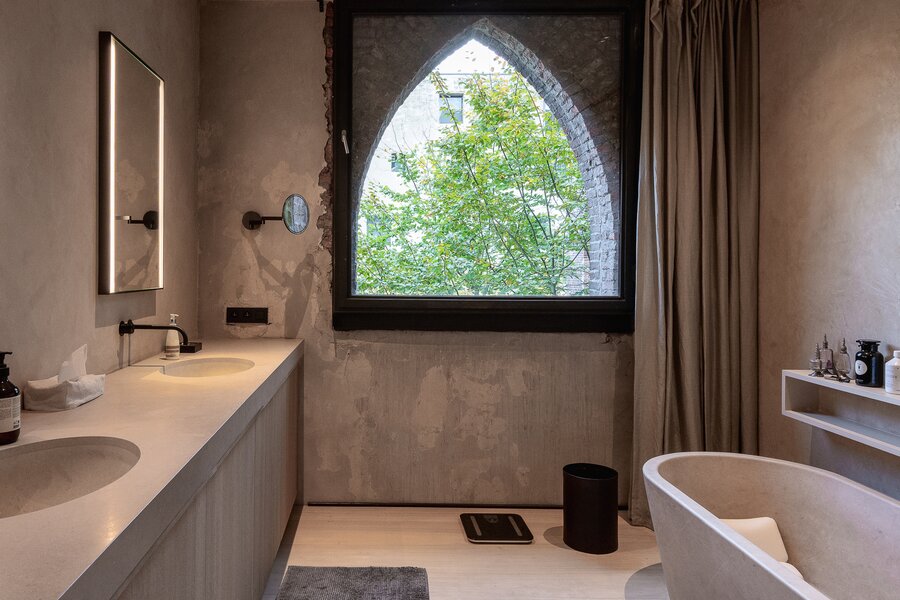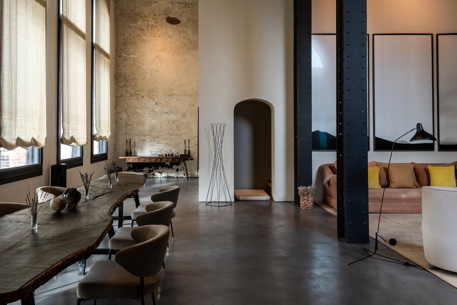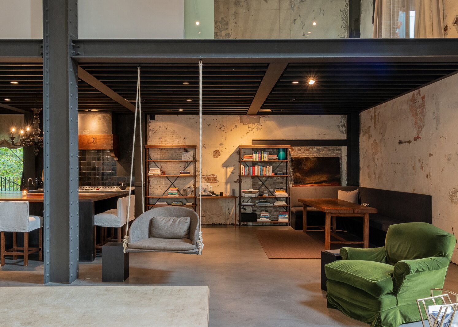 Boven de historische pakhuizen van de Stokerijstraat, bevindt zich een uitzonderlijk appartement van ca. 300 m², volledig ingericht door Axel Vervoordt zelf. Elk detail draagt zijn signatuur: ingetogen luxe, natuurlijke materialen en een haast meditatieve lichtinval.