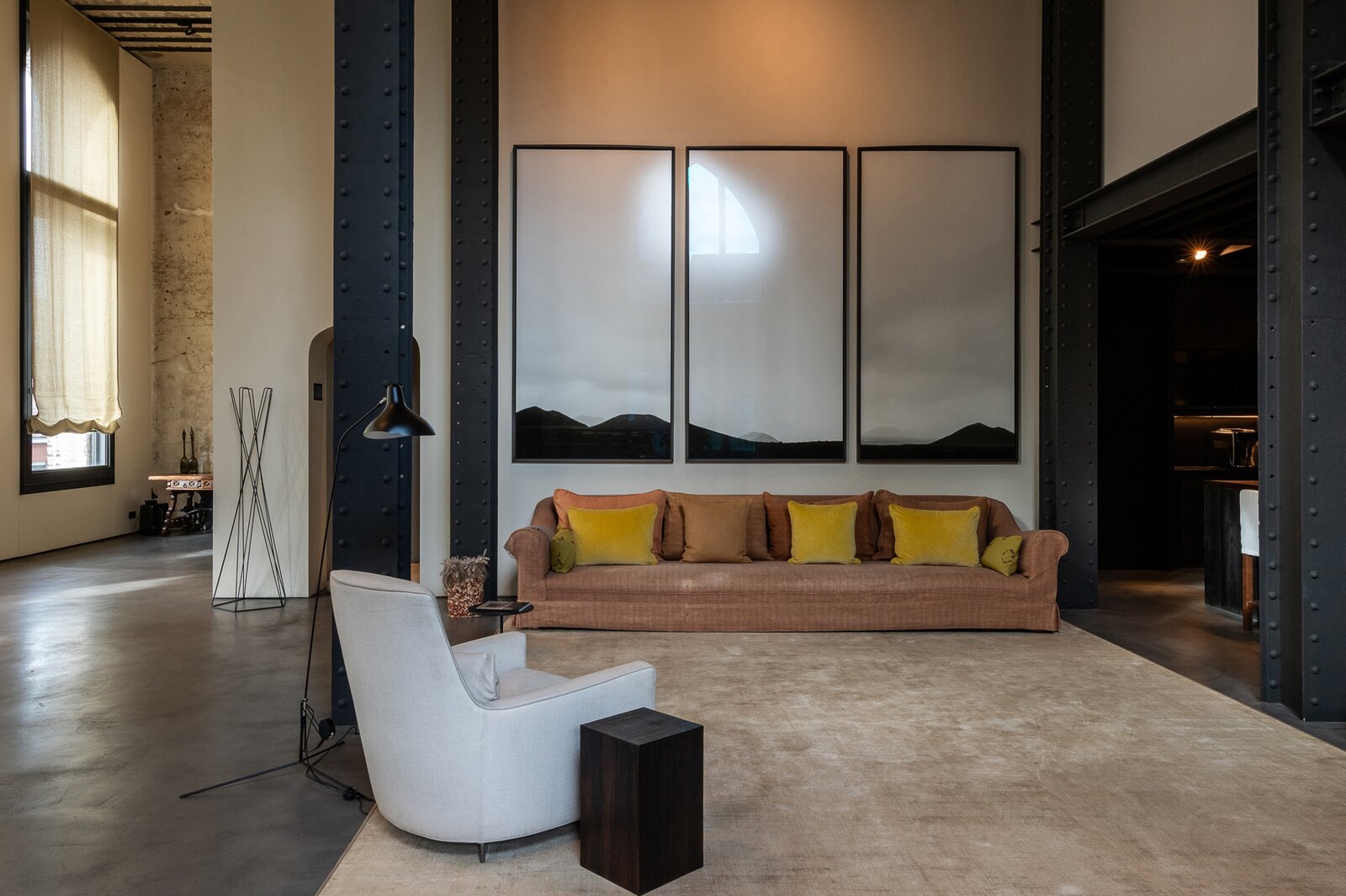De leefruimte, met plafonds tot 6,16 meter hoog, ademt ruimte en sereniteit.