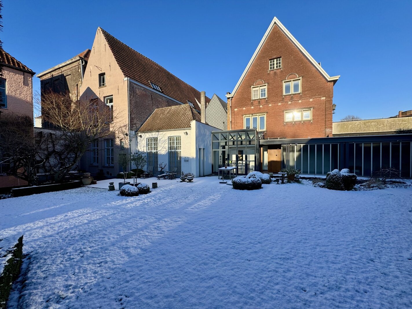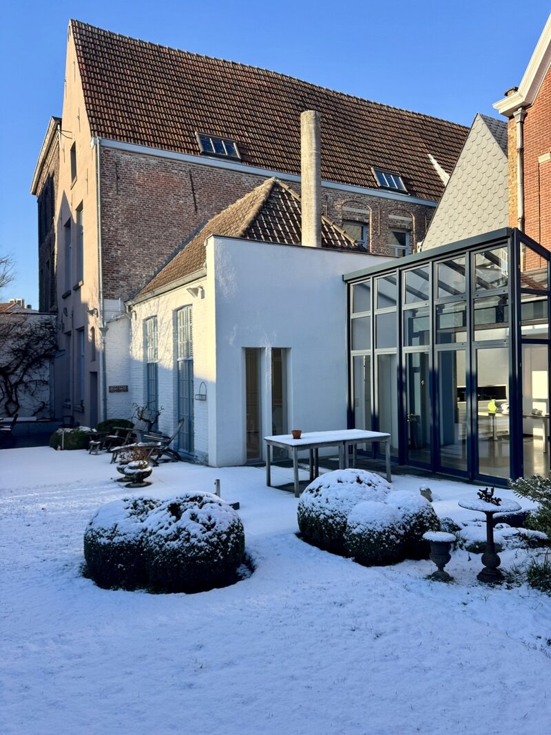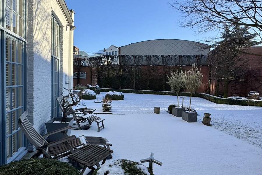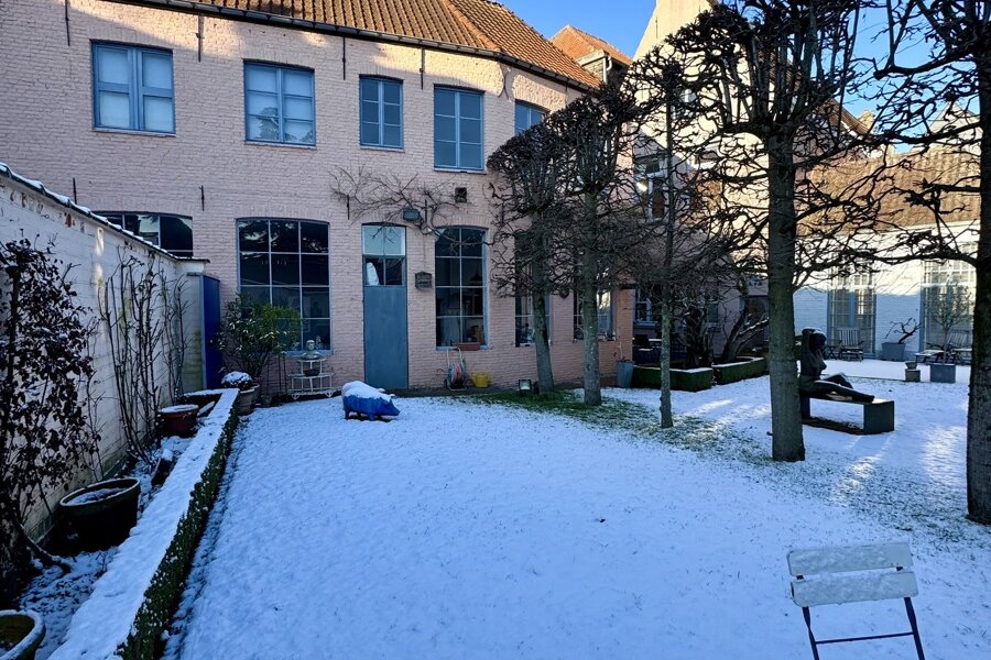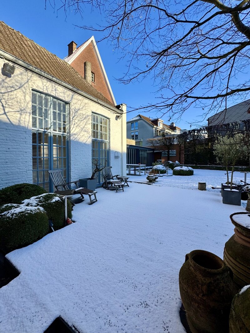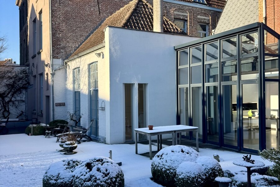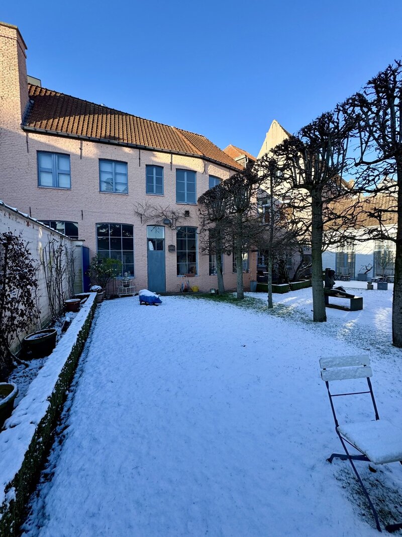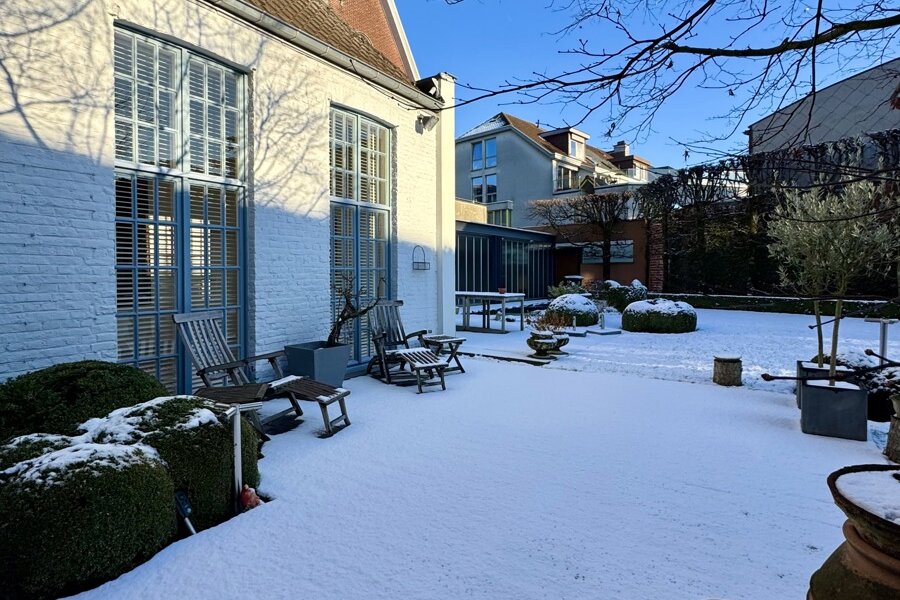 Achteraan het perceel bevindt zich nog een industrieel gebouw in twee bouwlagen: de oorspronkelijke drukkerij. Dit volume biedt een waaier aan mogelijkheden: atelier, bijkomende woonruimte, werkplaats, showroom, hobbyruimte …