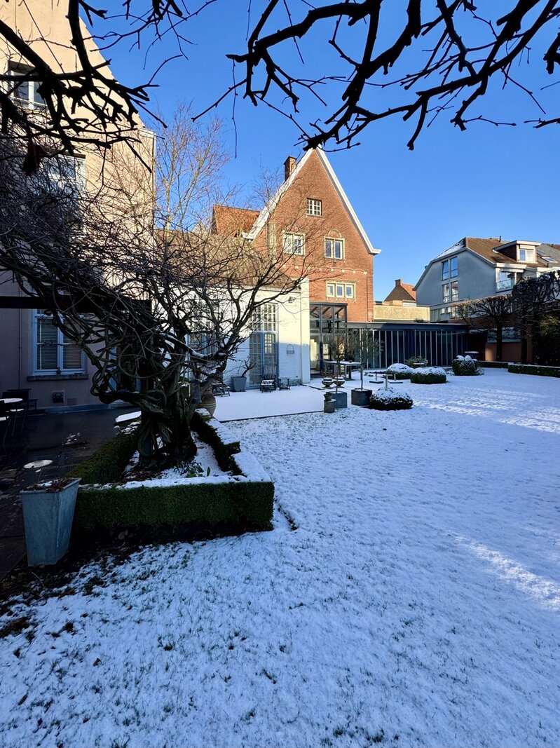 Binnen straalt de woning pure klasse uit dankzij de hoge plafonds, prachtige schouwen, unieke moulures, en authentieke vloeren en parket die doorheen het hele pand bewaard zijn.