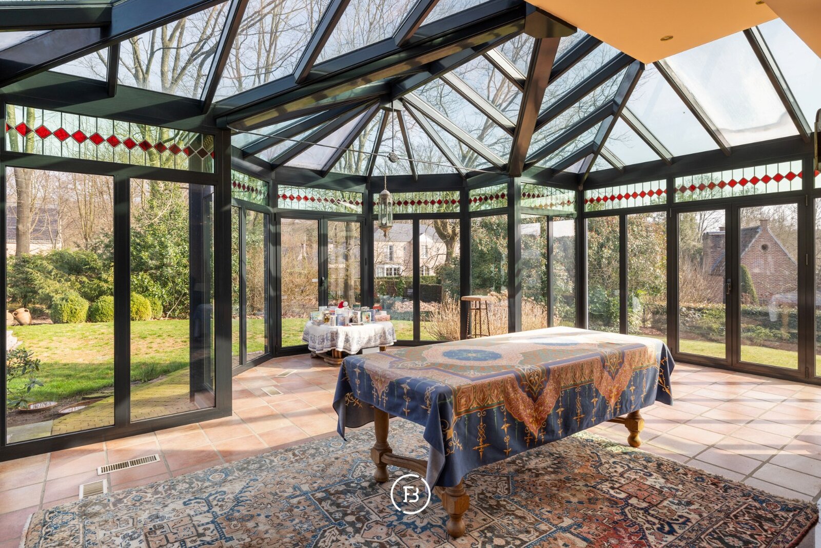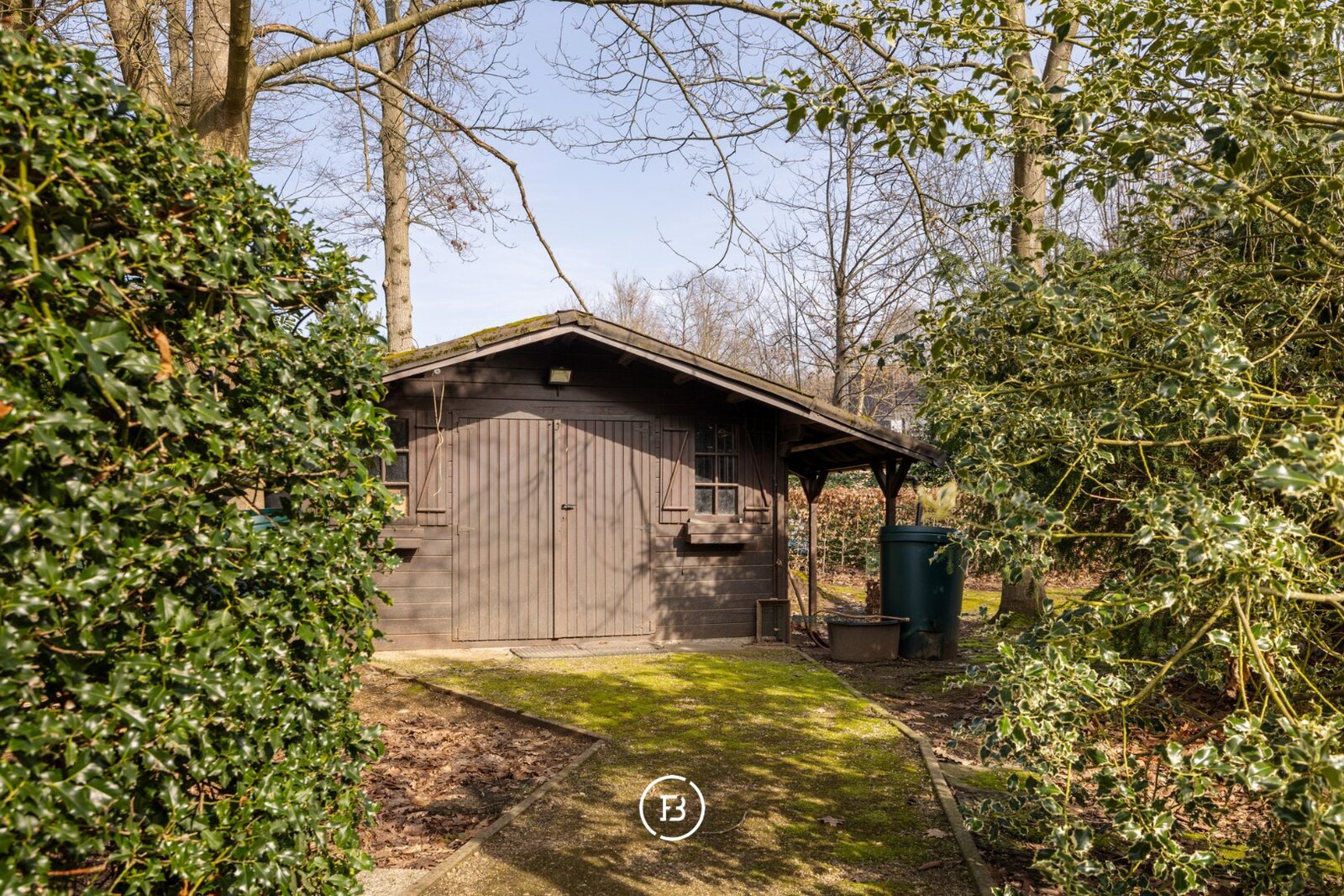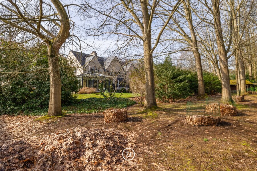 De tuin vormt een groen decor van volgroeide bomen en struiken, met meerdere terrassen en een tuinhuis — een plek waar elk seizoen zijn charme heeft en waar rust en privacy centraal staan.