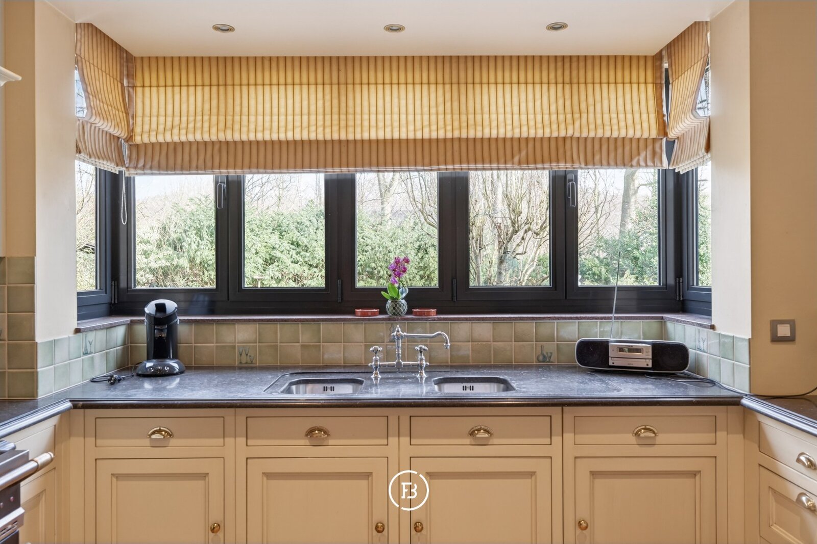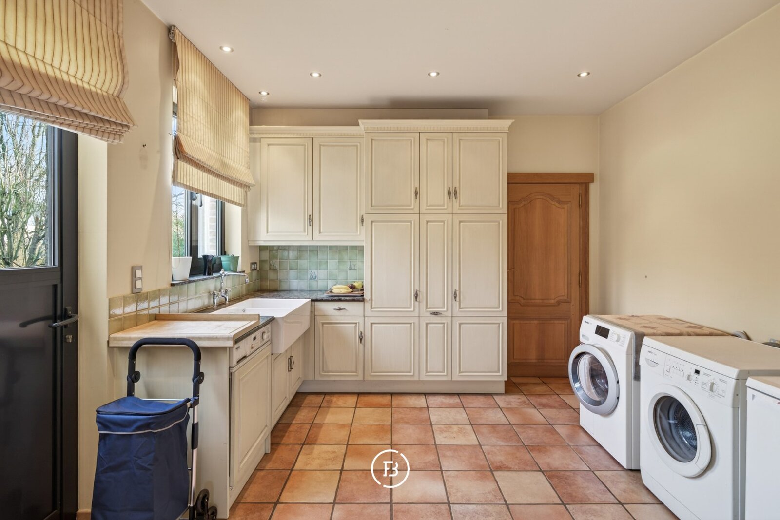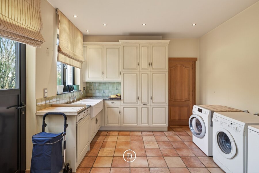De open, volledig geïnstalleerde keuken is een echte blikvanger. Hier bevindt zich een hoogwaardig Lacanche fornuis, geliefd bij kookliefhebbers om zijn authentieke uitstraling. De keuken sluit naadloos aan op een ruime bijkeuken en wasplaats, met directe toegang tot de inpandige garage voor twee wagens.