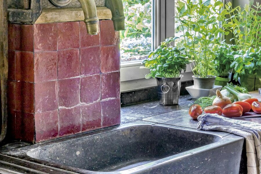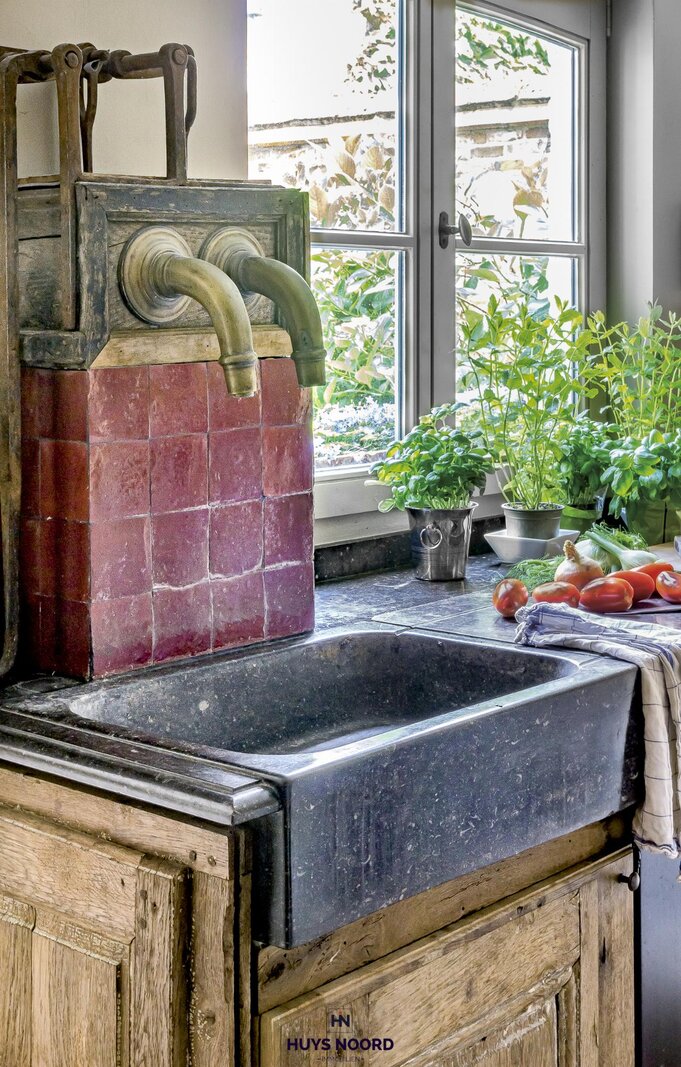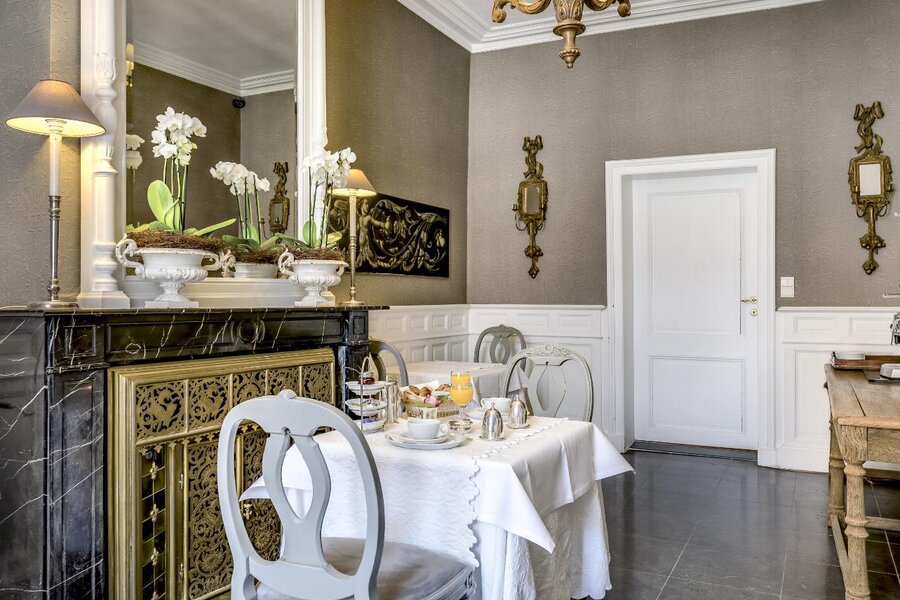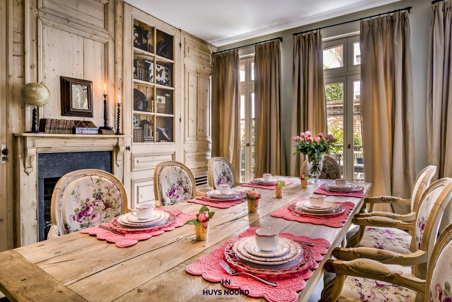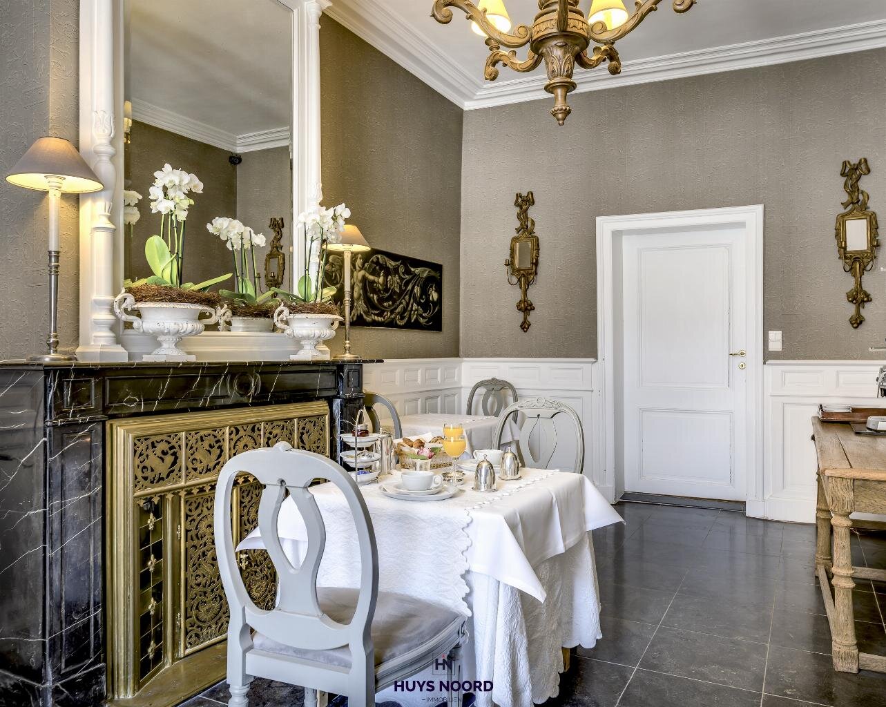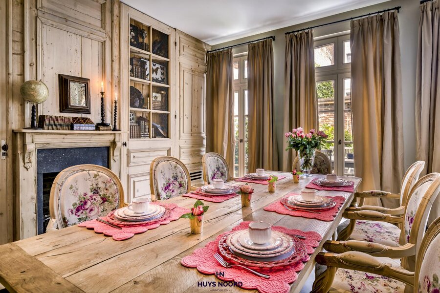 Vervolgens een gezellige eetkamer met zicht op de cosy stadstuin, de ontbijtruimte in Lodewijk XVI-stijl, een fantastisch mooie en praktische keuken, koude berging en het bureel.