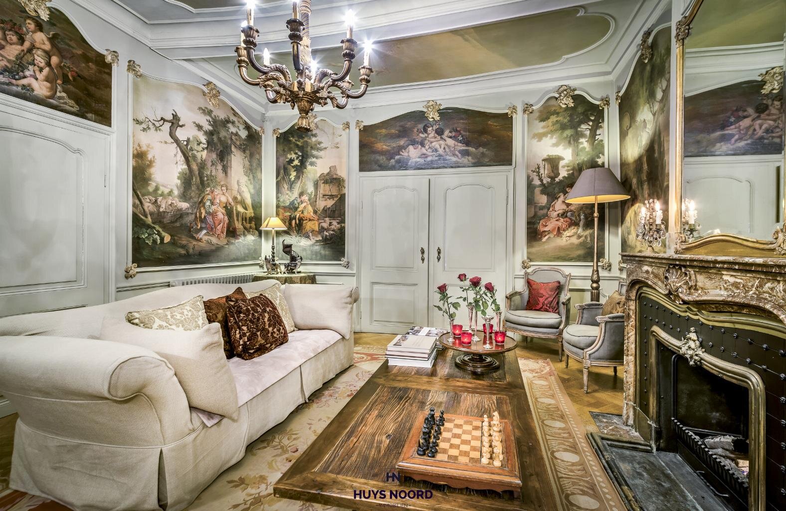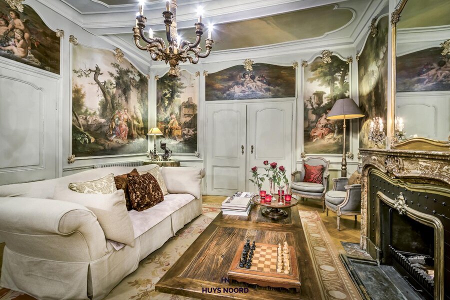 Op het gelijkvloers, via de royale inkomhal met gastentoilet, treft men het salon met haar 18e-eeuwse wanden en plafondschilderijen in Rococo-stijl.
