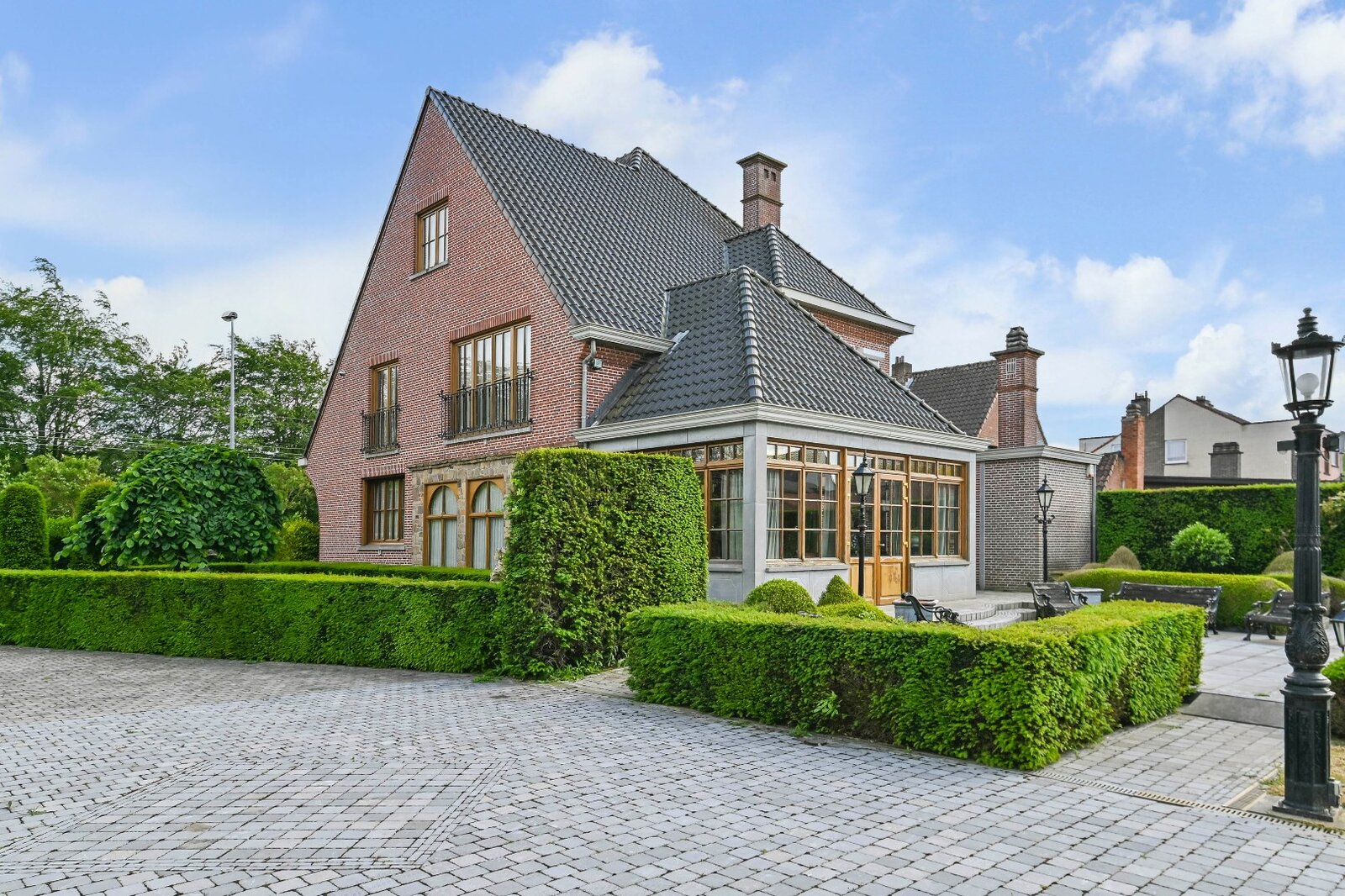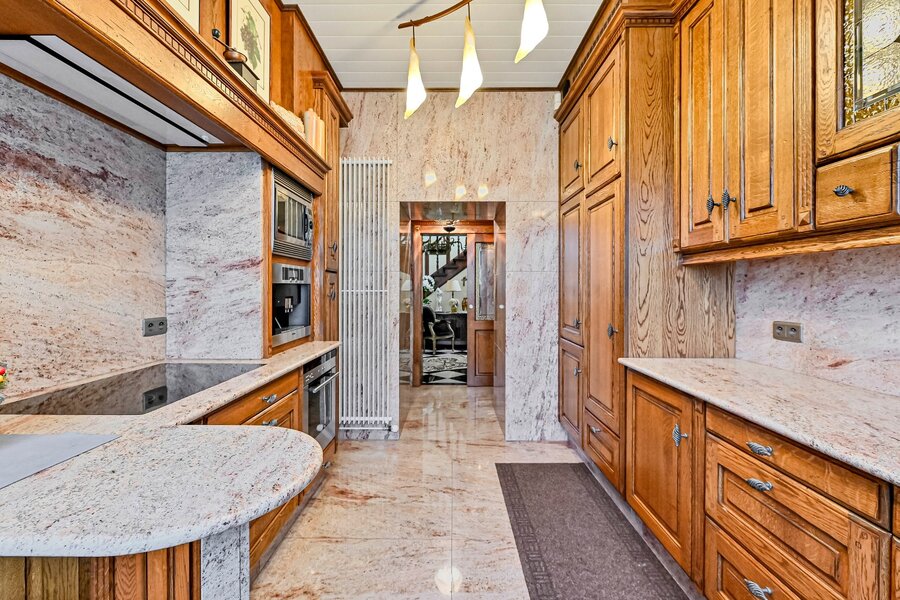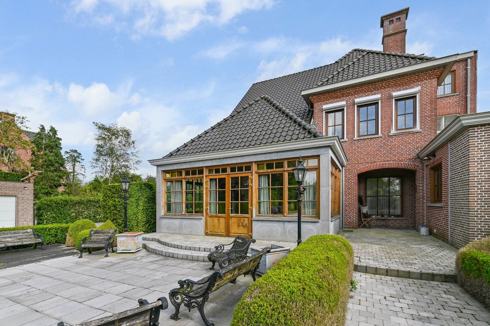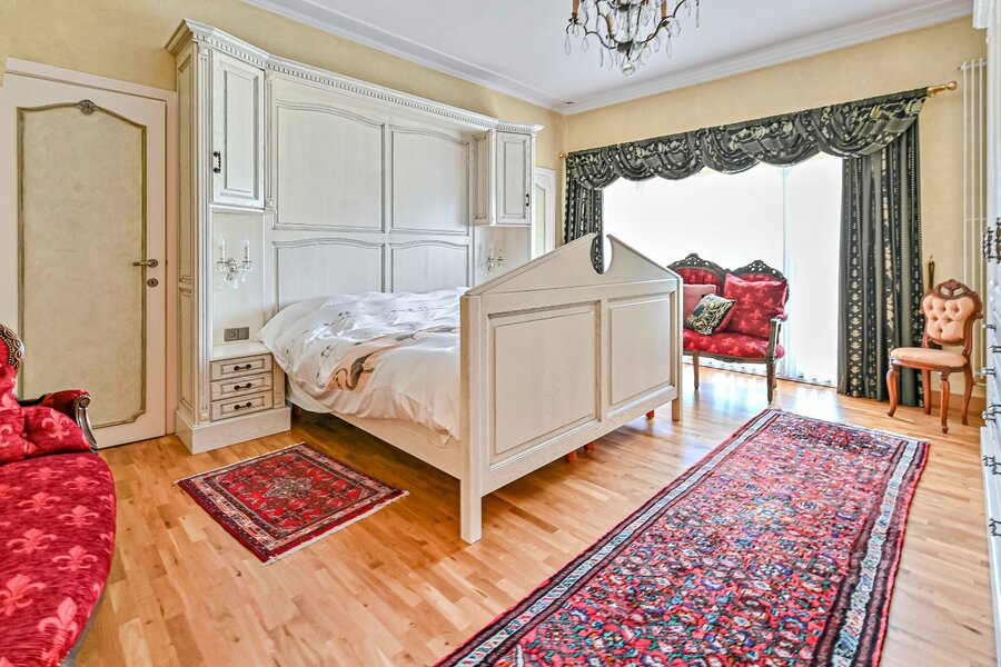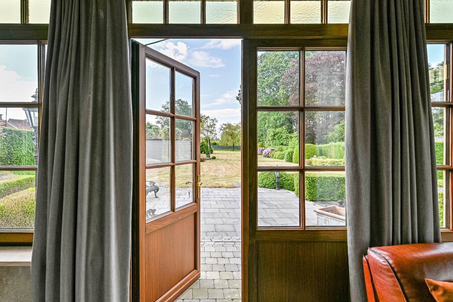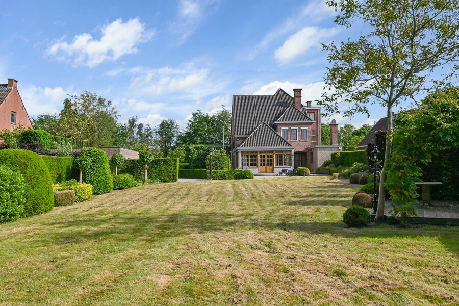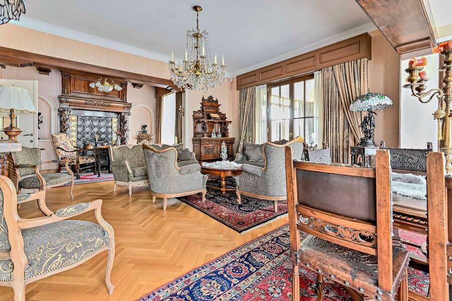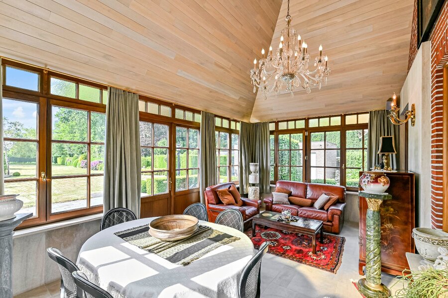 De woonkamer met parket en haardmantel, de lichtrijke uitbouw en de volledig private tuin creëren een oase van rust, vlak bij het stadscentrum. Extra troeven zijn de dubbele garage, multifunctionele bijgebouwen en een wijnkelder.