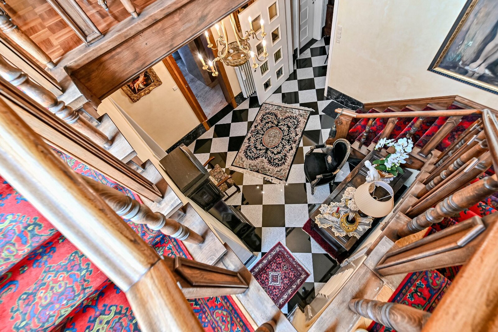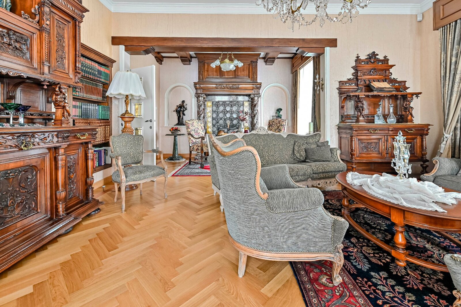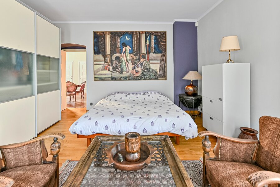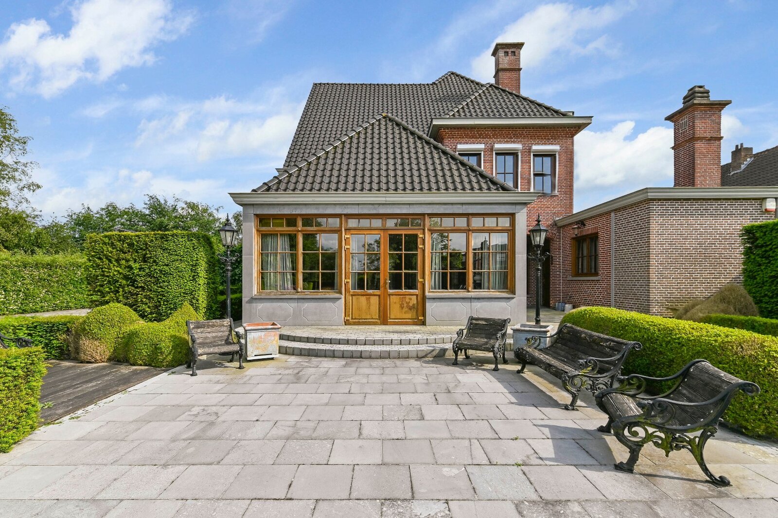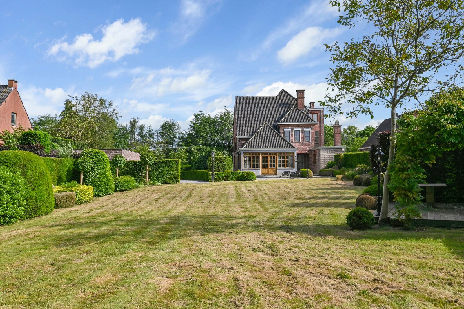 De woonkamer met parket en haardmantel, de lichtrijke uitbouw en de volledig private tuin creëren een oase van rust, vlak bij het stadscentrum. Extra troeven zijn de dubbele garage, multifunctionele bijgebouwen en een wijnkelder.