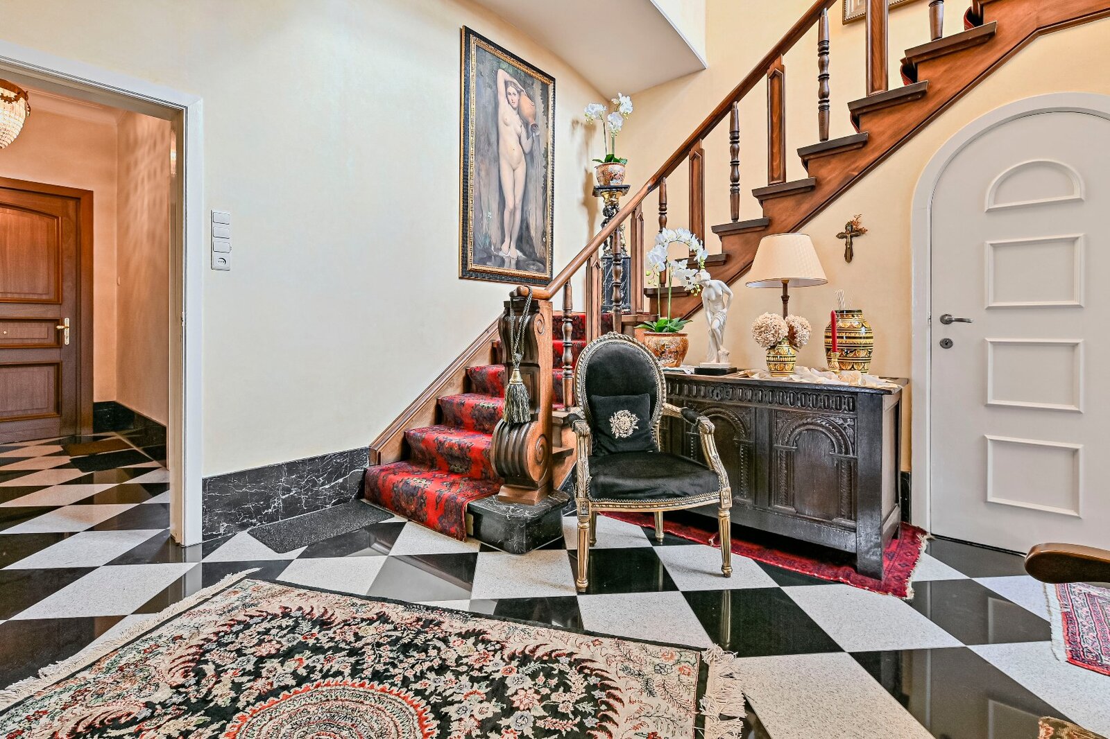 Deze elegante villa uit 1951 combineert authentieke charme met hedendaags wooncomfort. De indrukwekkende inkomhal, sierlijke trap en originele tegels ademen klasse.