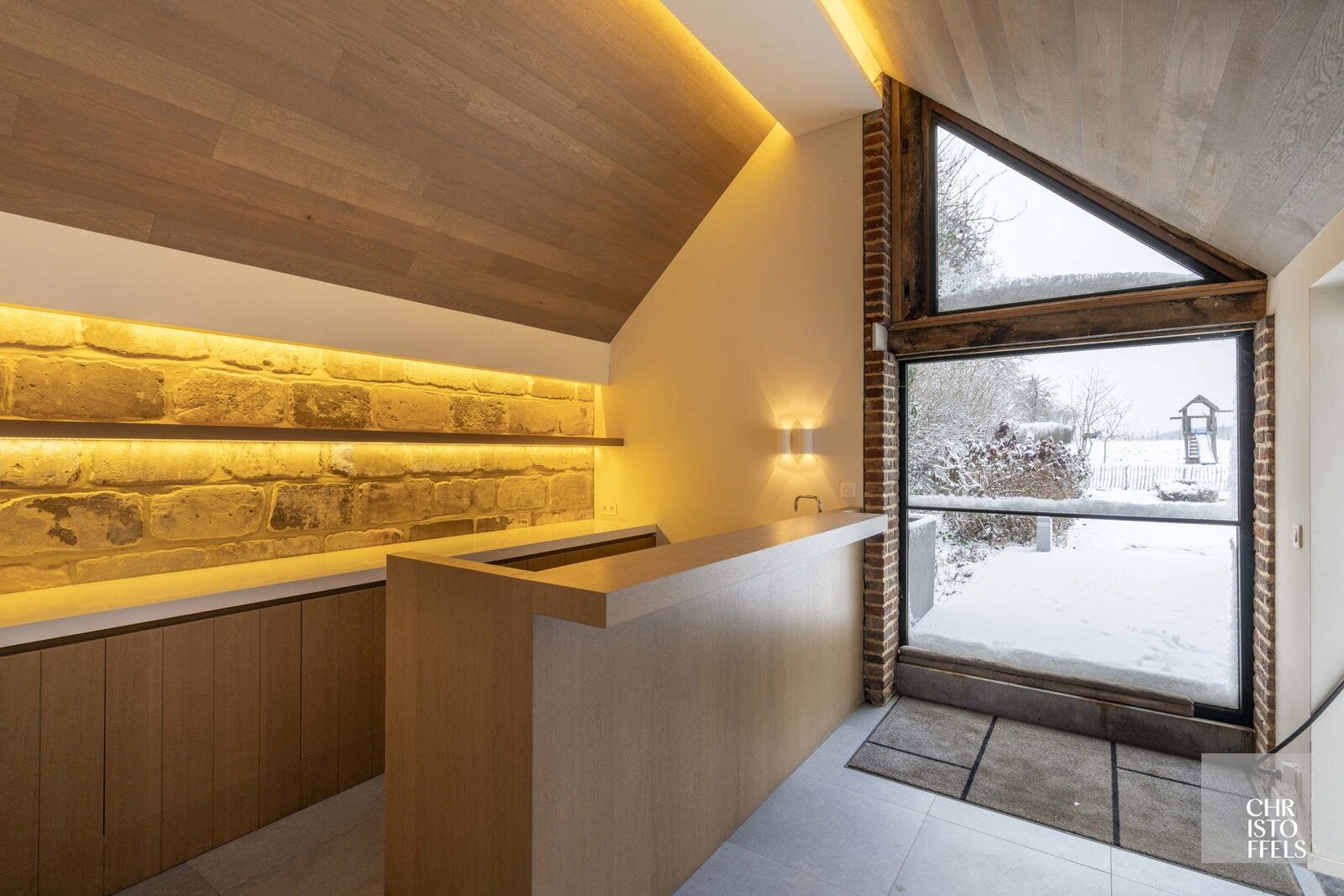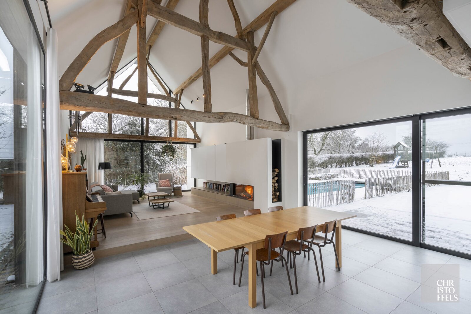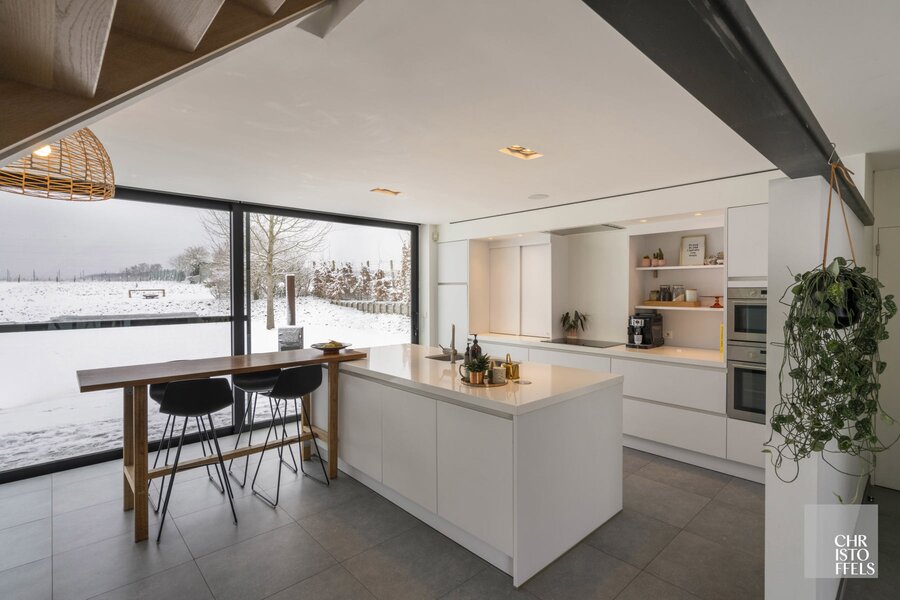 Het leefgedeelte straalt ruimte en licht uit. De moderne, volledig uitgeruste keuken met kookeiland vormt het hart van de woning en beschikt over hoogwaardige toestellen zoals een koelkast, oven, microgolfoven, inductiekookplaat, dampkap en vaatwasser. Aansluitend bevindt zich de eethoek en de zithoek met een open haard op hout. De plafonds lopen hier open tot in de nok, waardoor de originele dakstructuur volledig zichtbaar blijft en een prachtige verbinding ontstaat met de kantoorruimte op de verdieping.