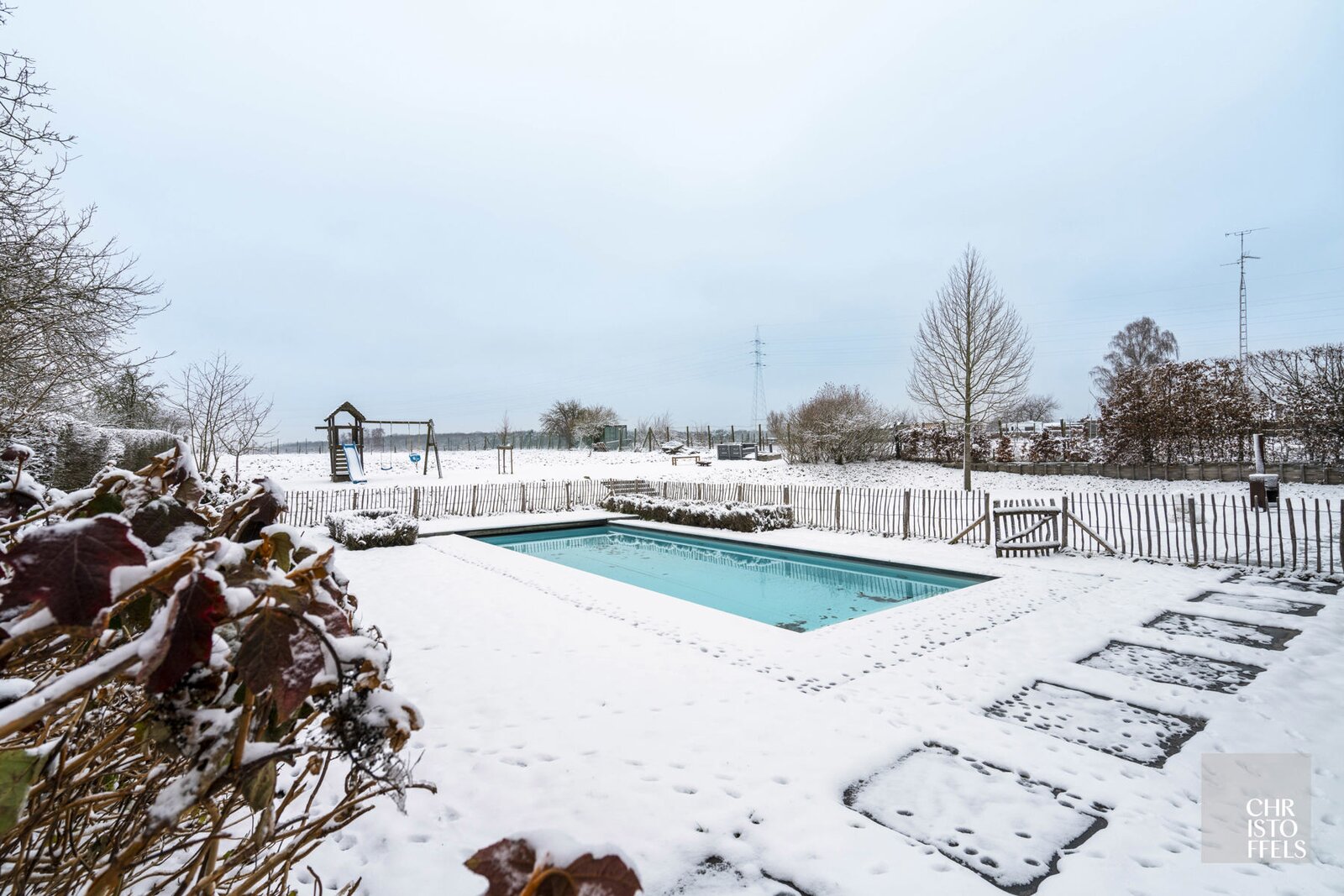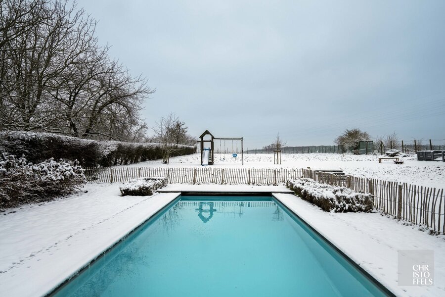 Buiten geniet u van een rustig gelegen tuin met een vrij en open uitzicht over de omliggende weilanden. Het verwarmde buitenzwembad van 10 x 4 meter, uitgerust met zoutelektrolyse, een solarscherm én een aparte warmtepomp, vormt samen met de verschillende terrassen een uitnodigende plek om in alle rust te ontspannen.