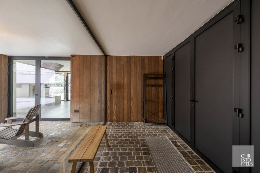 De hoeve is opgebouwd rond een sfeervolle, beschutte binnenkoer die meteen bij het binnenkomen tot de verbeelding spreekt. De inkomhal, met panoramisch zicht op deze binnenkoer, beschikt over een gastentoilet en vestiaire en vormt de elegante spil van de woning. Verder zijn er een dubbele inpandige garage en ruime berging die zorgen voor praktisch comfort.