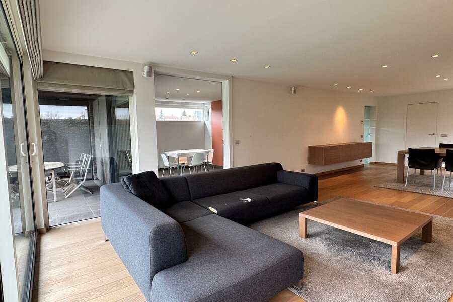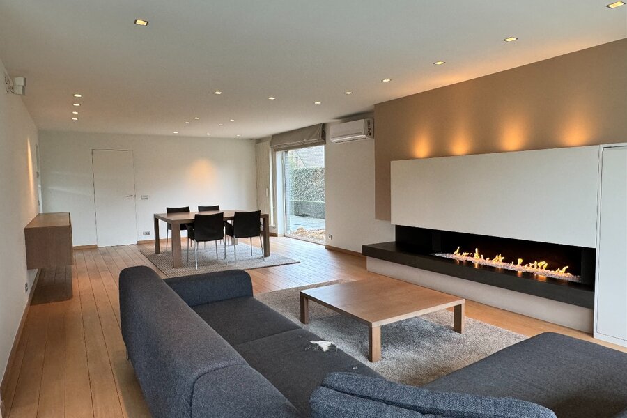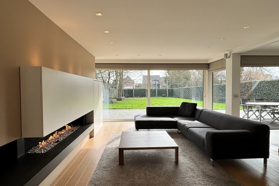 De leefruimte is lichtrijk en biedt dankzij de grote raampartijen een aangenaam zicht op de tuin. De massieve parket zorgt voor een warme uitstraling, terwijl de open gashaard een sfeervol accent toevoegt.