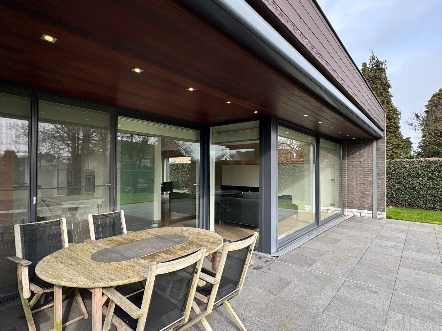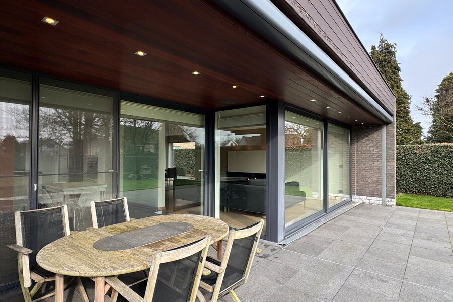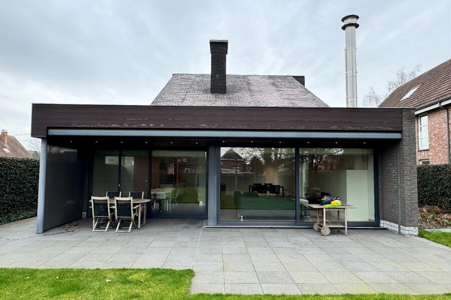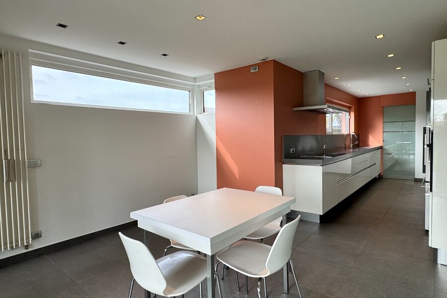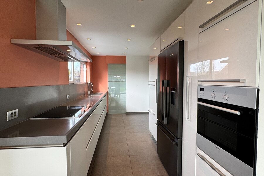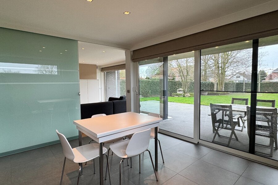 De keuken sluit aan op de leefruimte en is praktisch ingericht. Het schuifraam geeft toegang tot het overdekte terras, waardoor u in elk seizoen comfortabel buiten kan zitten. Een bijkomende zijdeur zorgt voor een extra verbinding met de tuin en oprit.