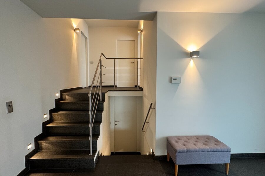 Via de zijkant betreedt u de inkomhal, die de verschillende niveaus van de woning met elkaar verbindt. Hier vindt u het gastentoilet met lavabo, de trap naar de kelderverdieping en de trap naar het tussenniveau.